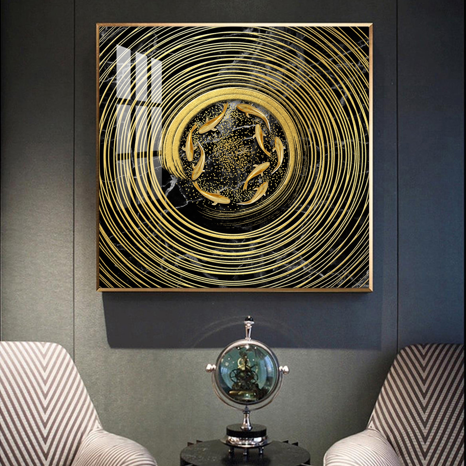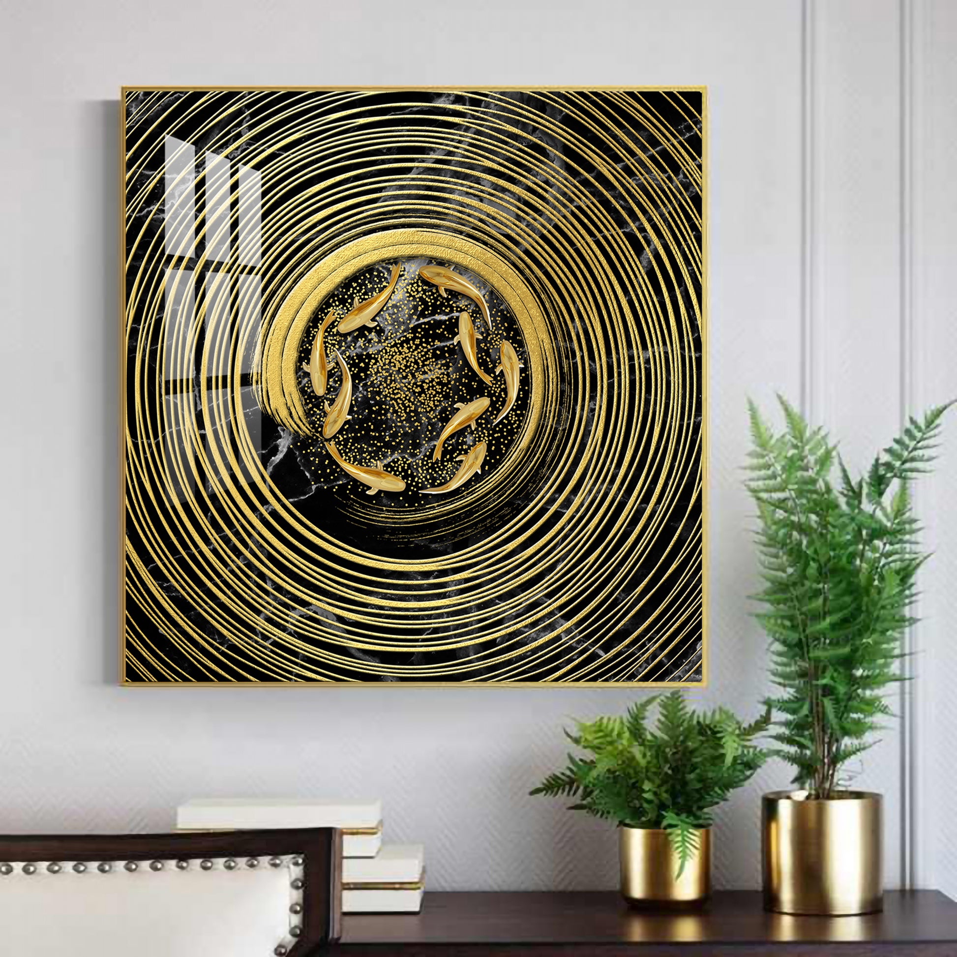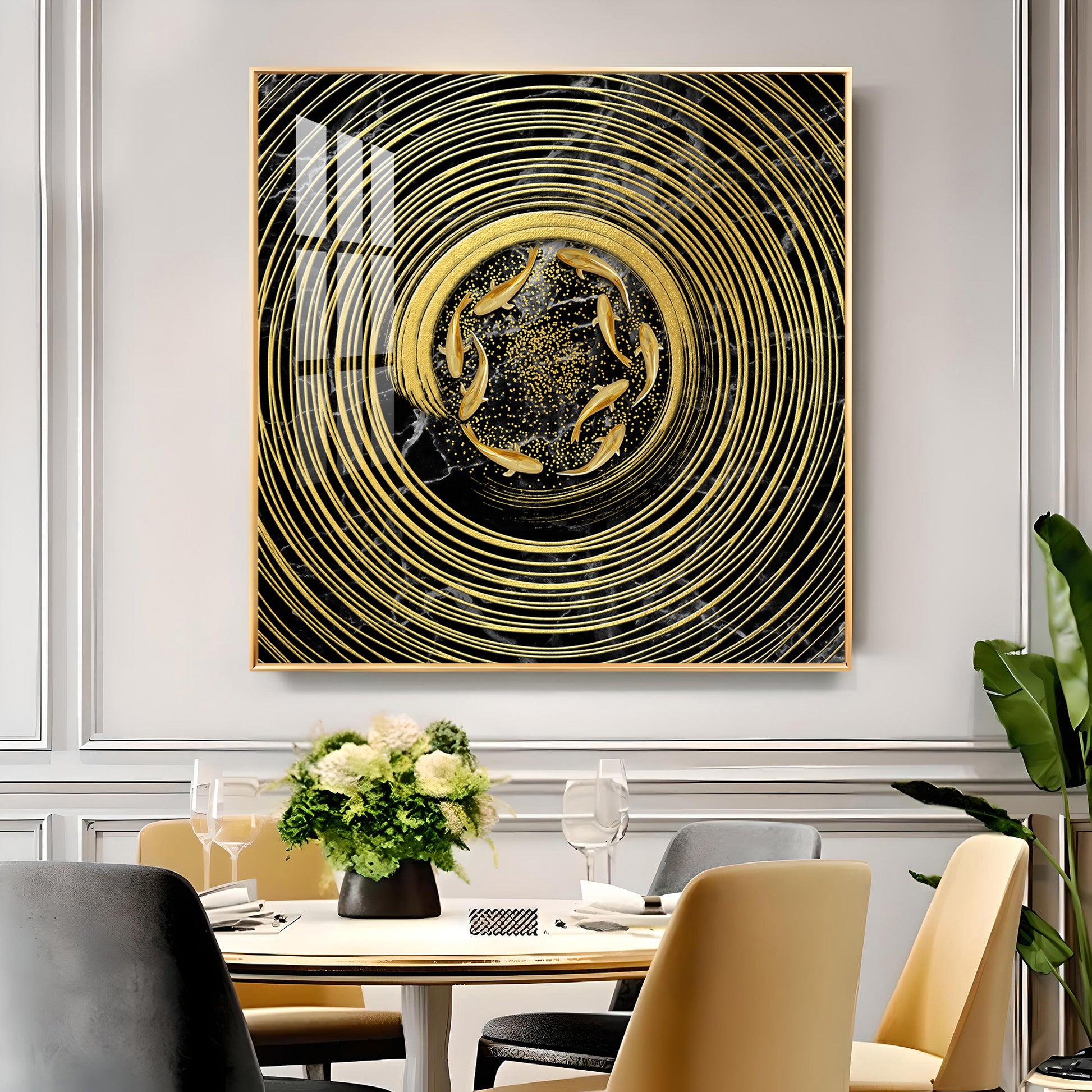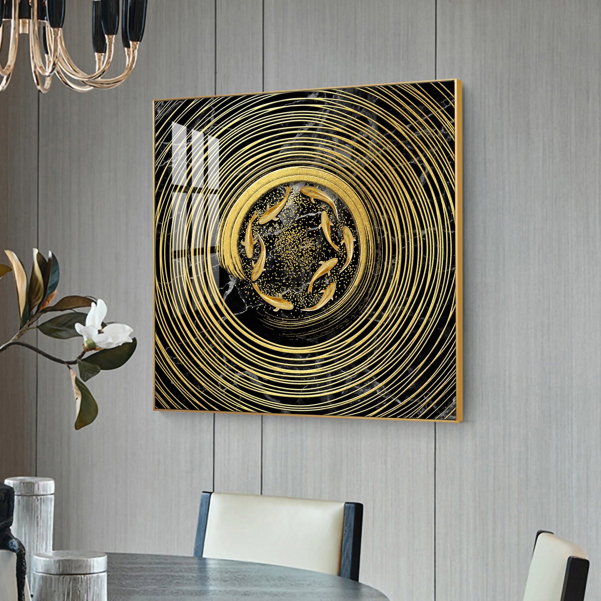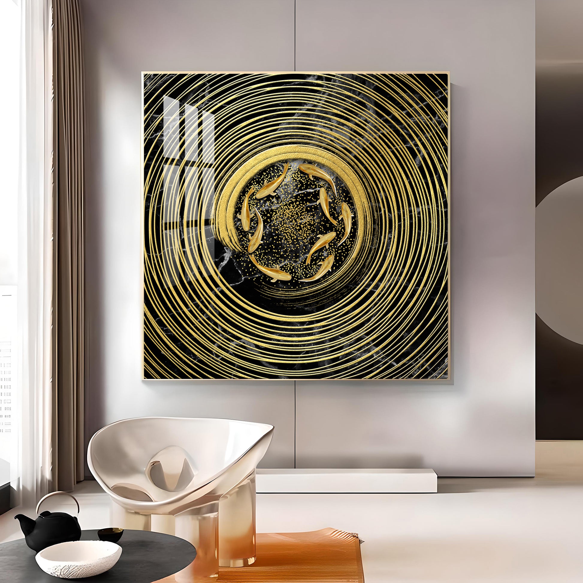 Noir & Gold Fish Glass Finish Square Wall Art