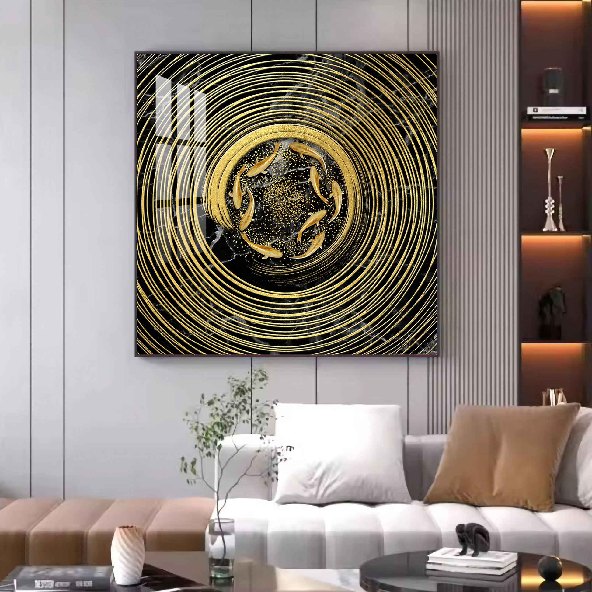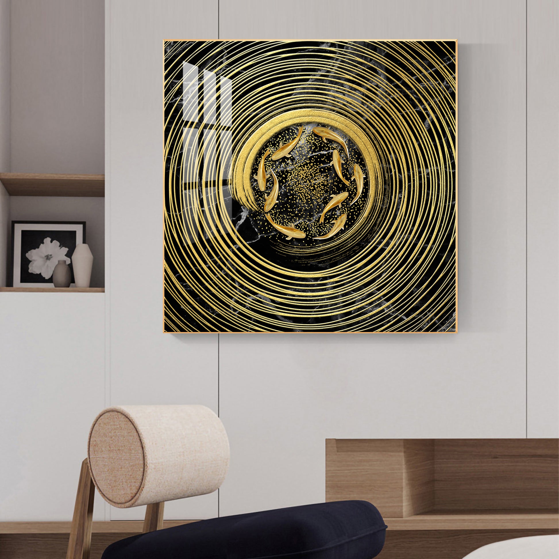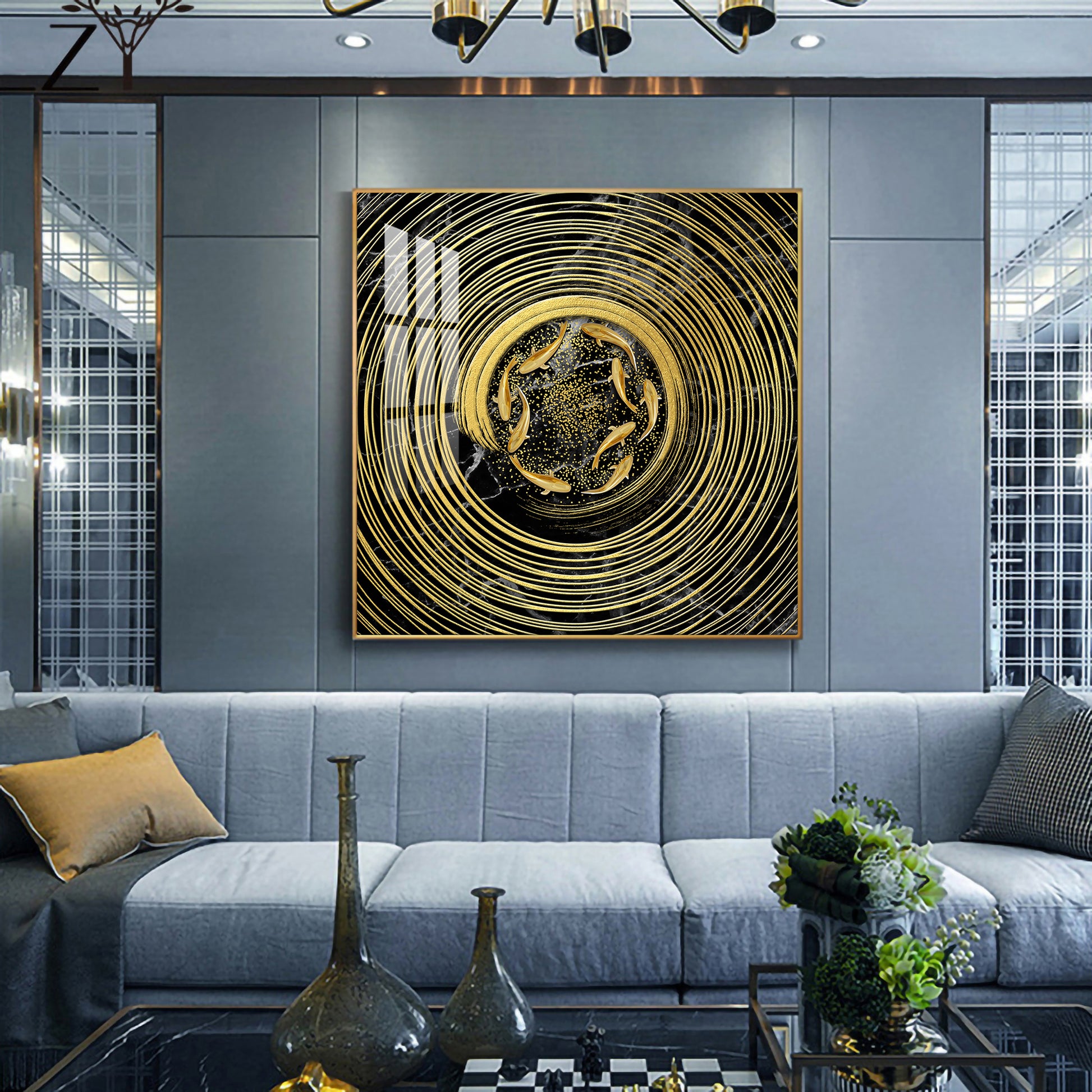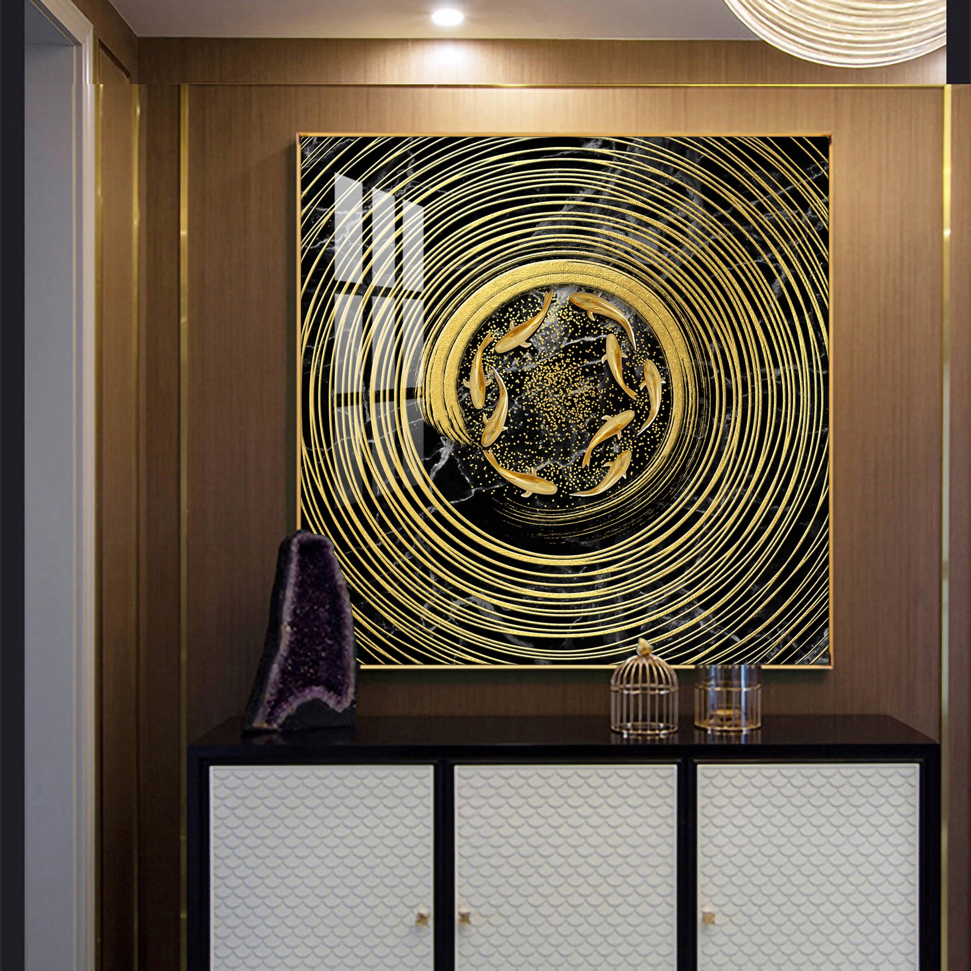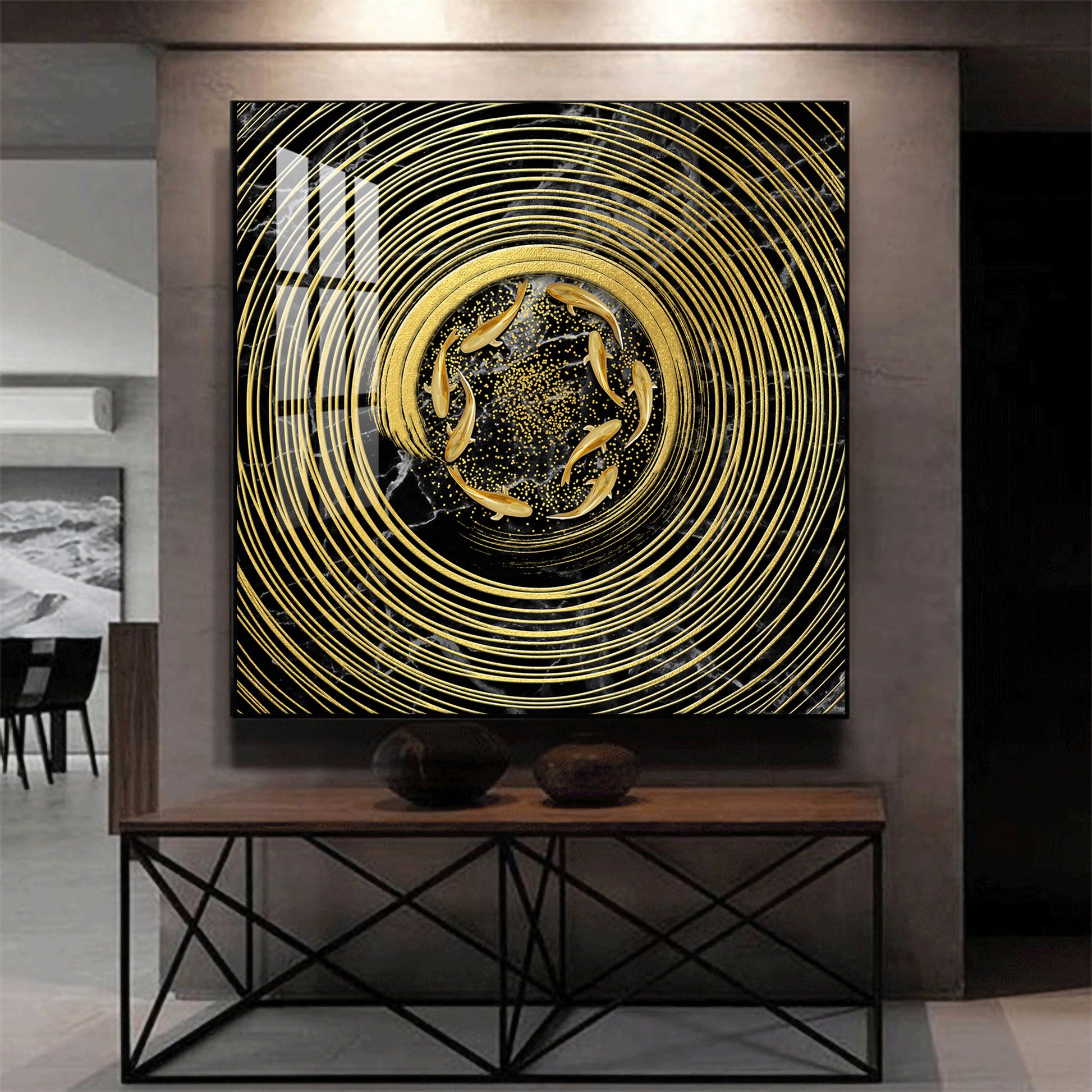 Noir & Gold Fish Glass Finish Square Wall Art