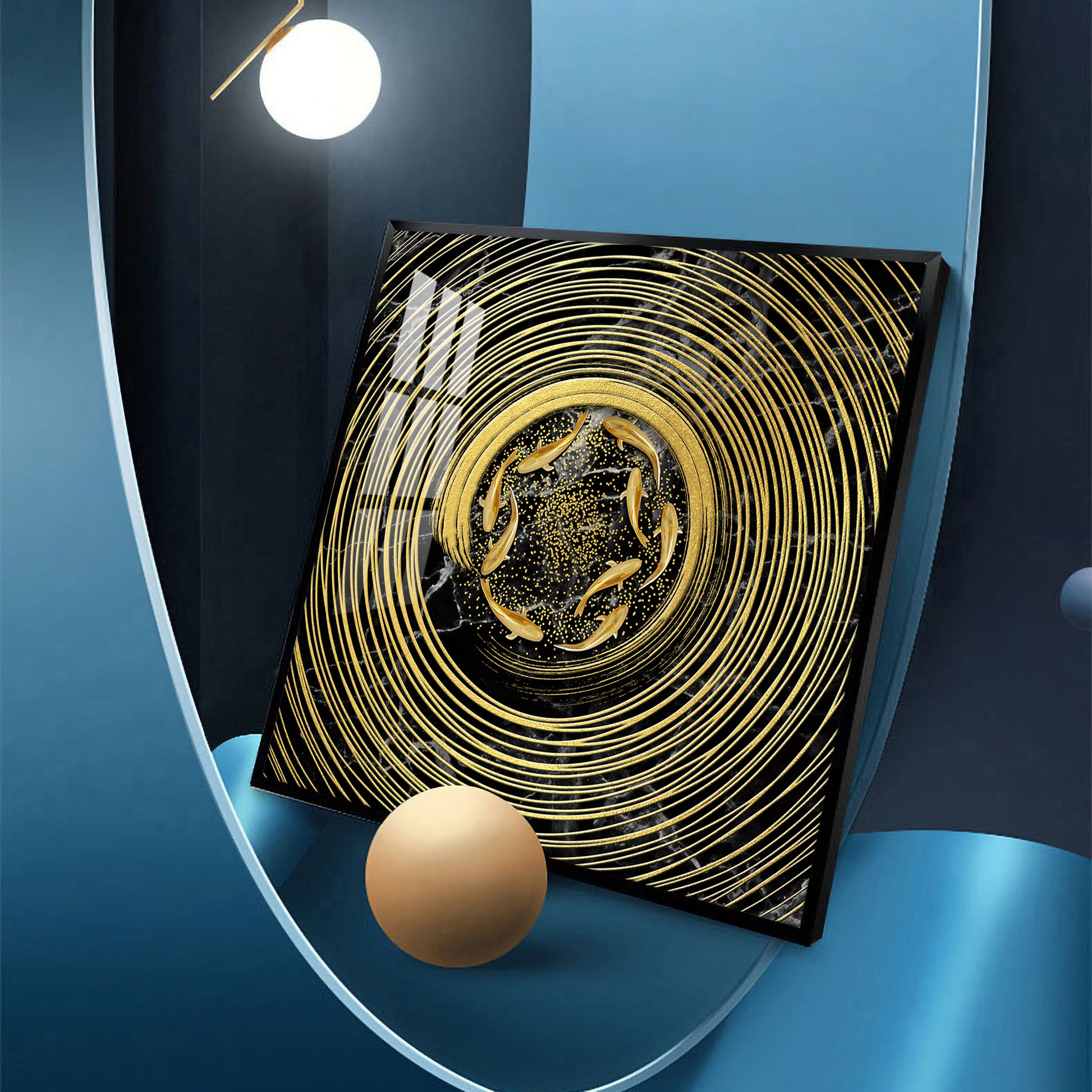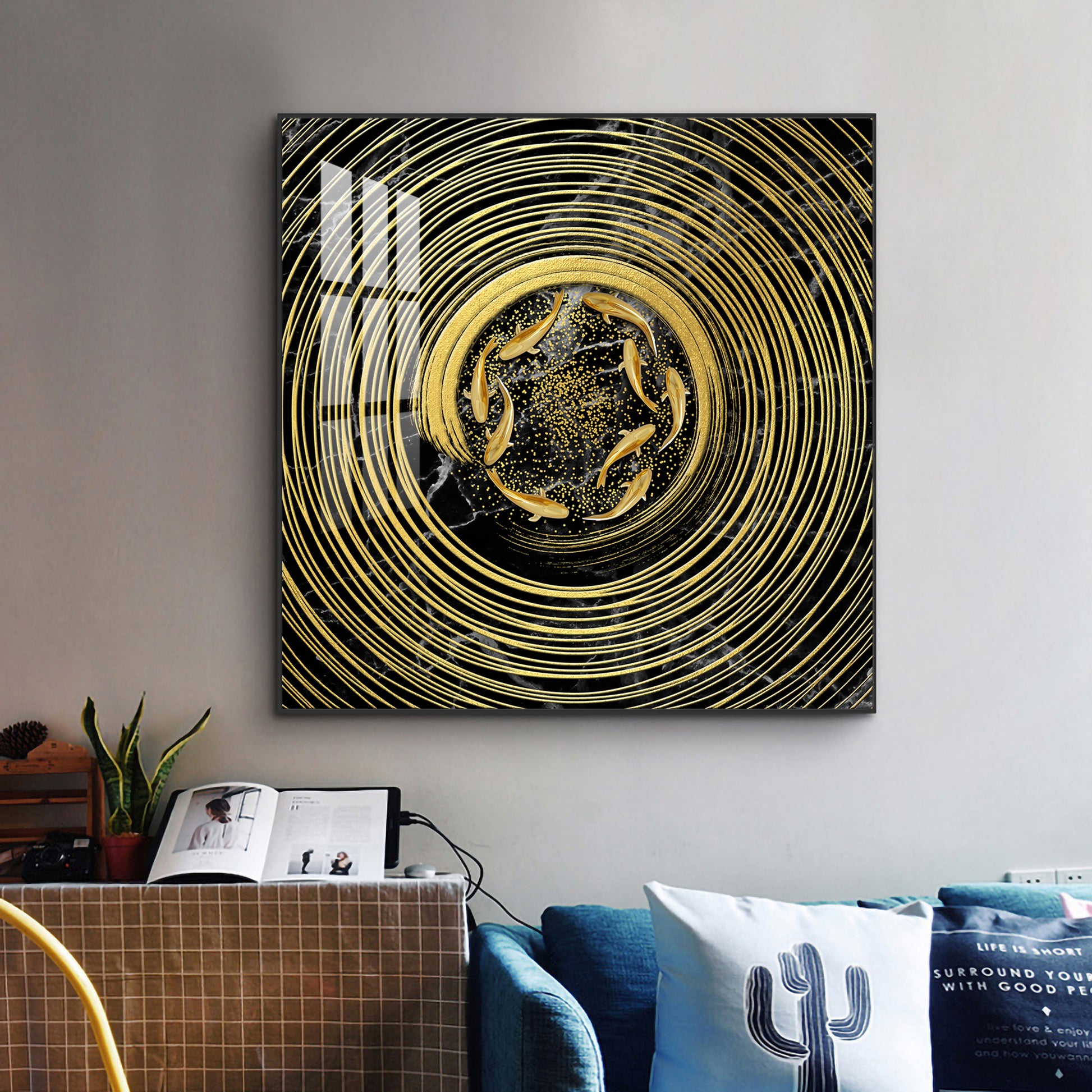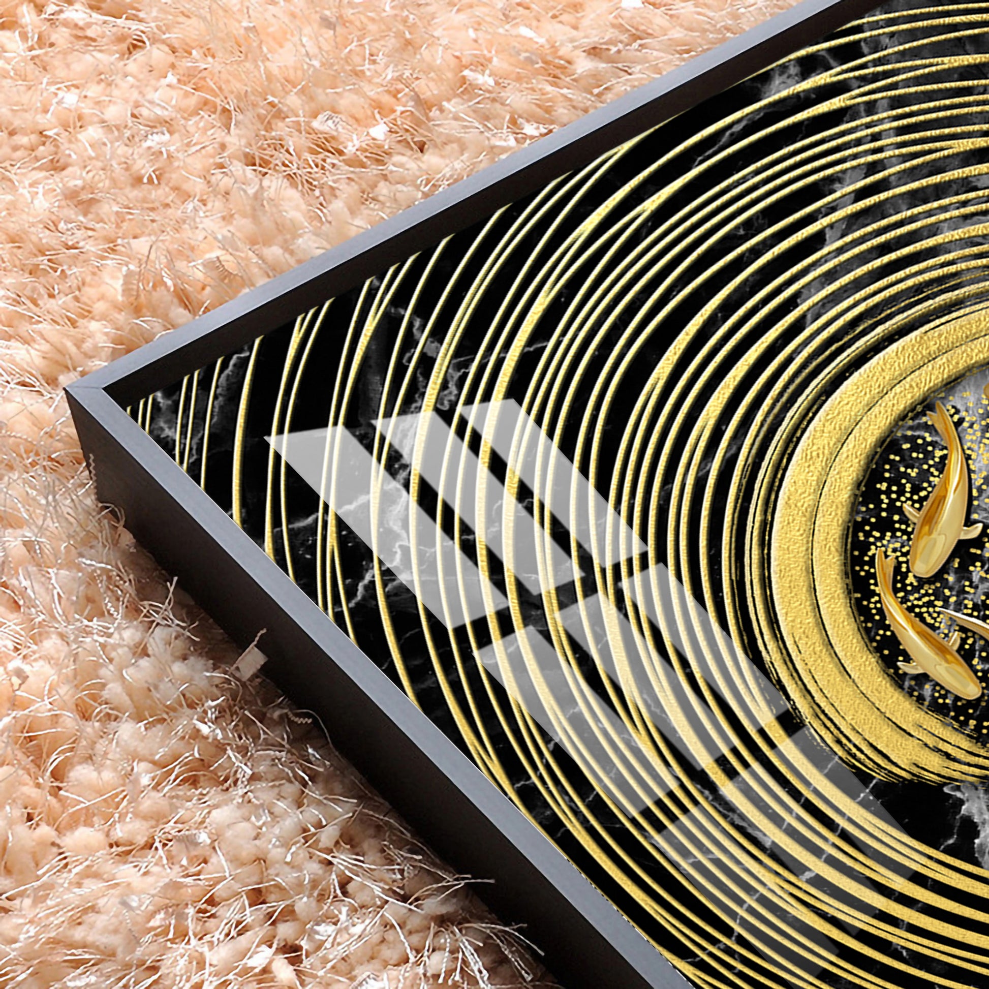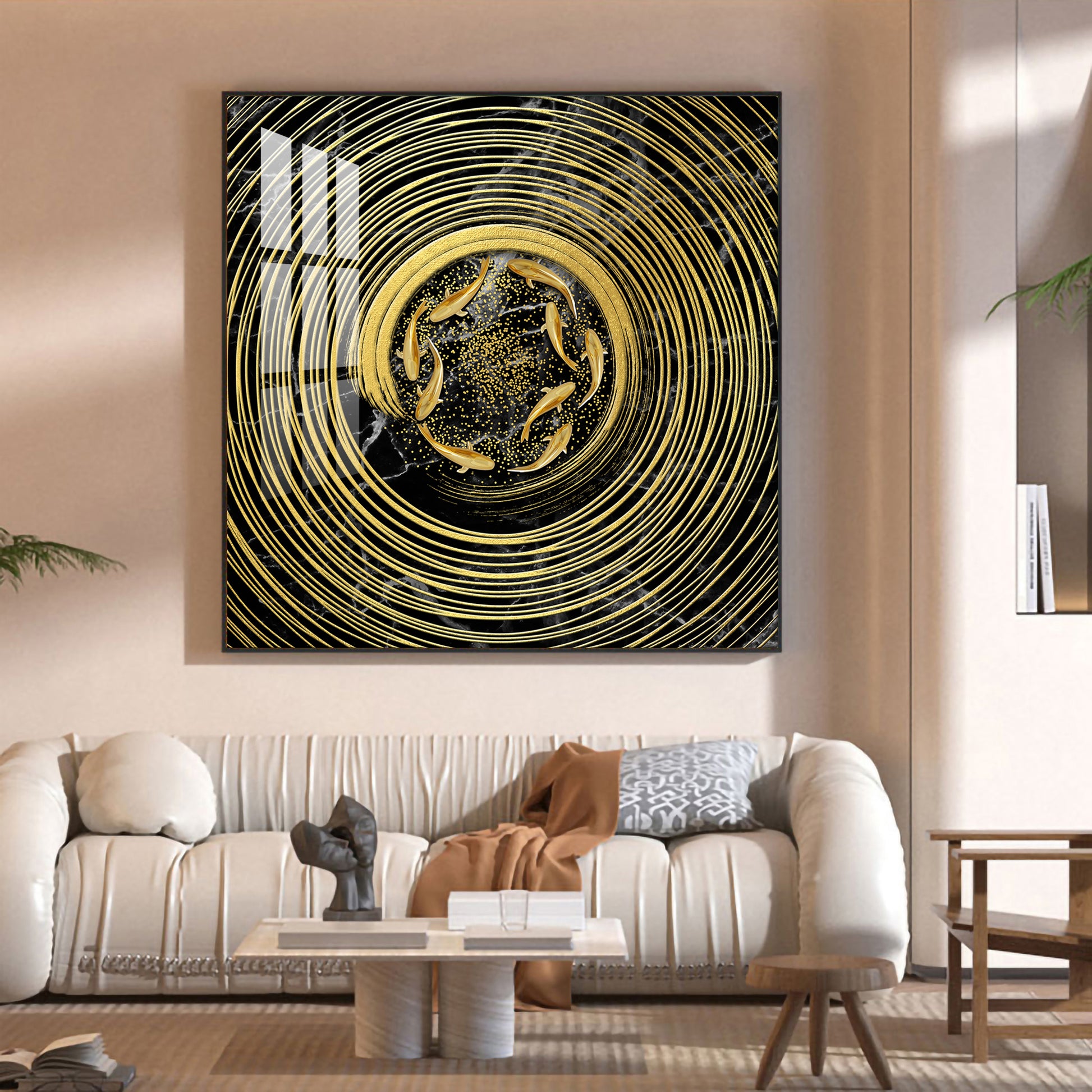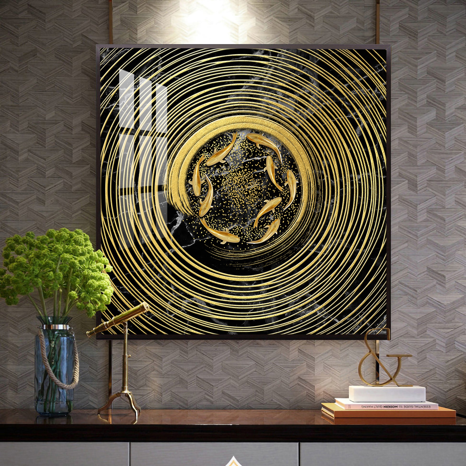 Noir & Gold Fish Glass Finish Square Wall Art