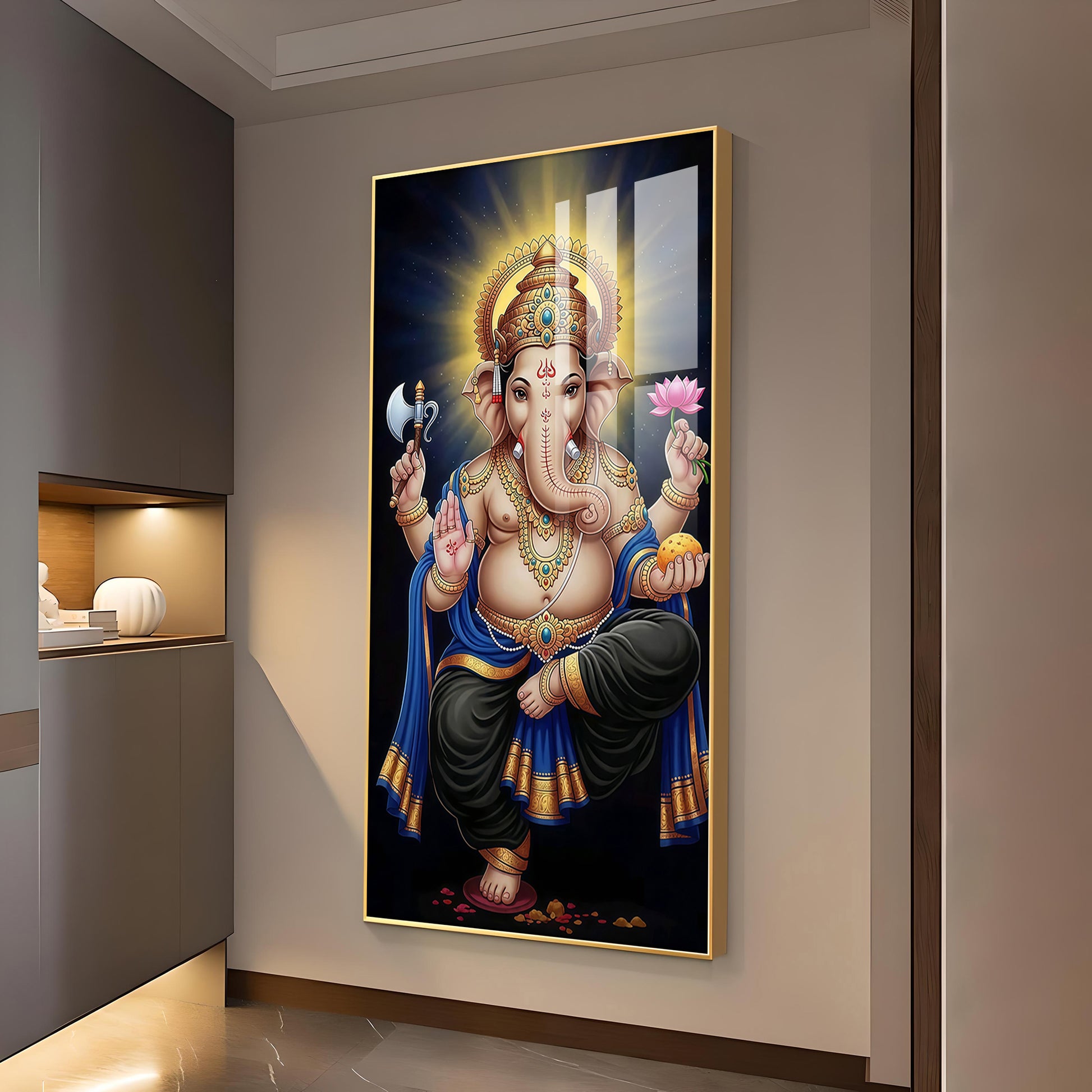 Om Gan Ganpataye Glass Finish Vertical Wall Art