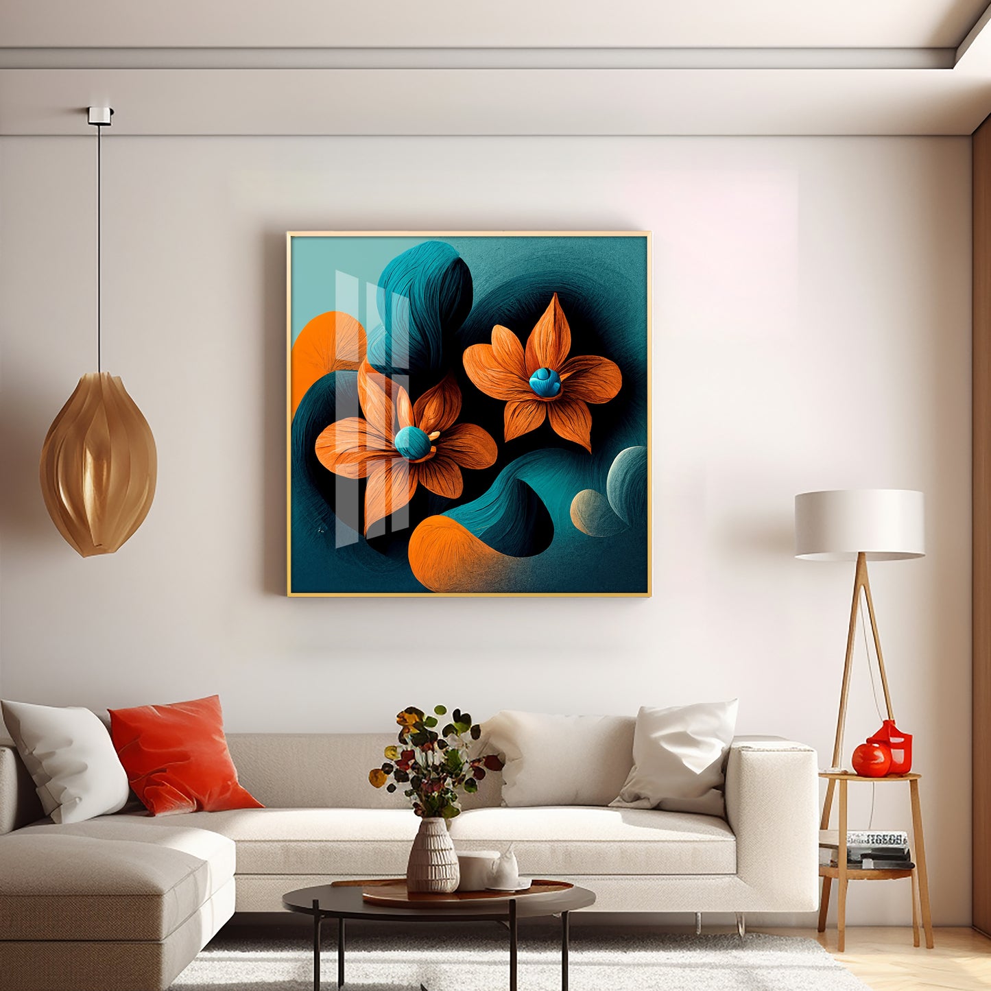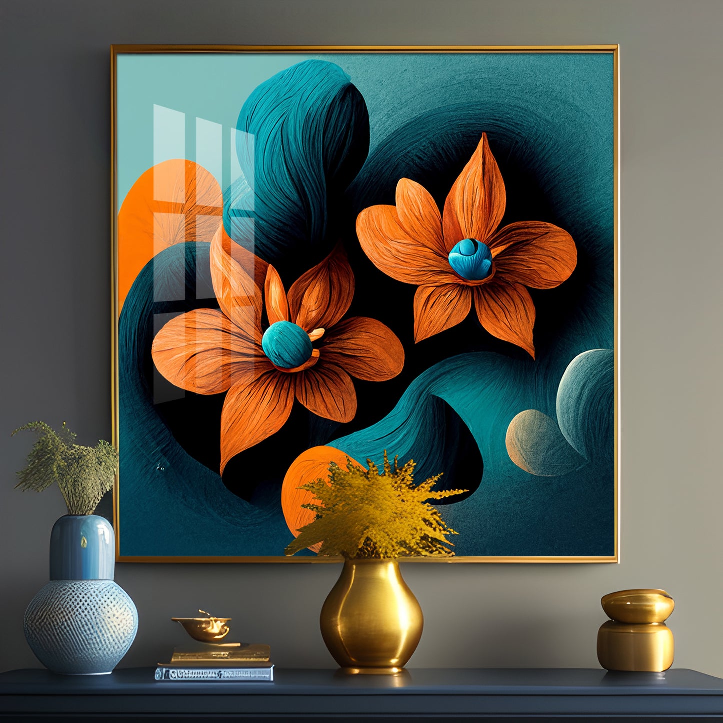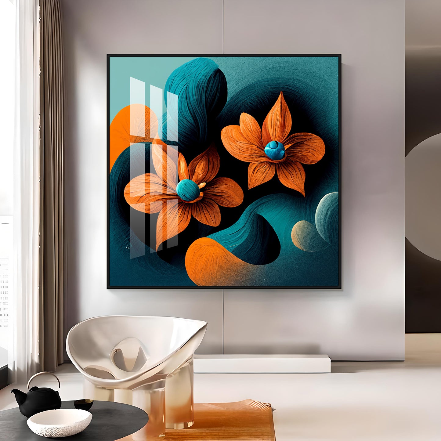 Orange and Blue Blossom Fusion Glass Finish Square Wall Art