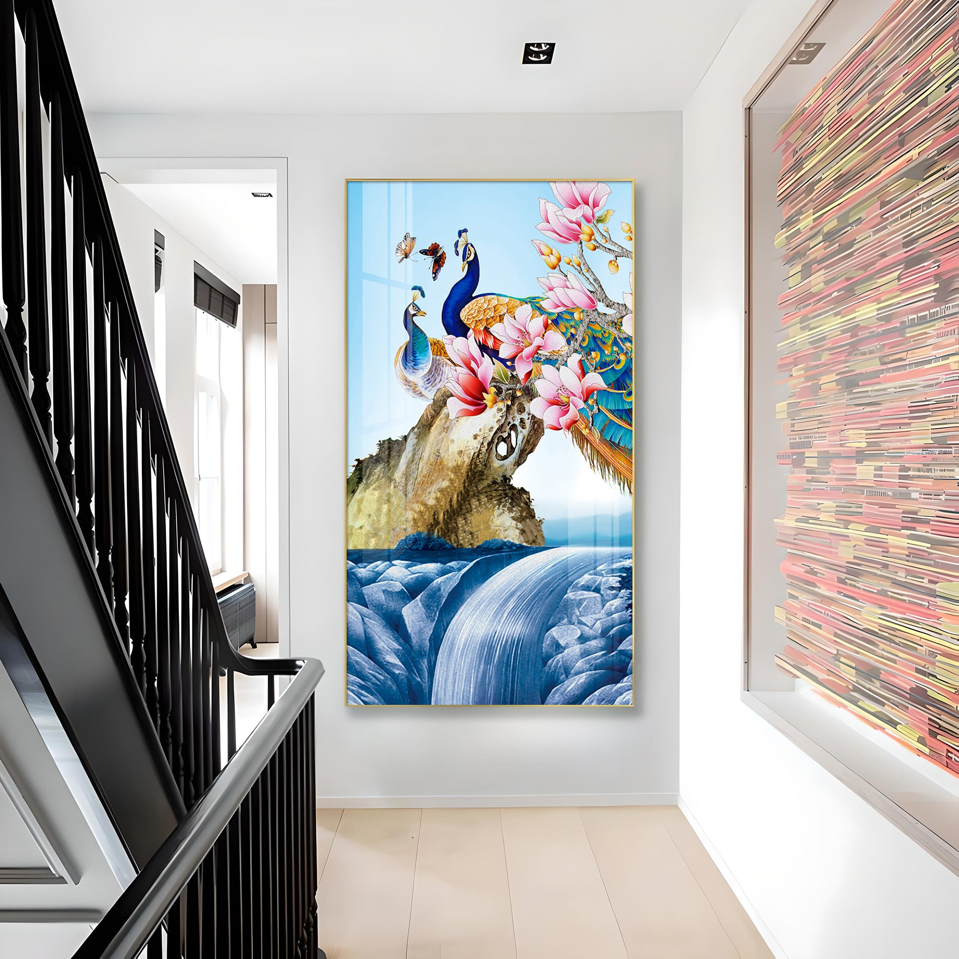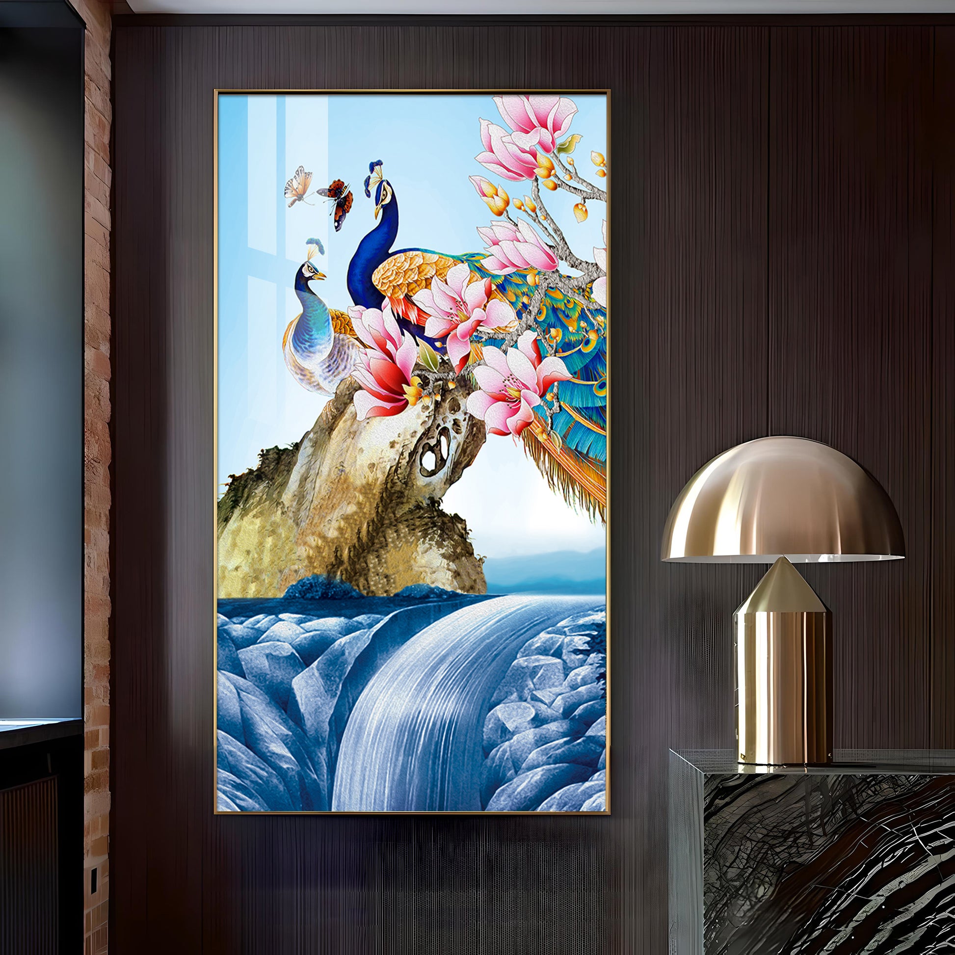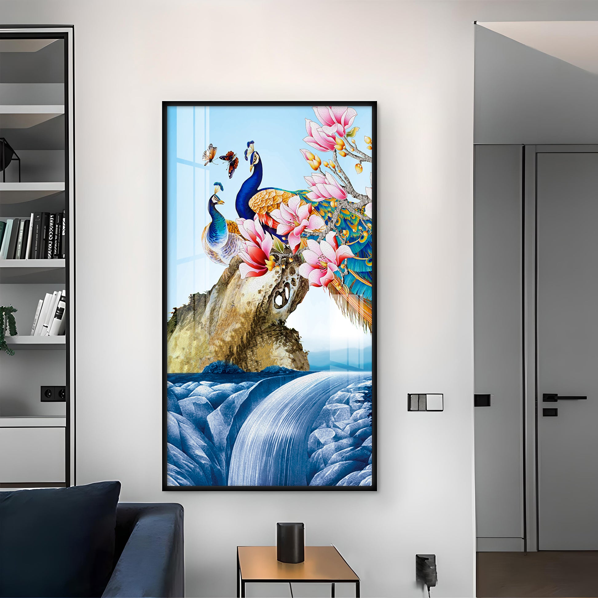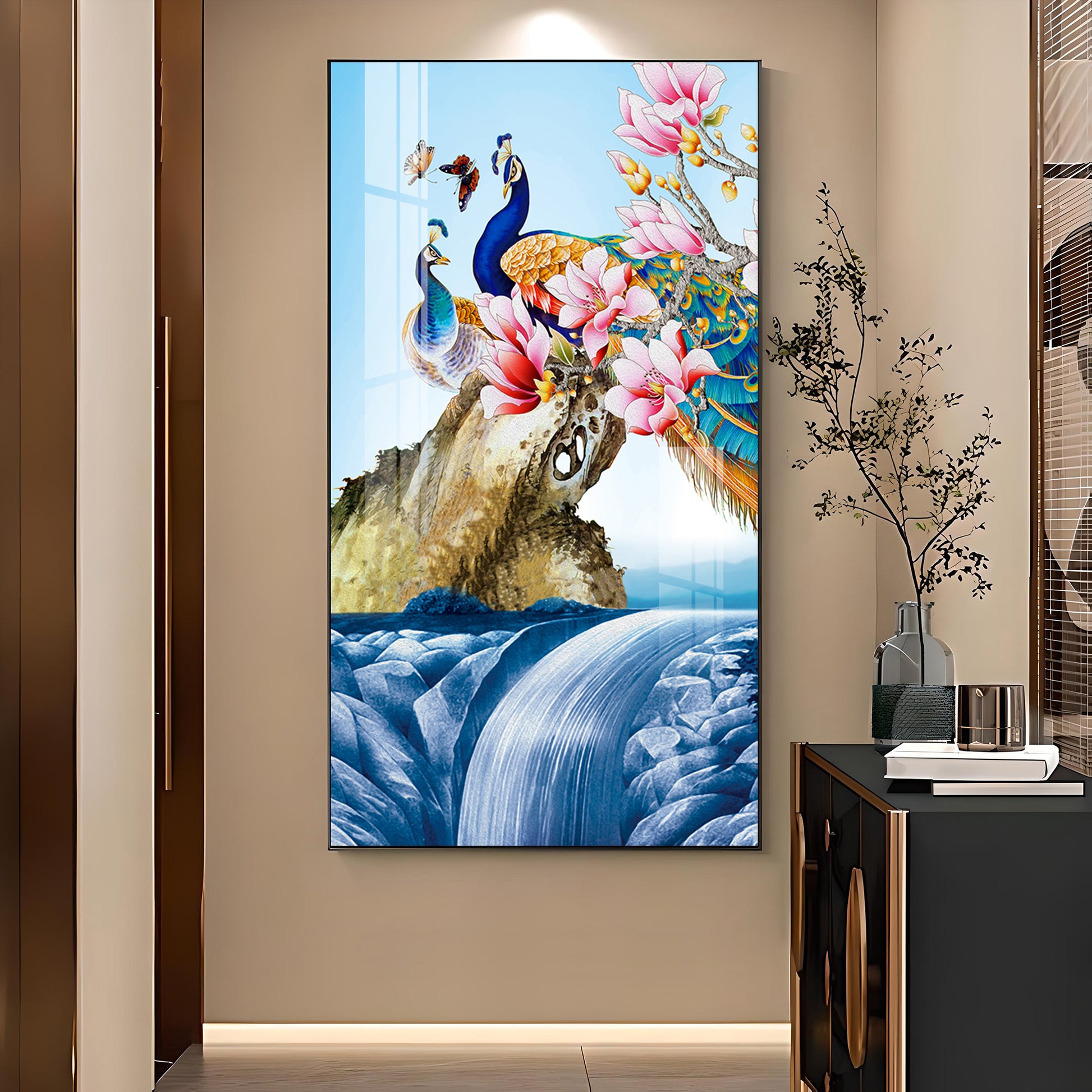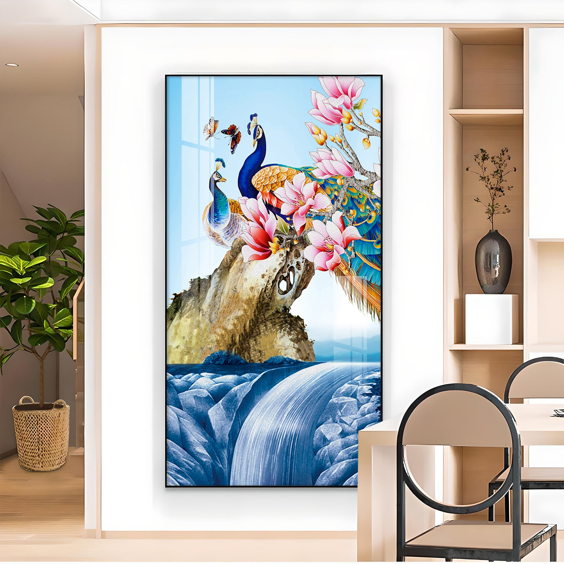 Peacock Amidst Floral Waters Glass Finish Vertical Wall Art