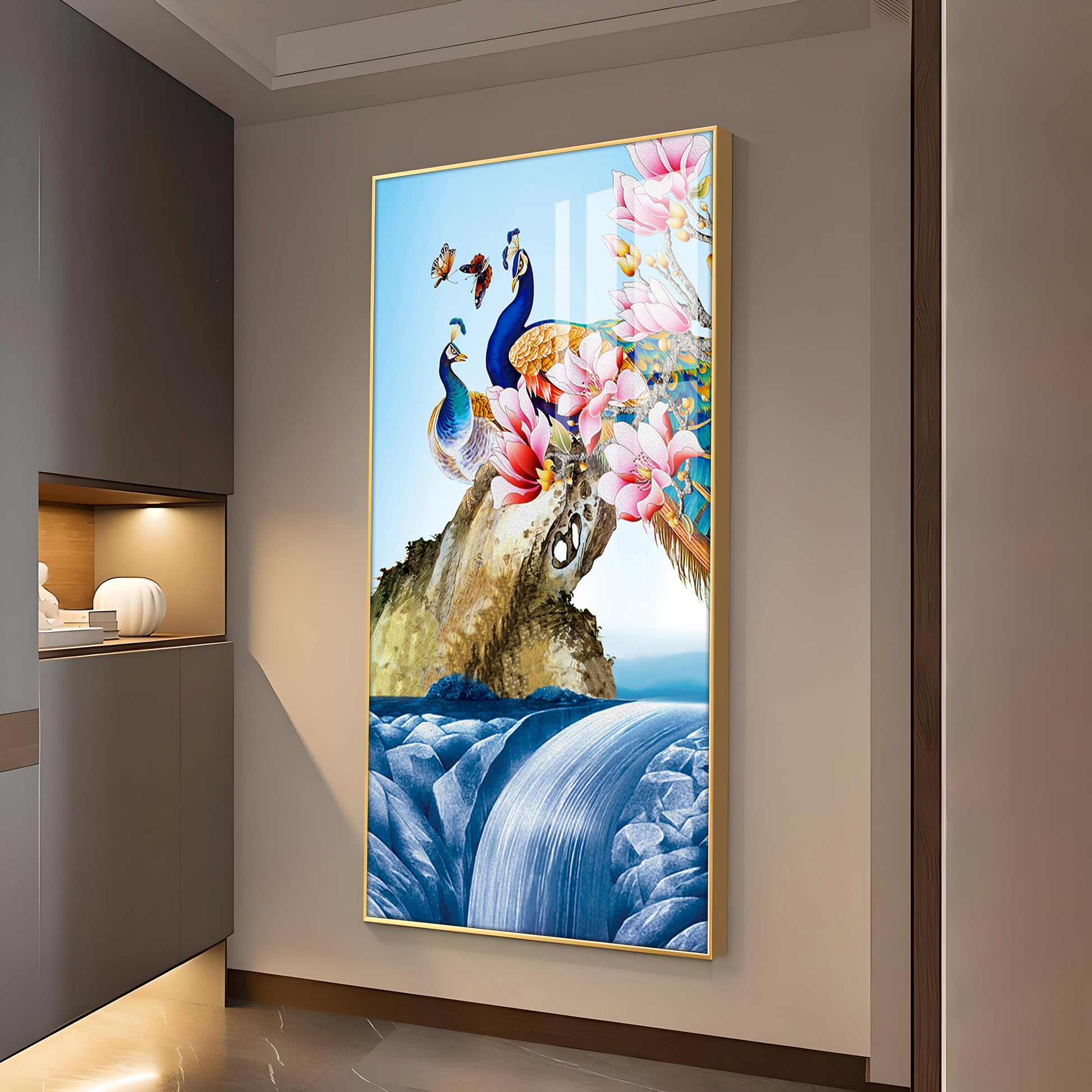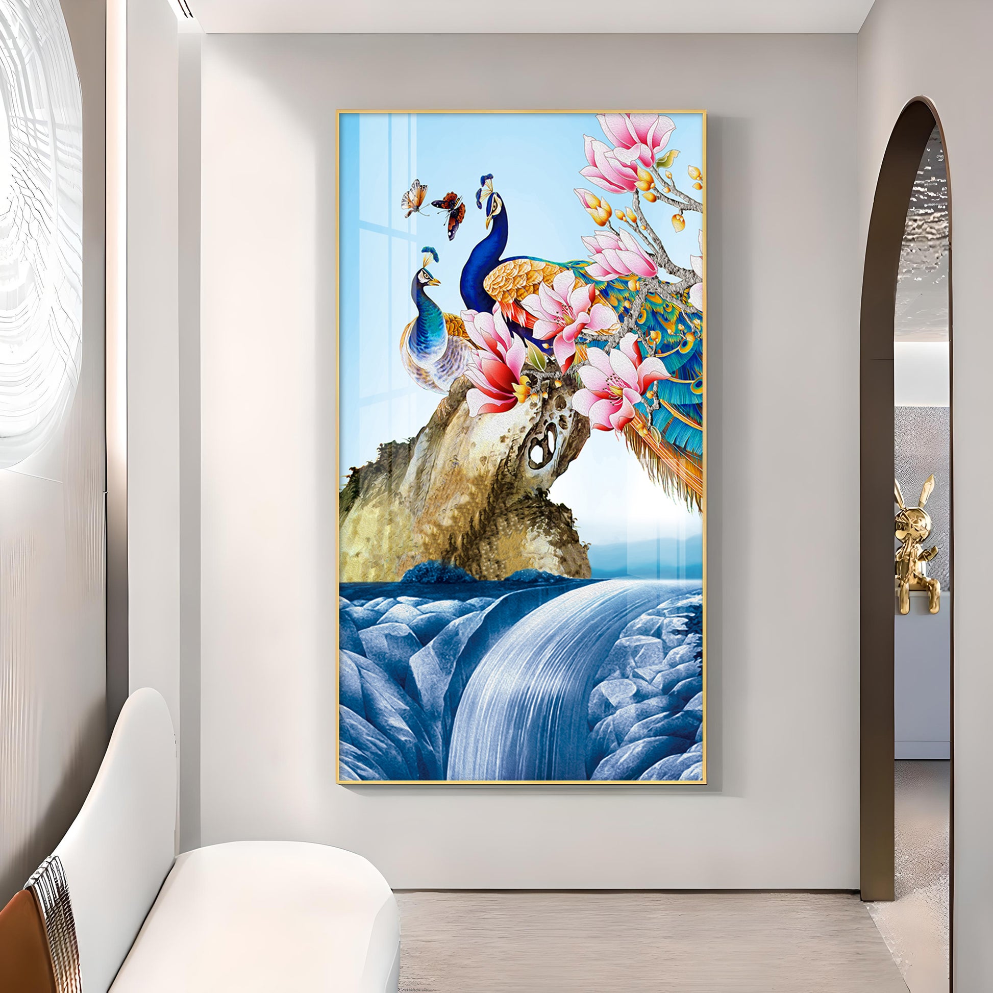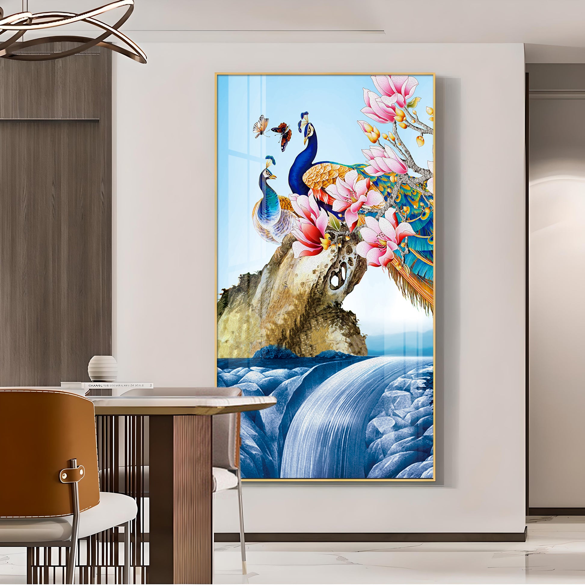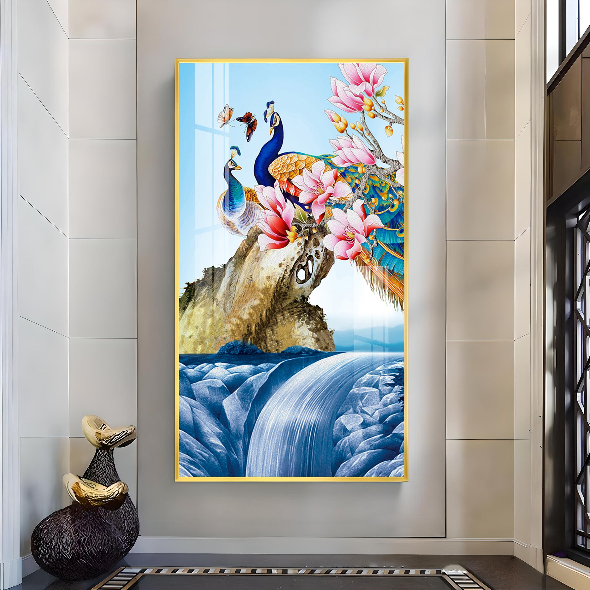 Peacock Amidst Floral Waters Glass Finish Vertical Wall Art