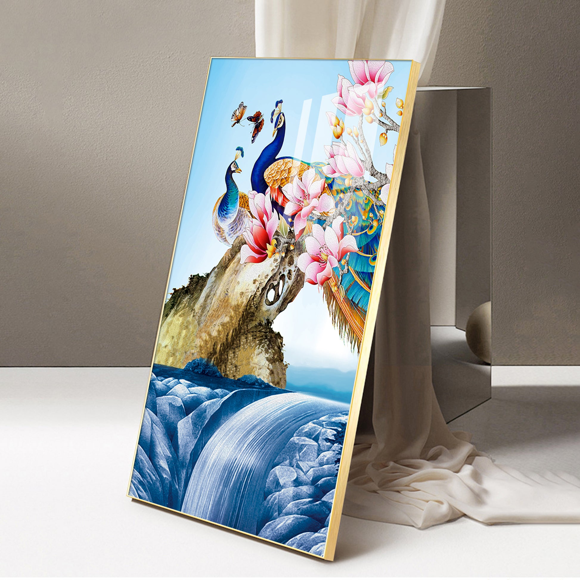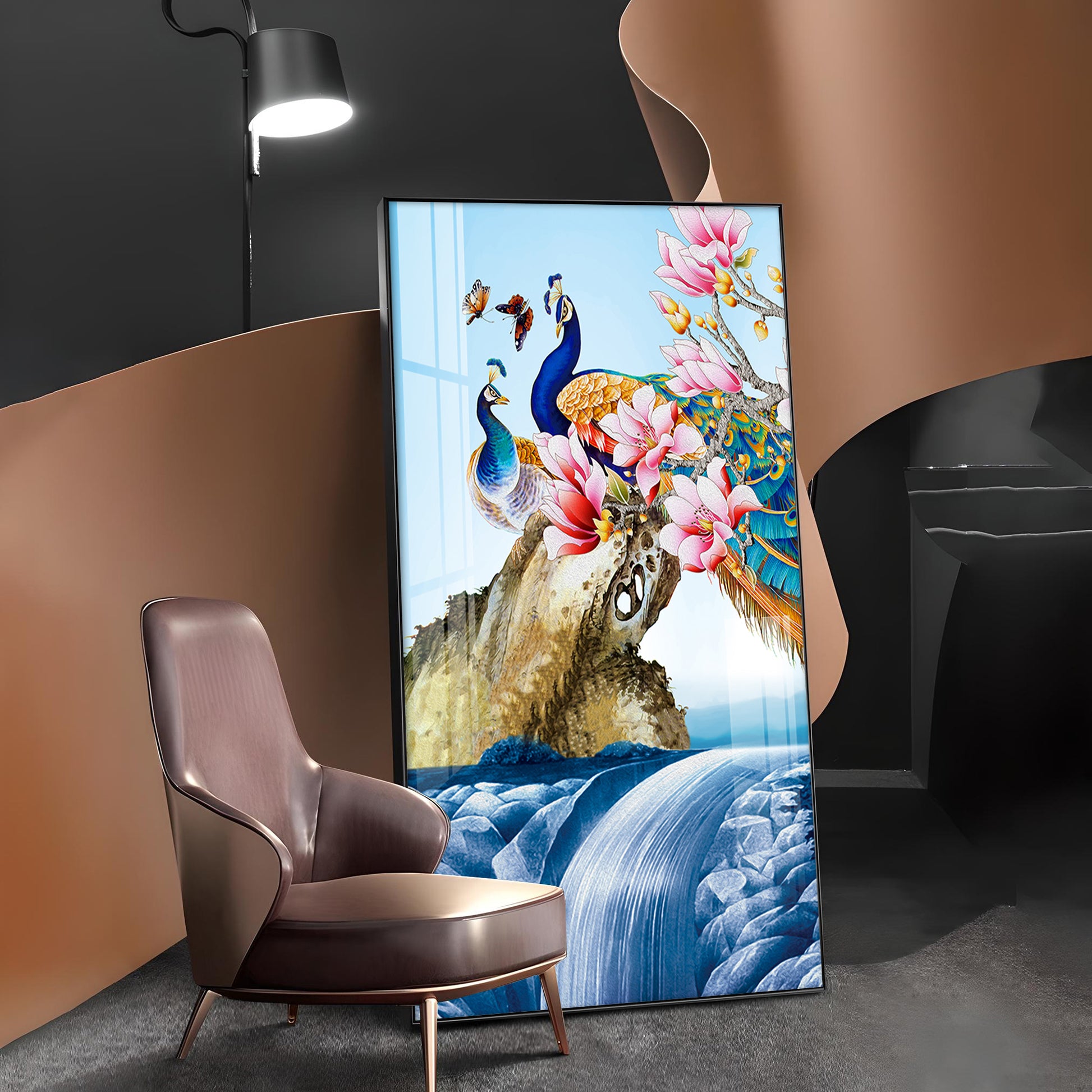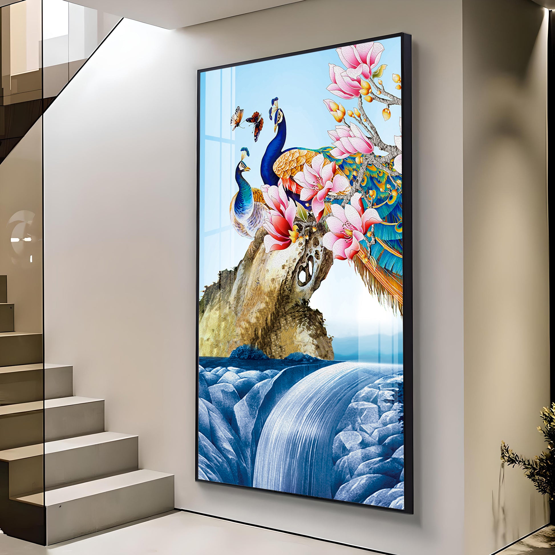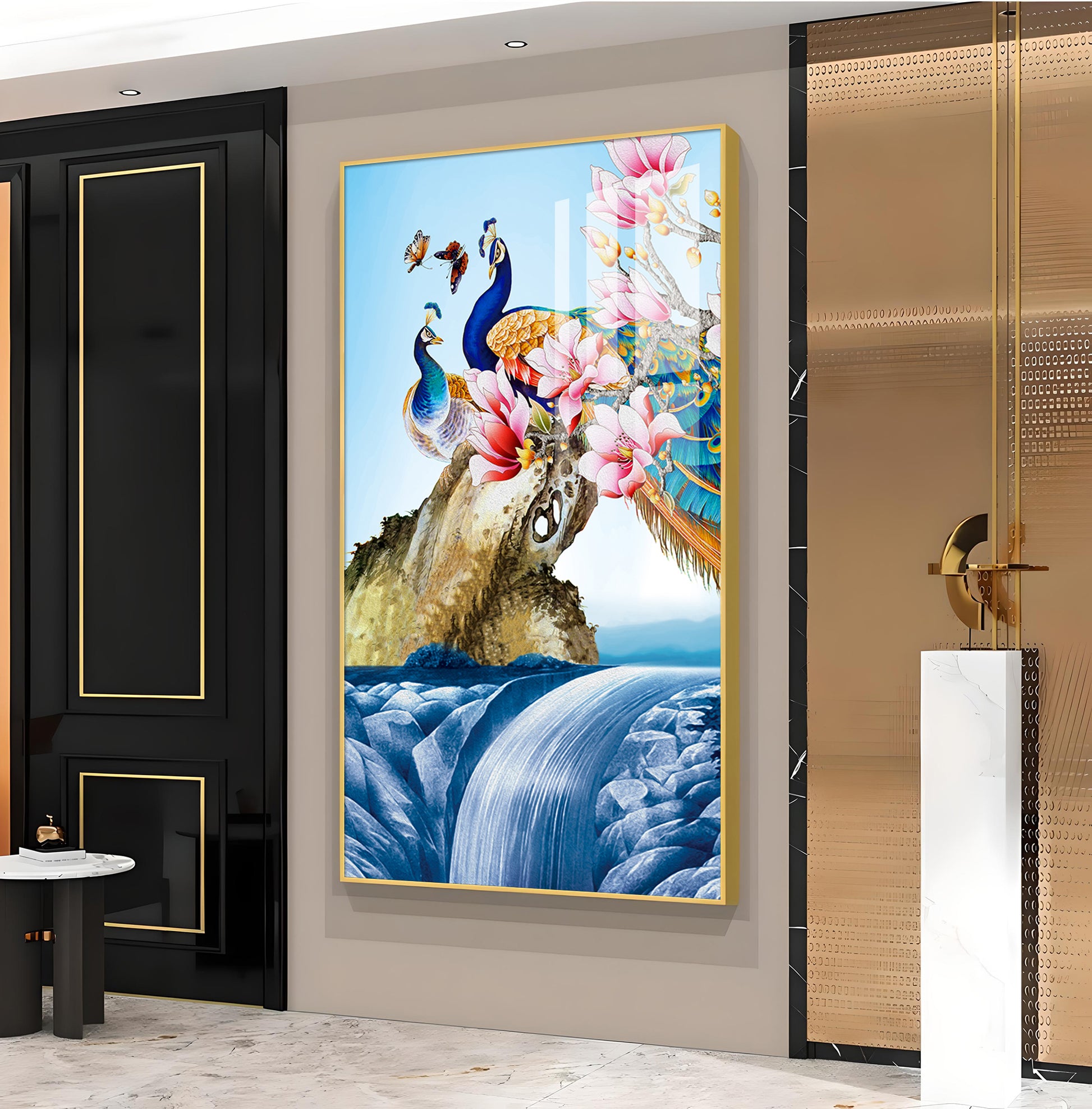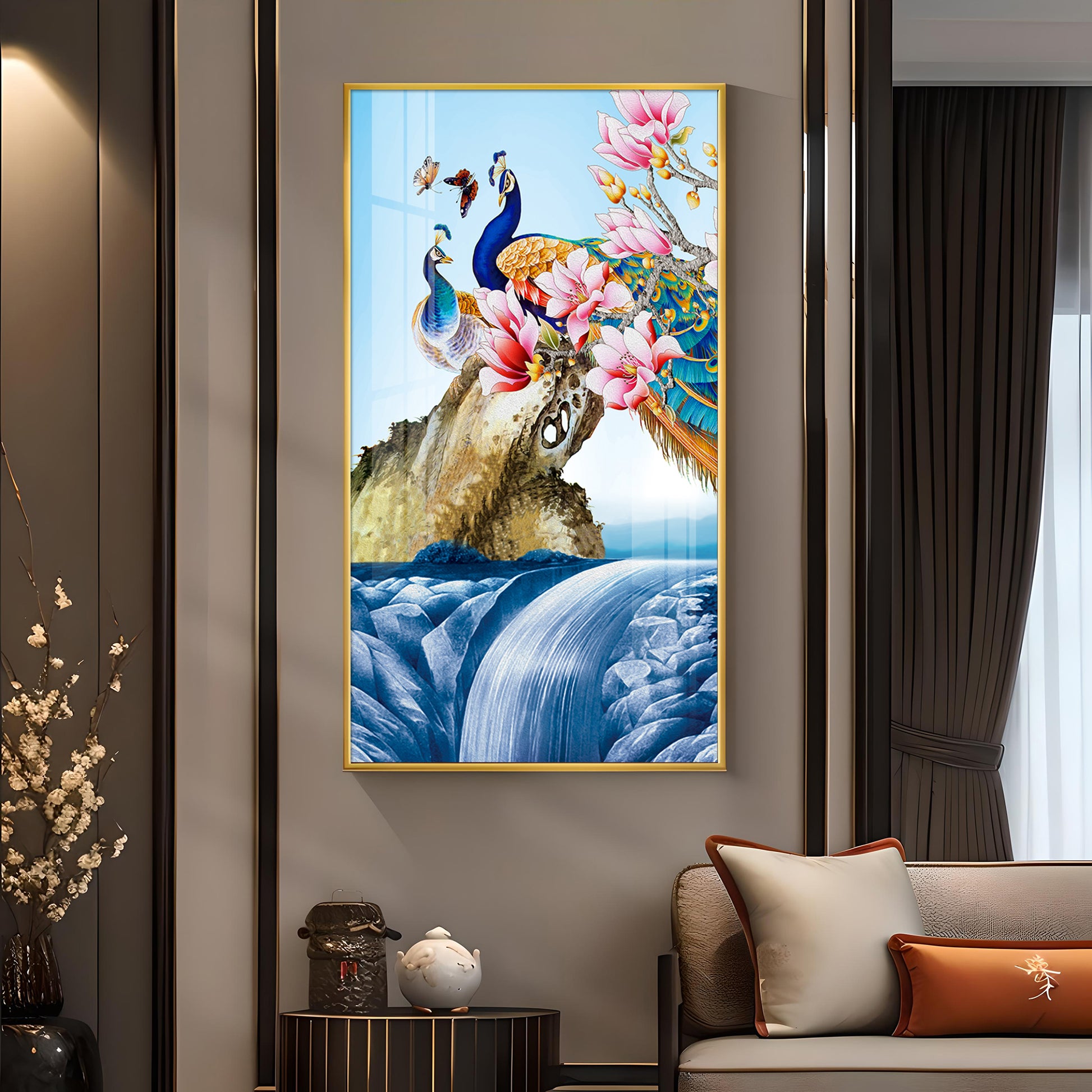 Peacock Amidst Floral Waters Glass Finish Vertical Wall Art