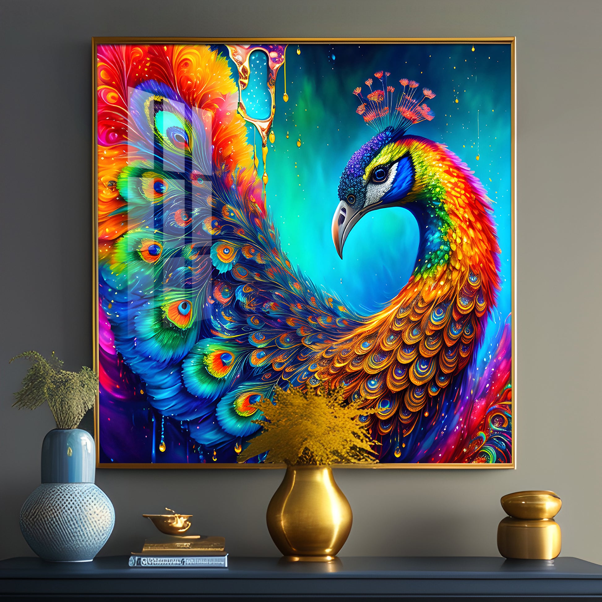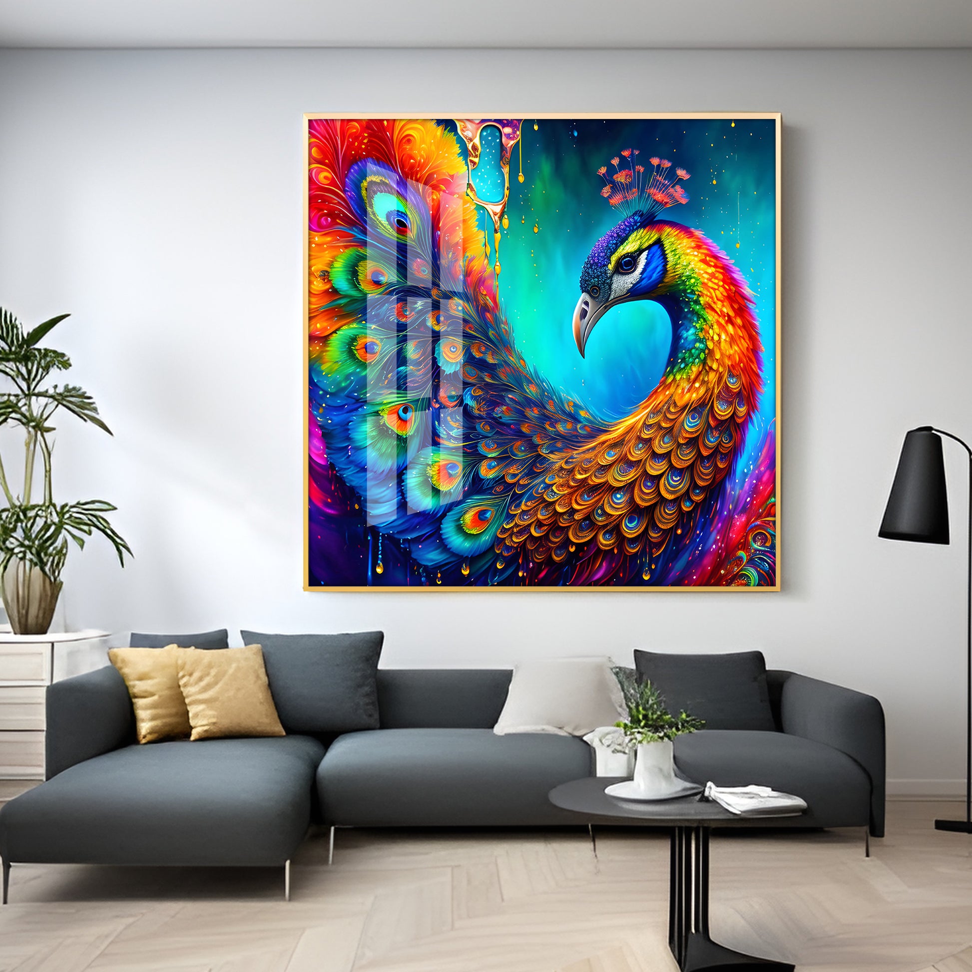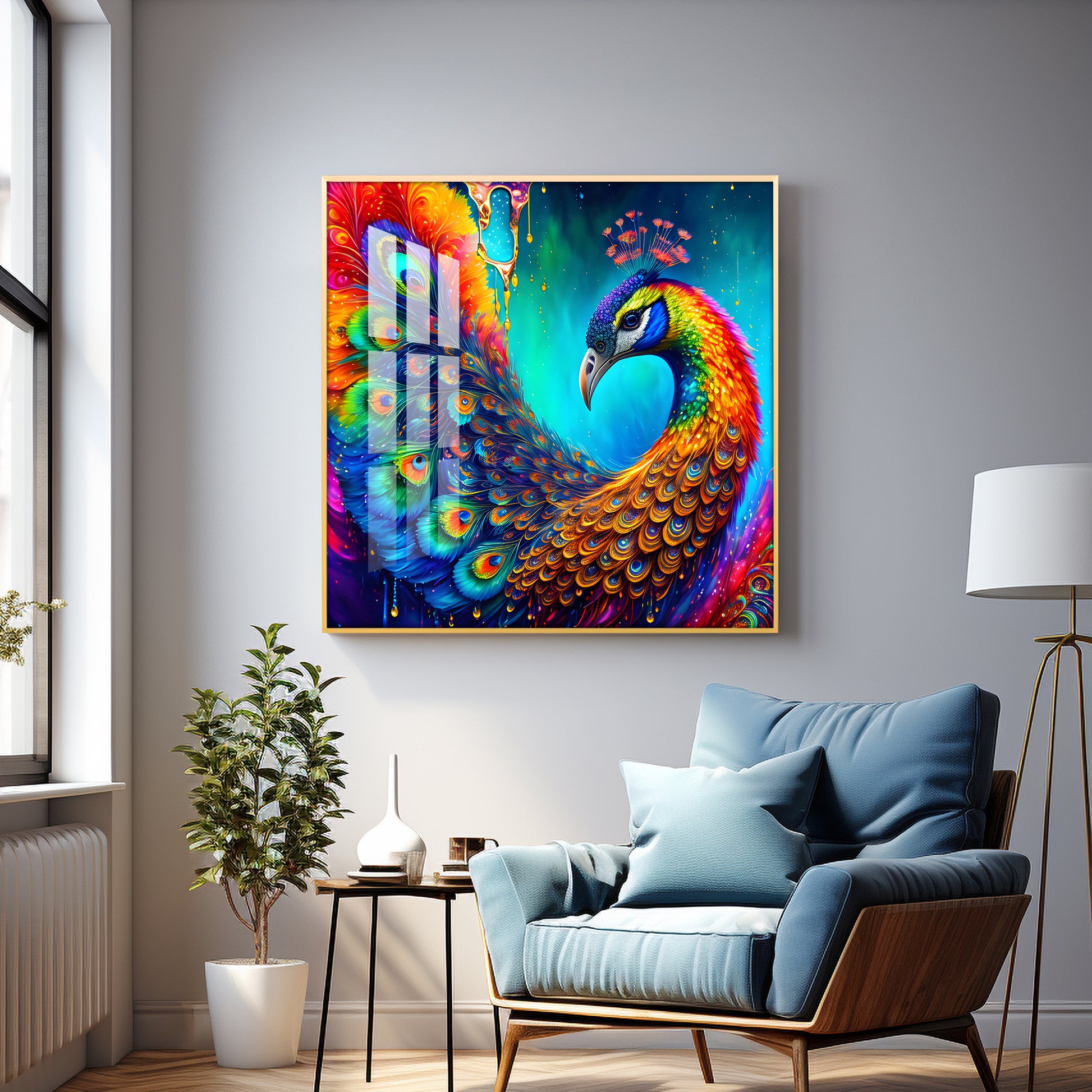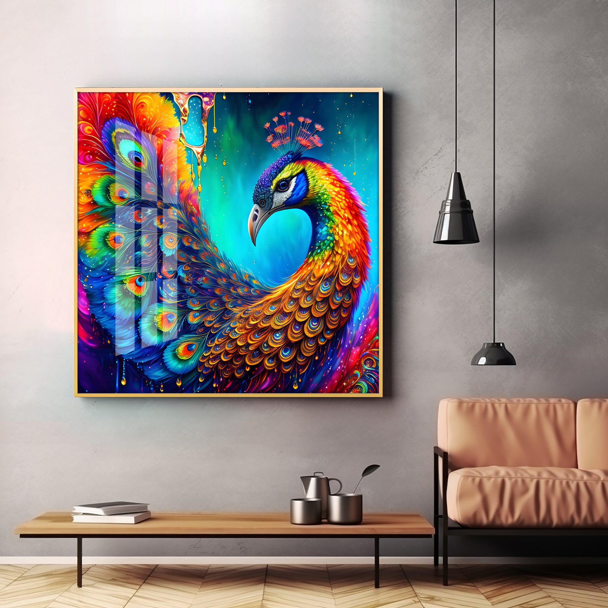 Peacock Elegance Glass Finish Square Wall Art