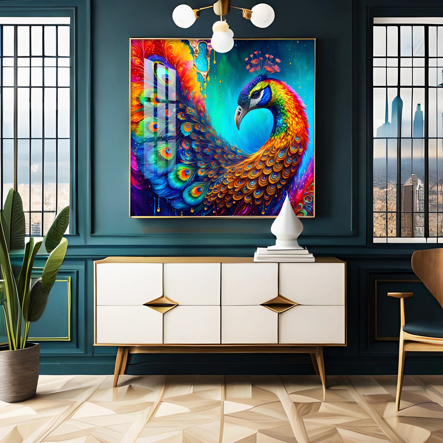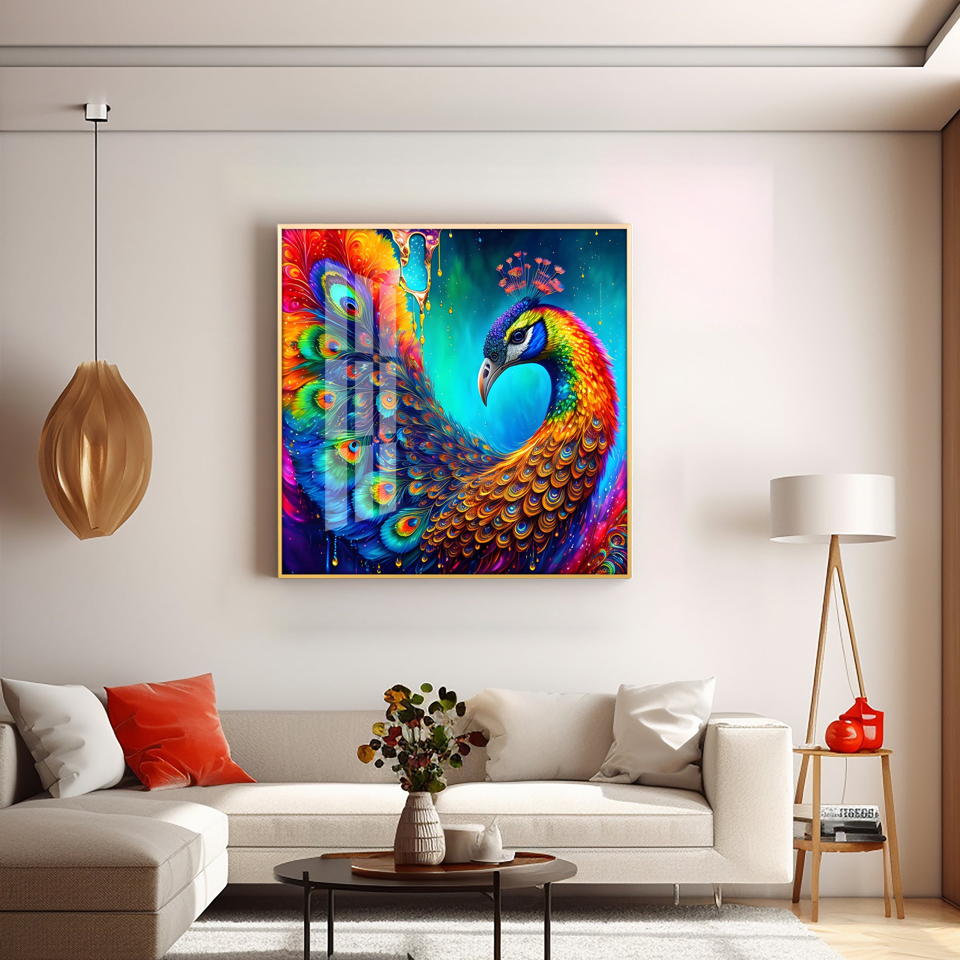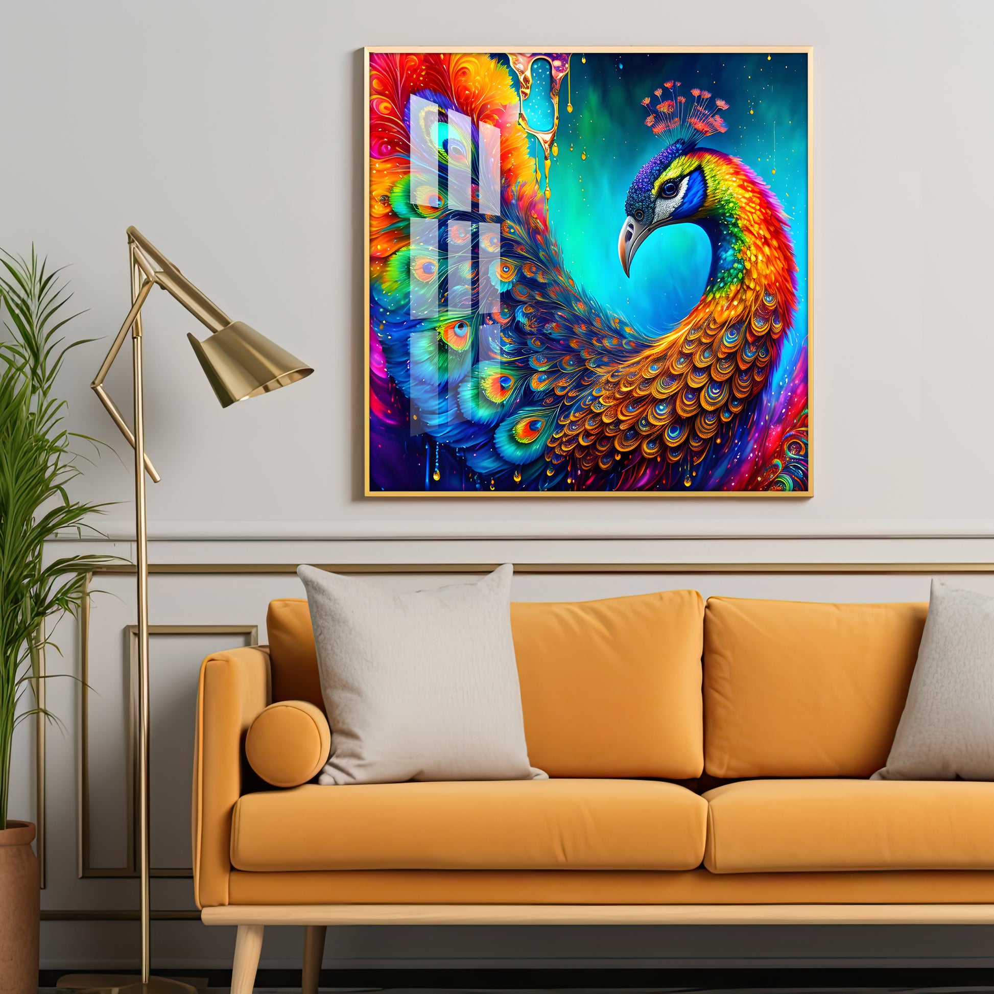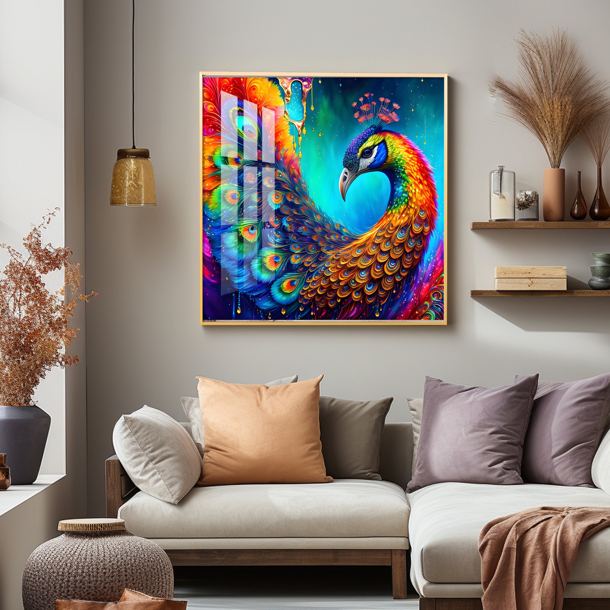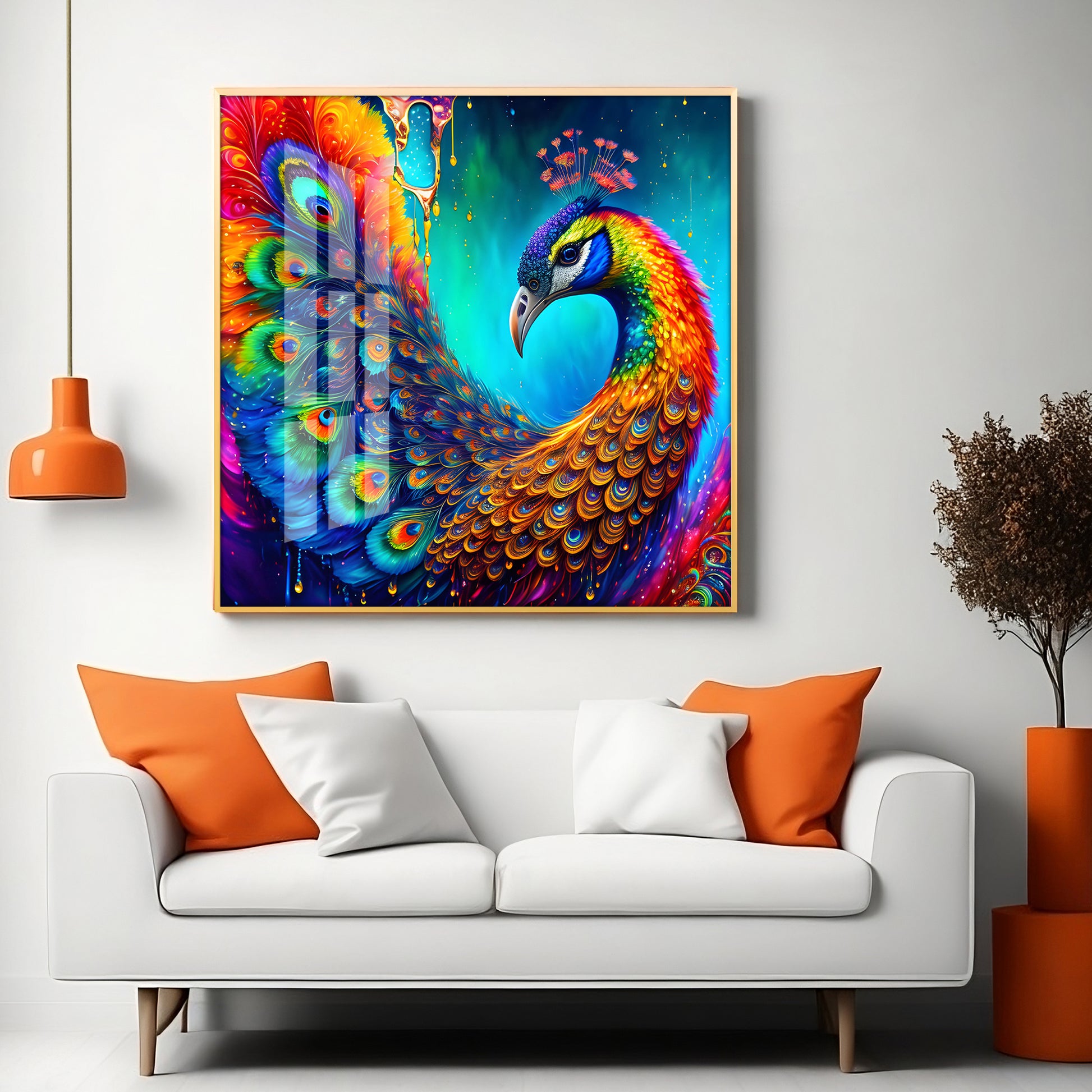 Peacock Elegance Glass Finish Square Wall Art