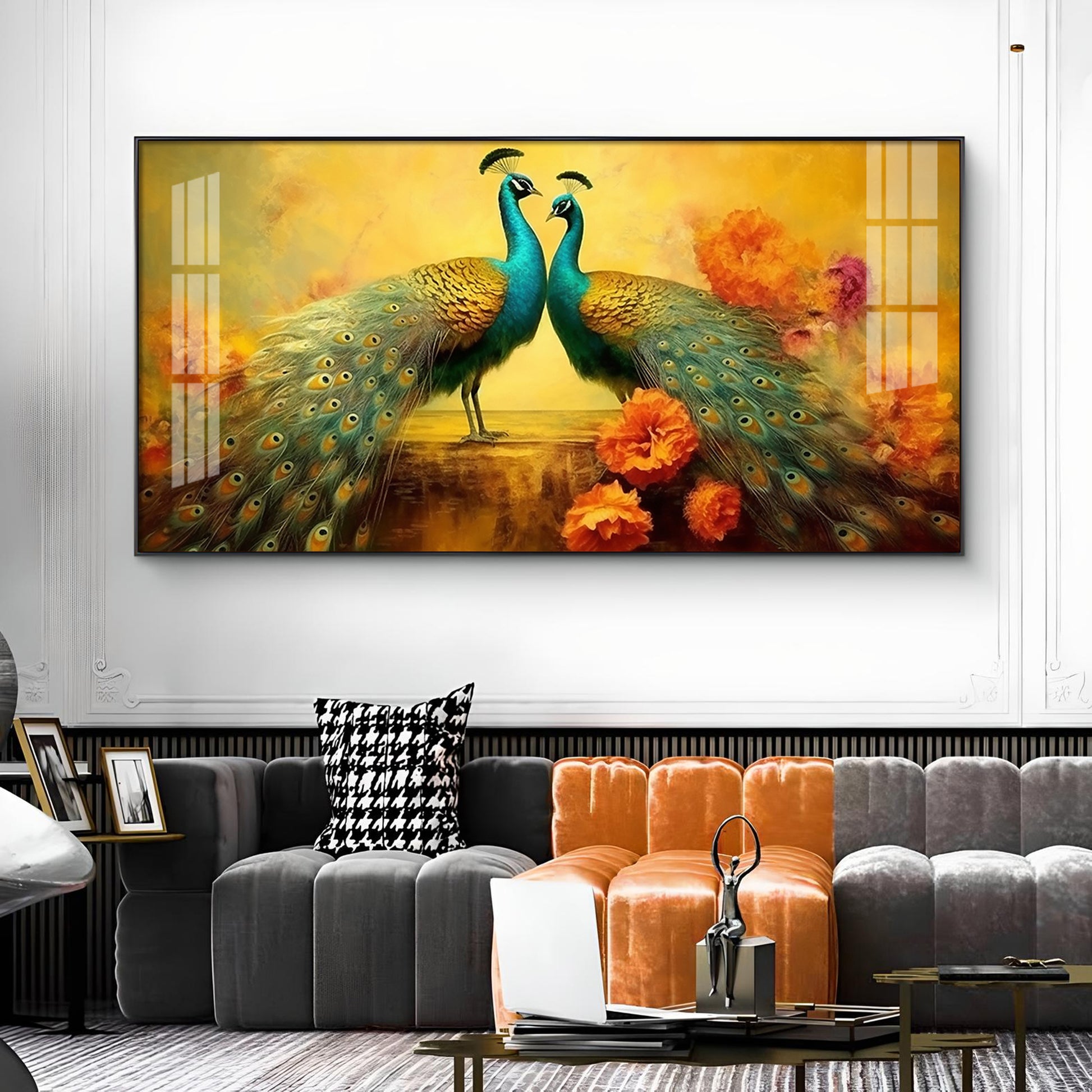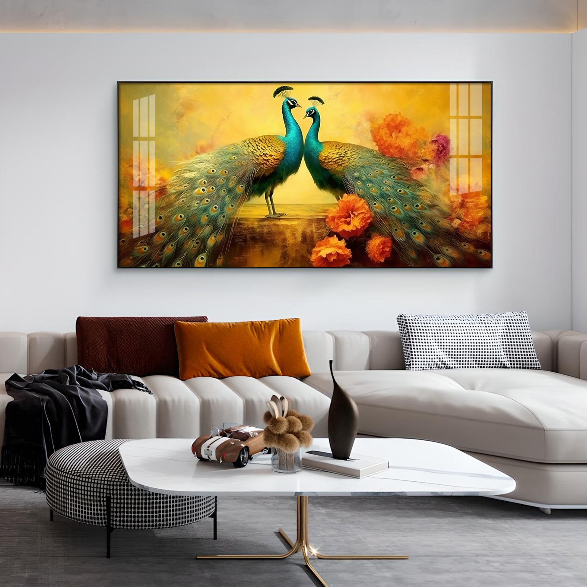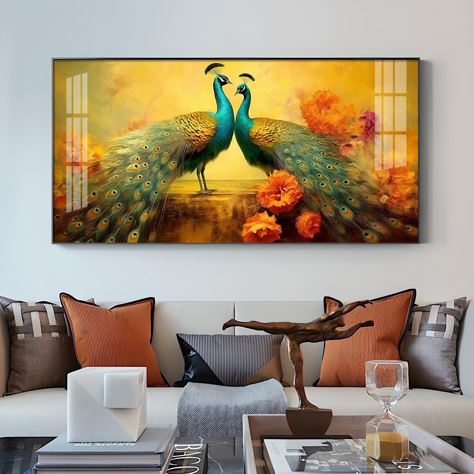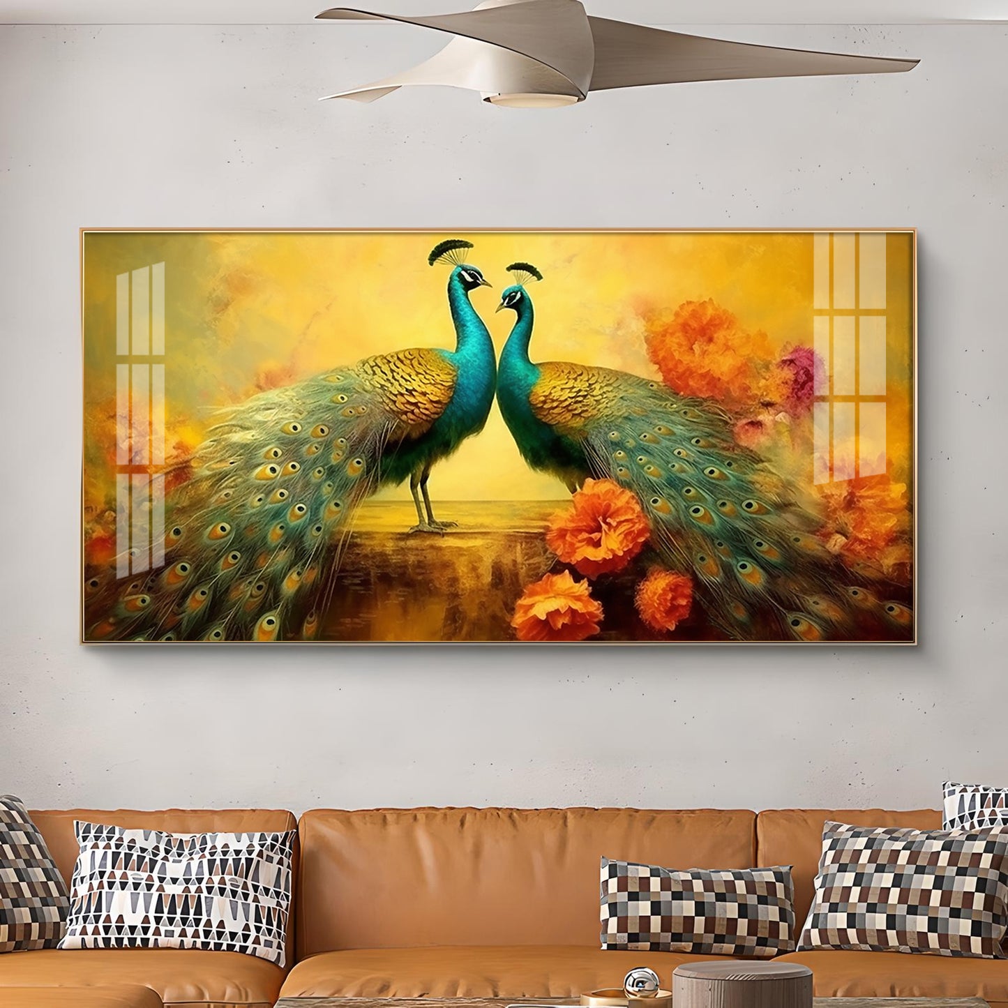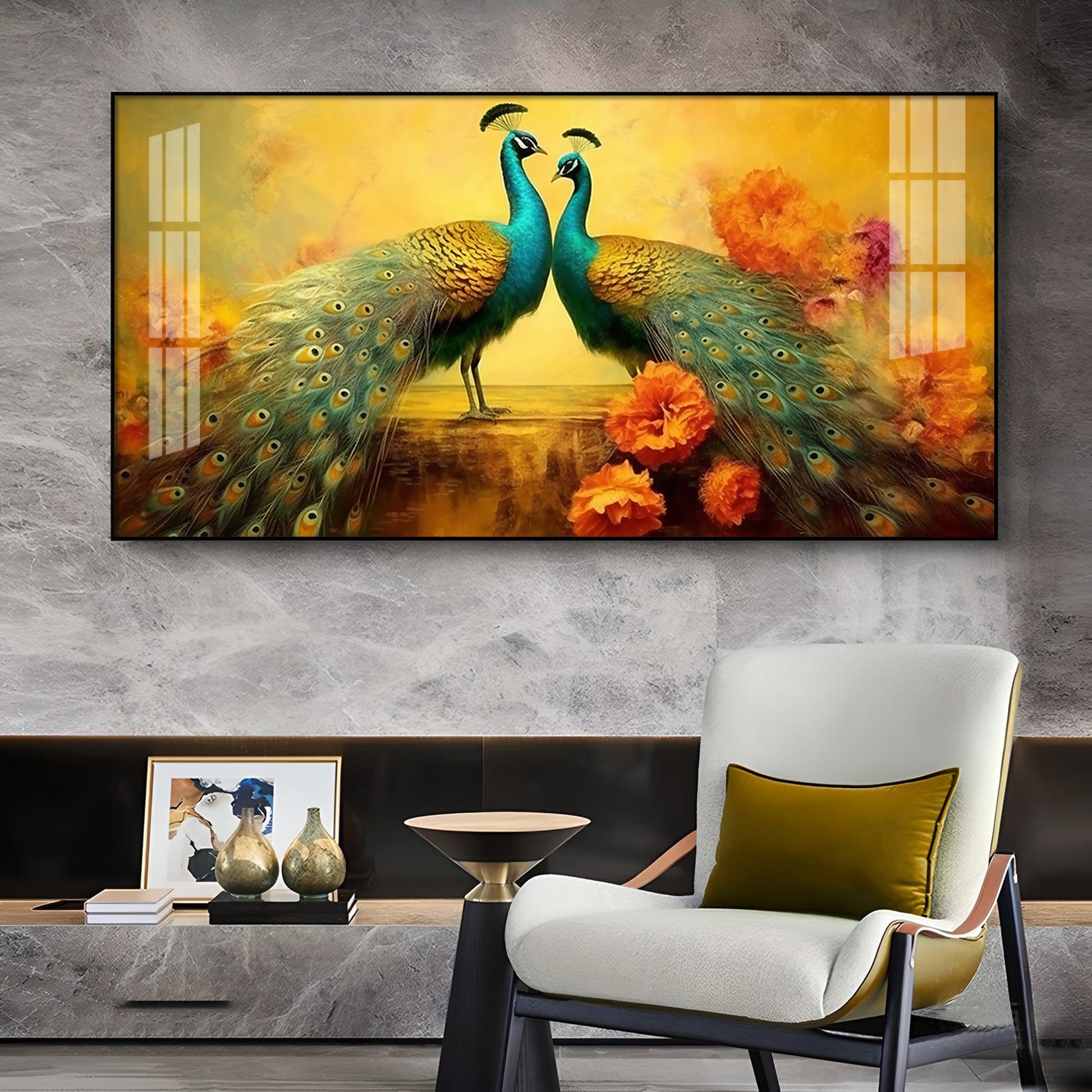 Peacocks With Flower Background Glass Finish Horizontal Wall Art