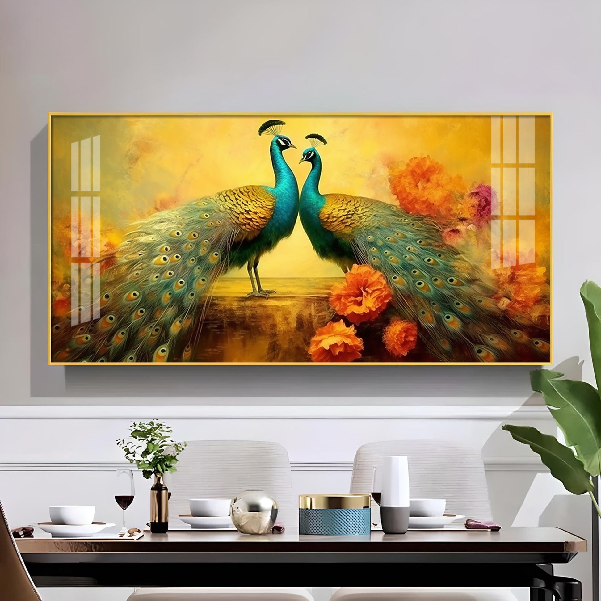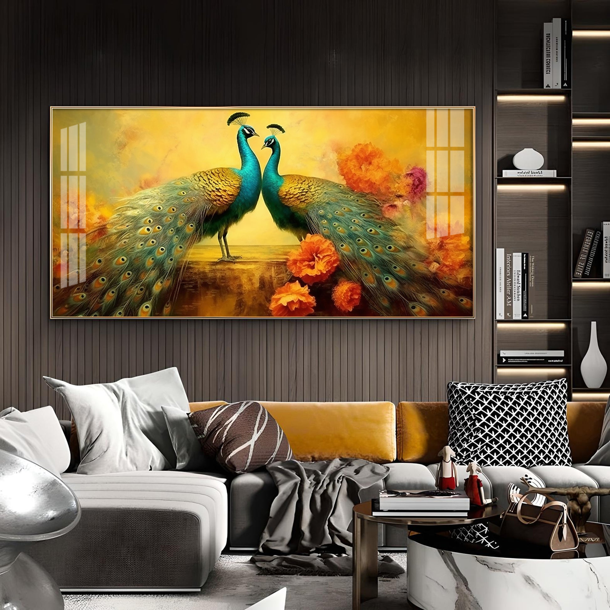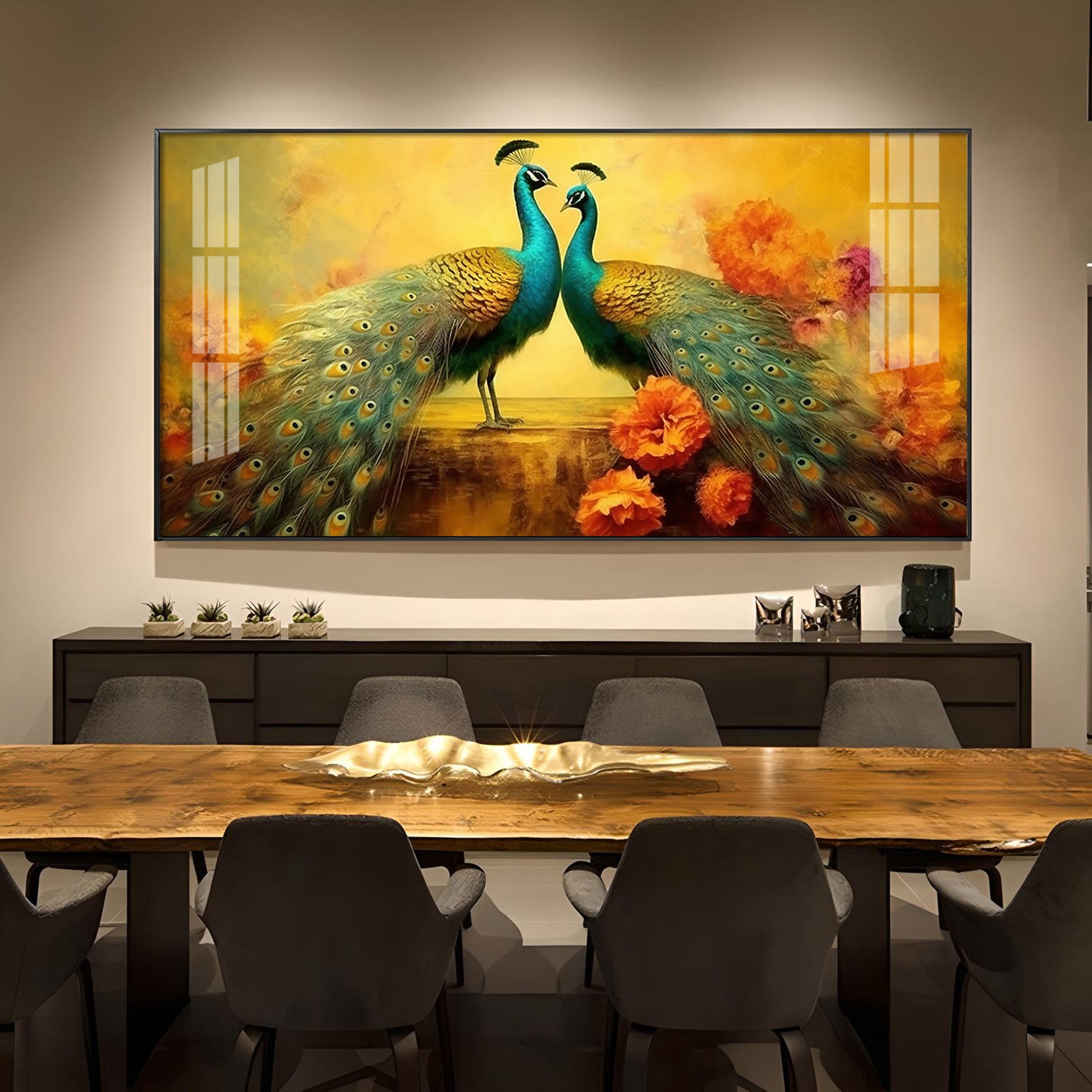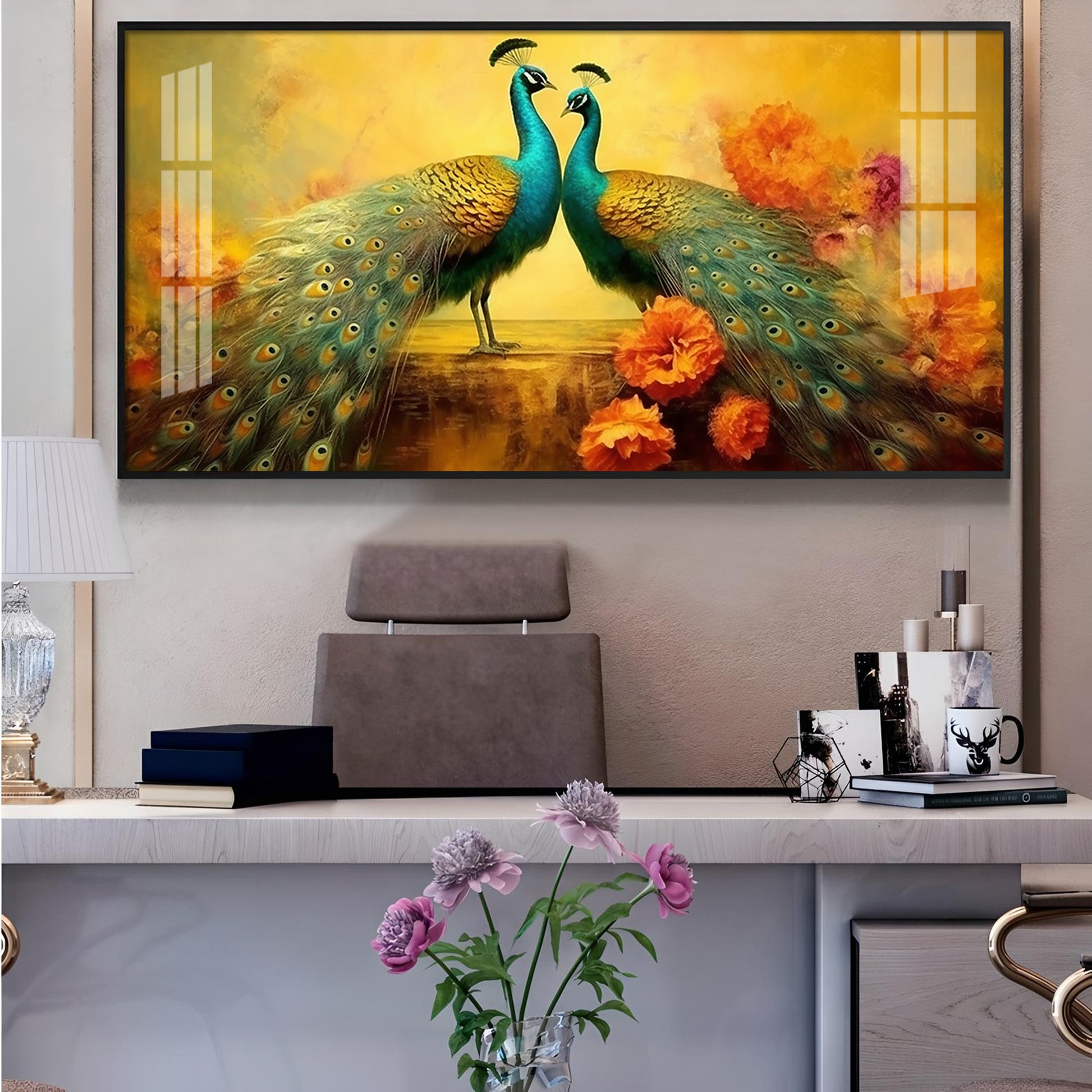 Peacocks With Flower Background Glass Finish Horizontal Wall Art