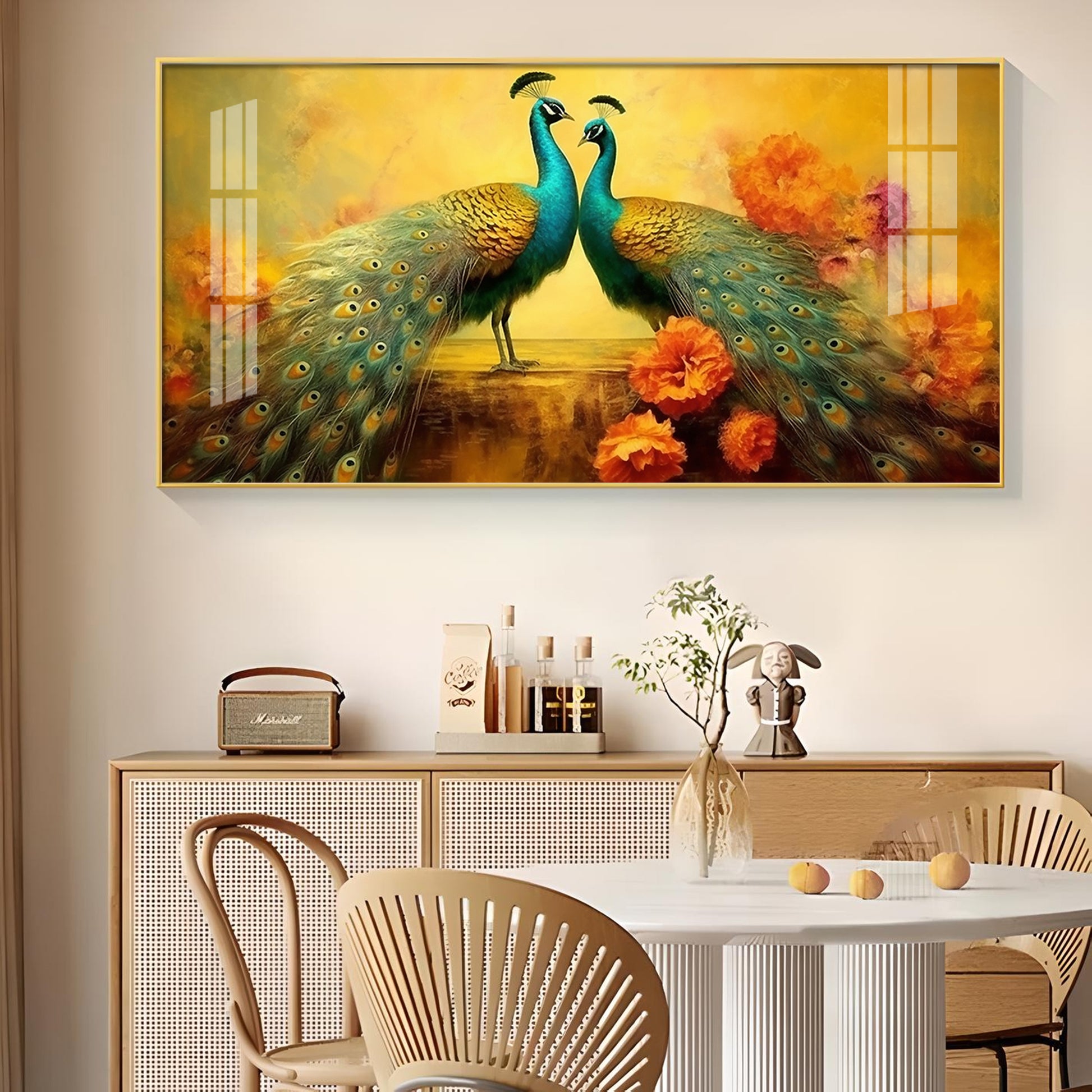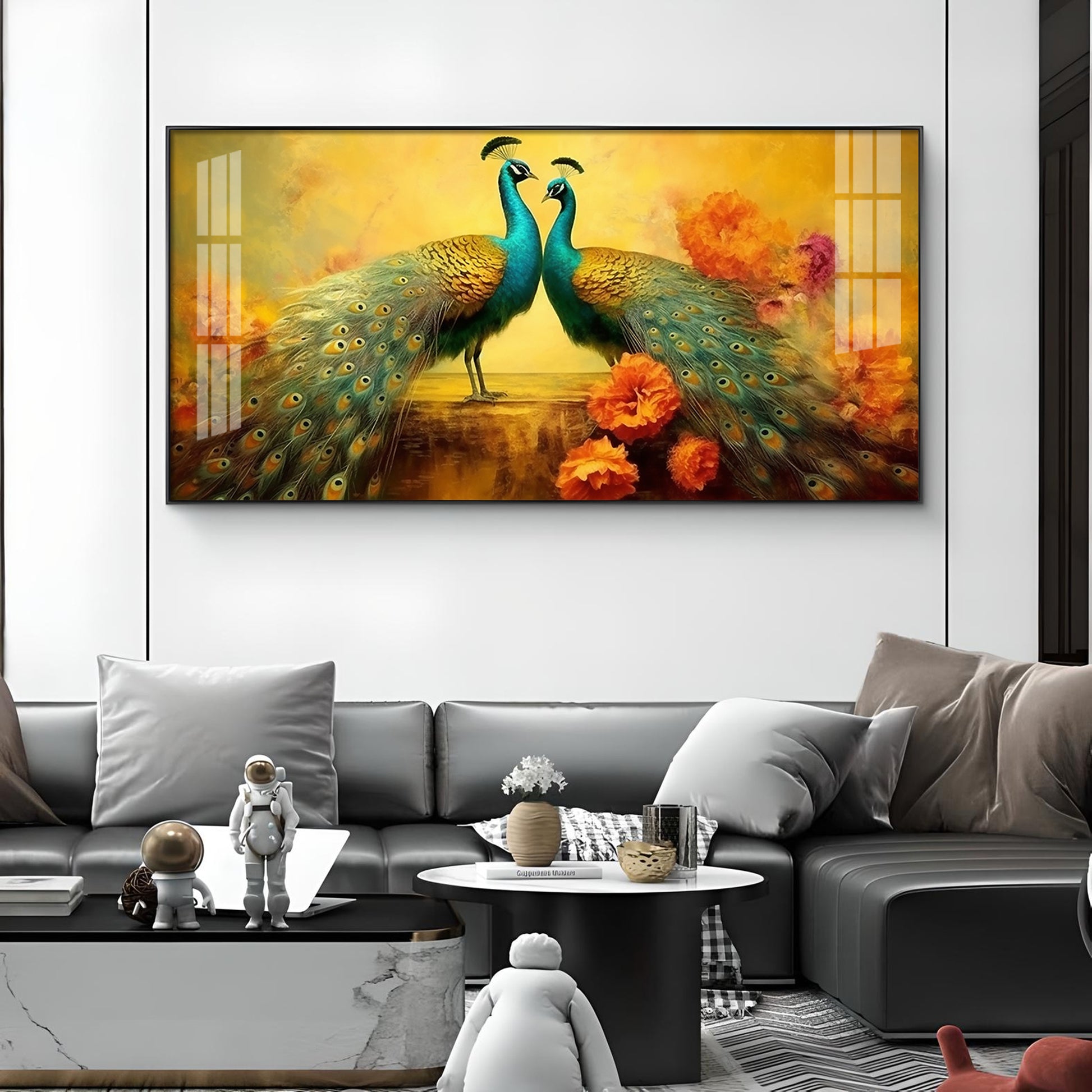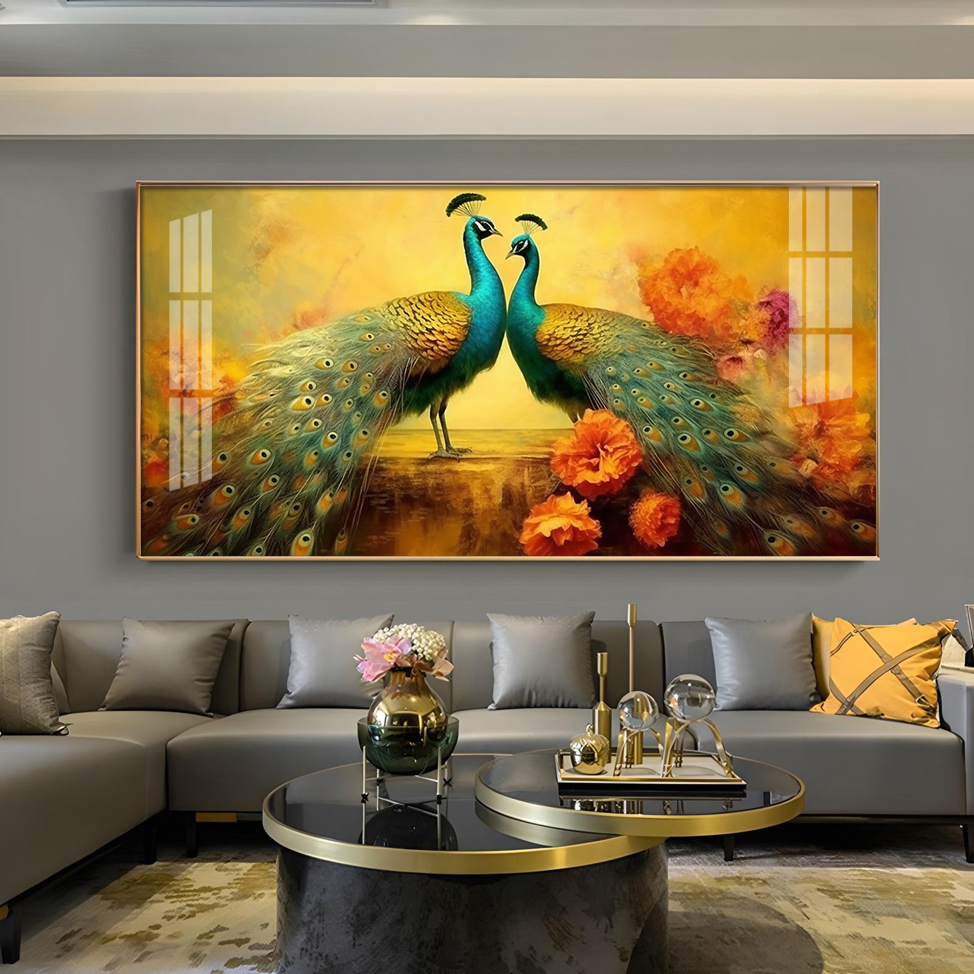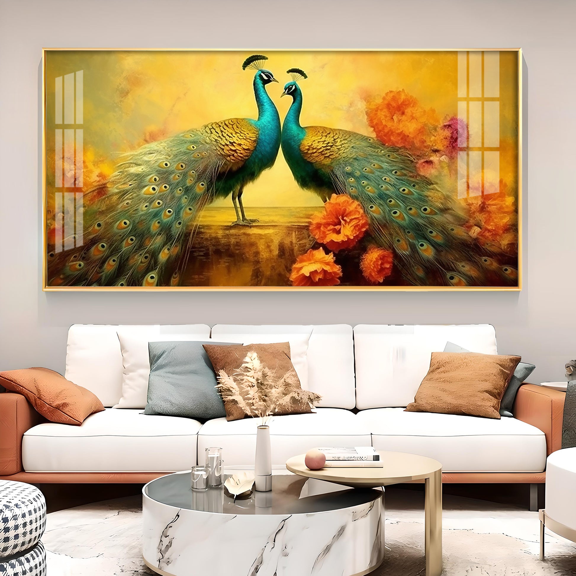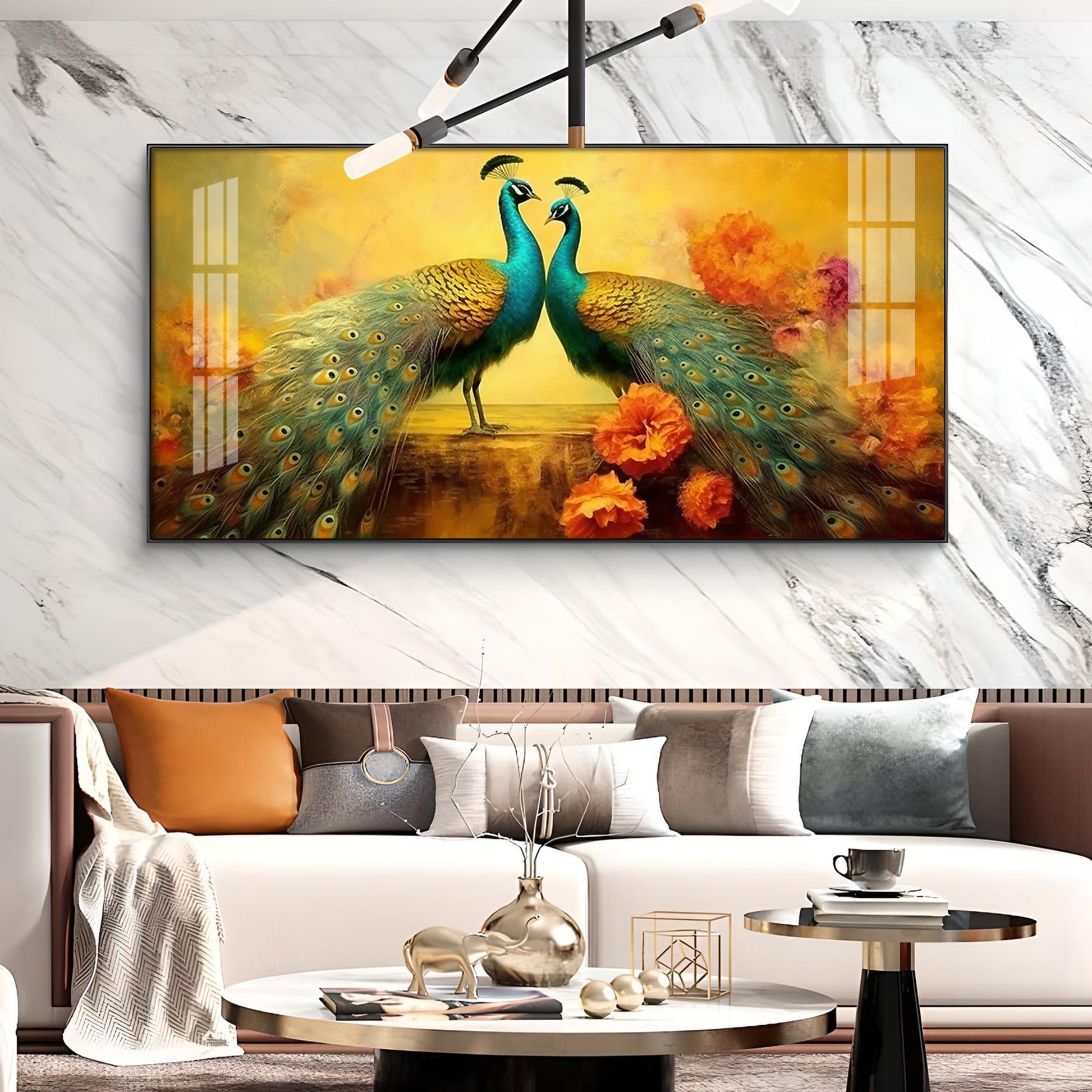 Peacocks With Flower Background Glass Finish Horizontal Wall Art