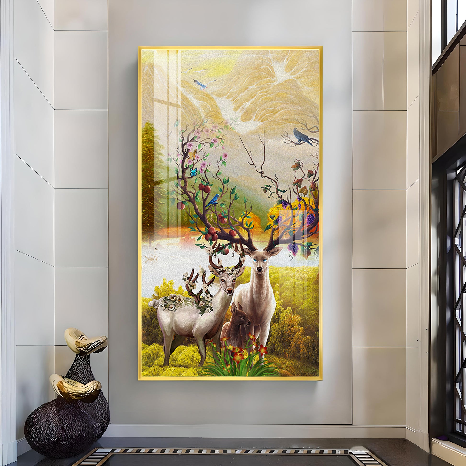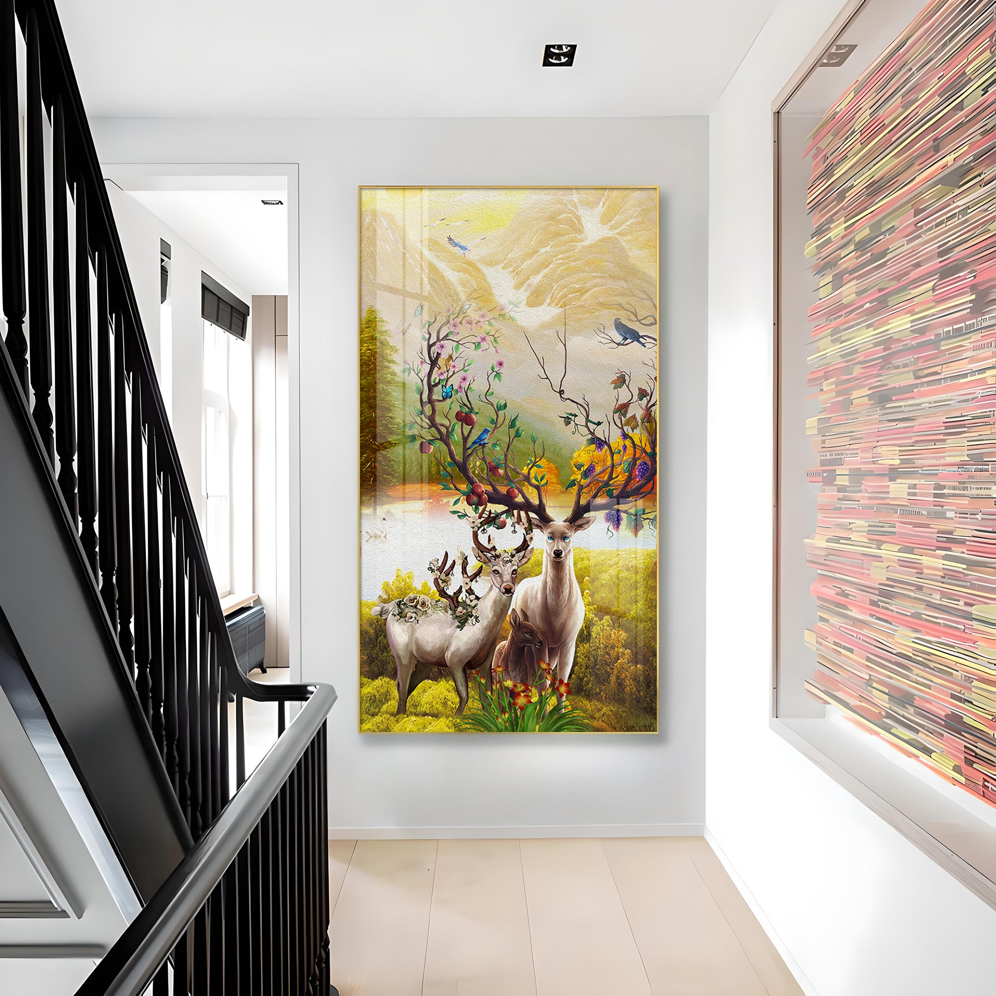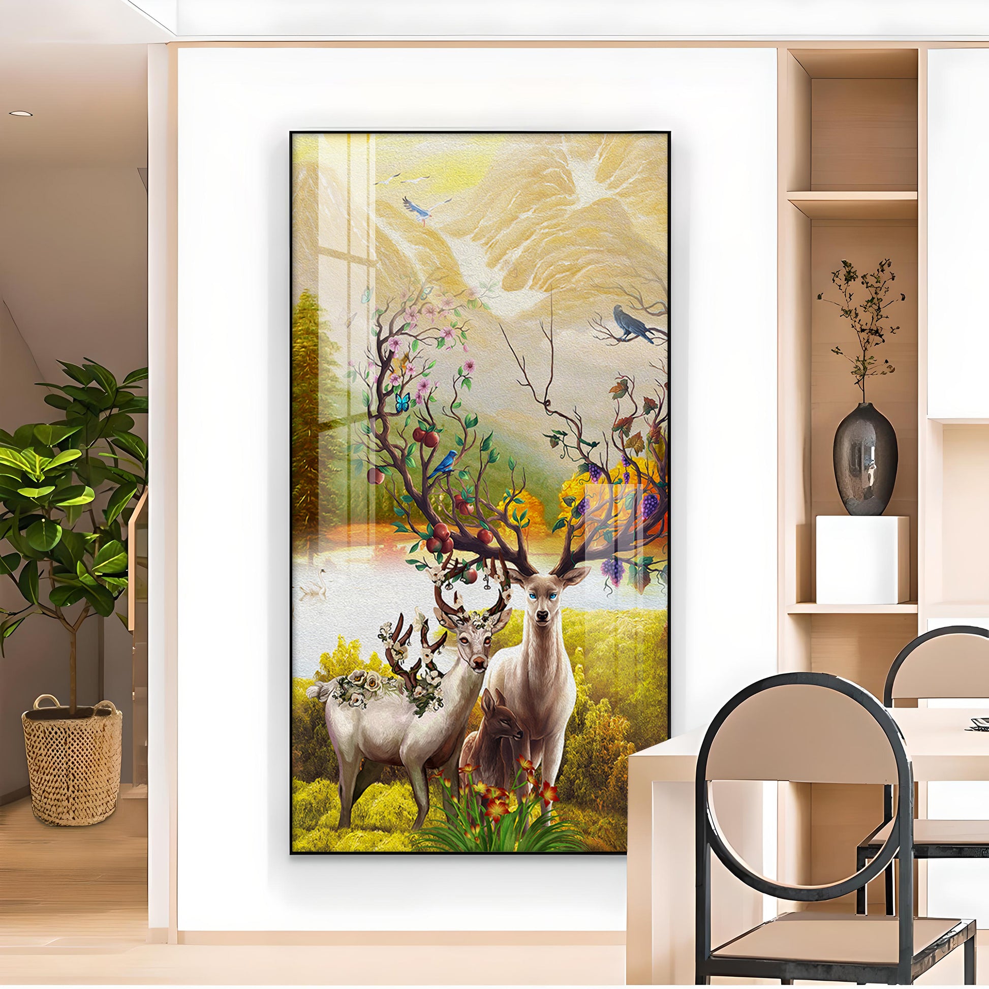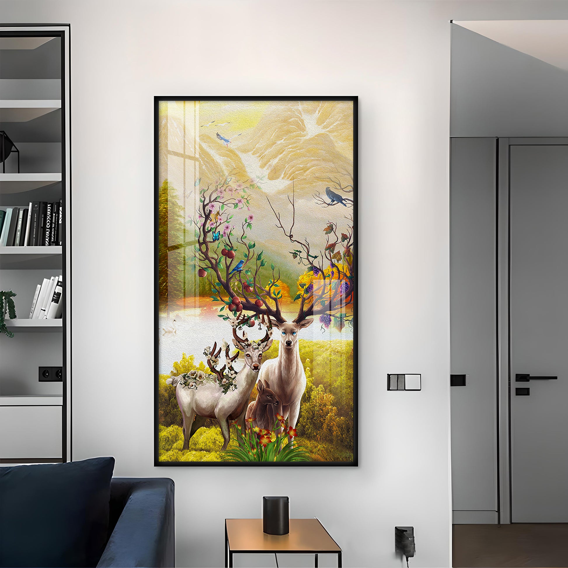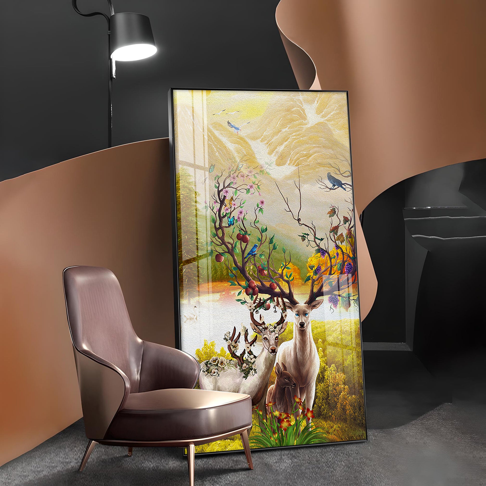 Portrait of Deer and Blossoms Glass Finish Vertical Wall Art
