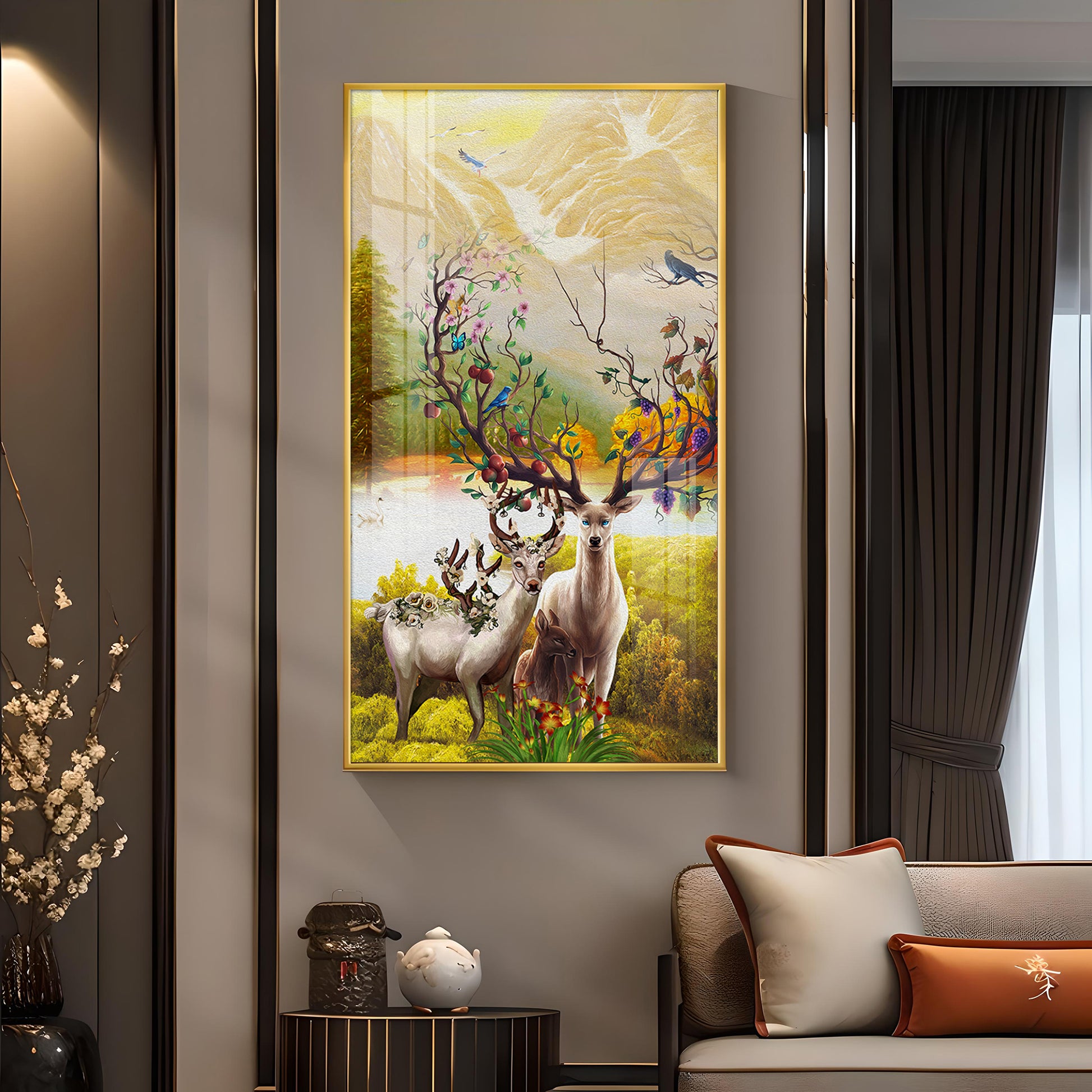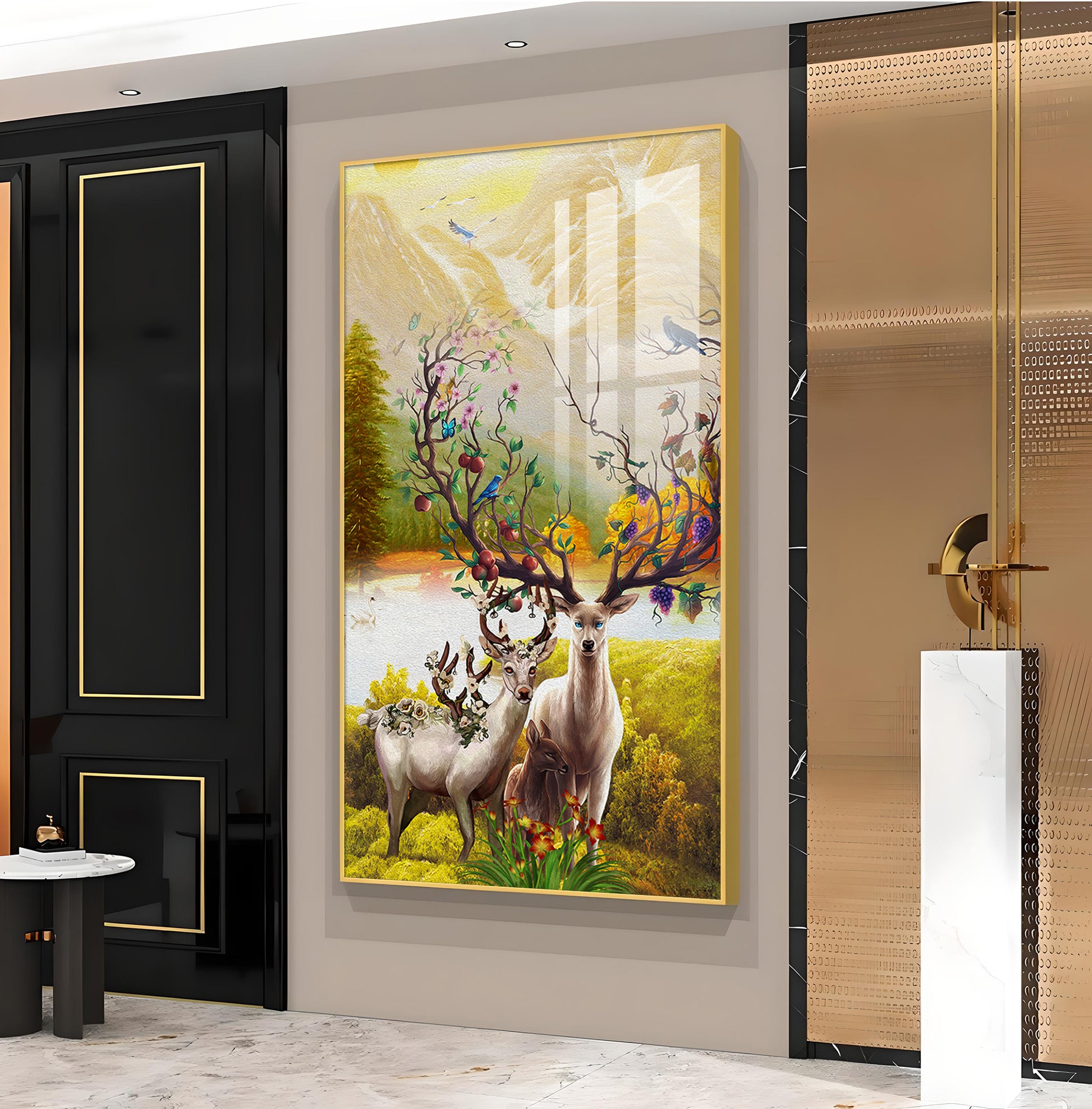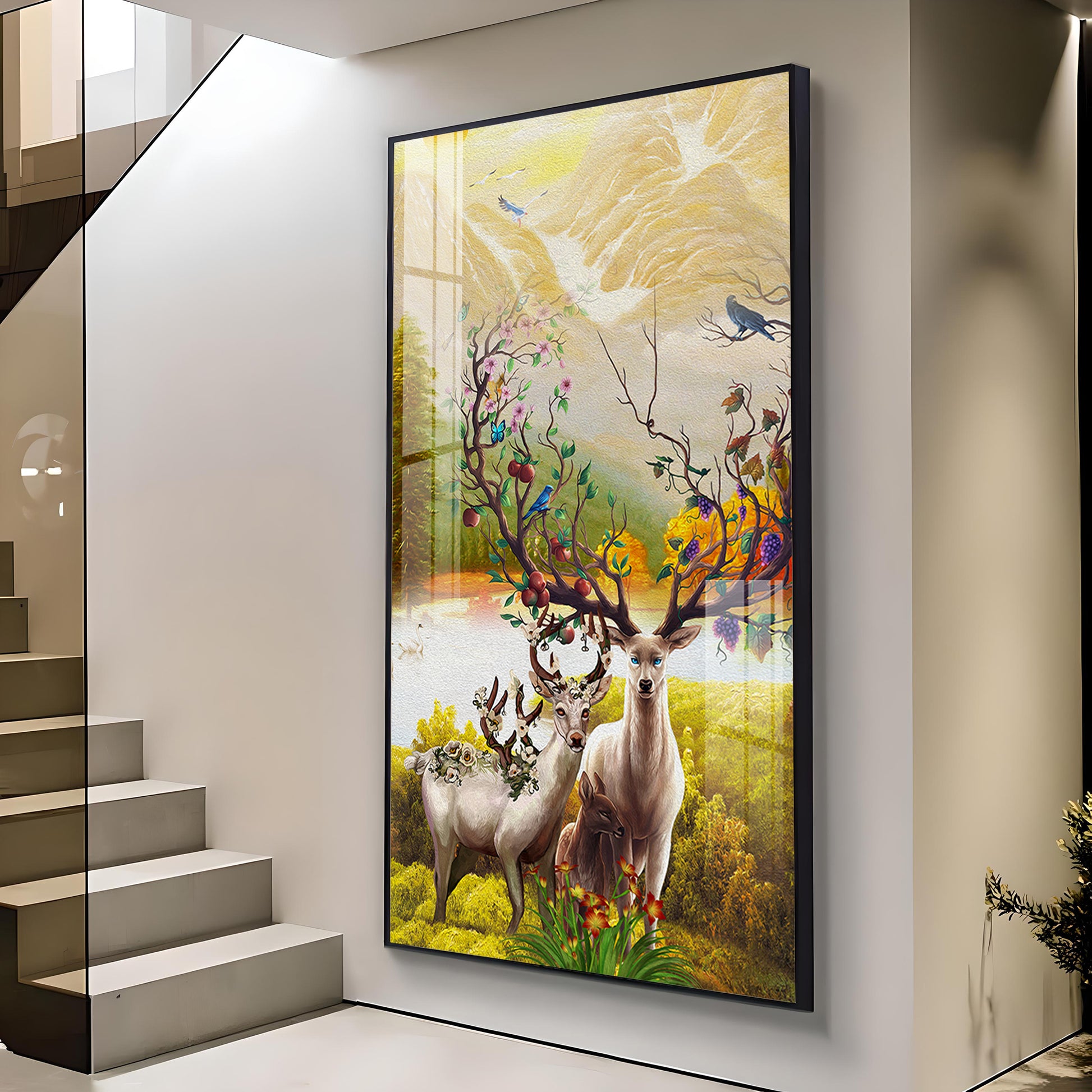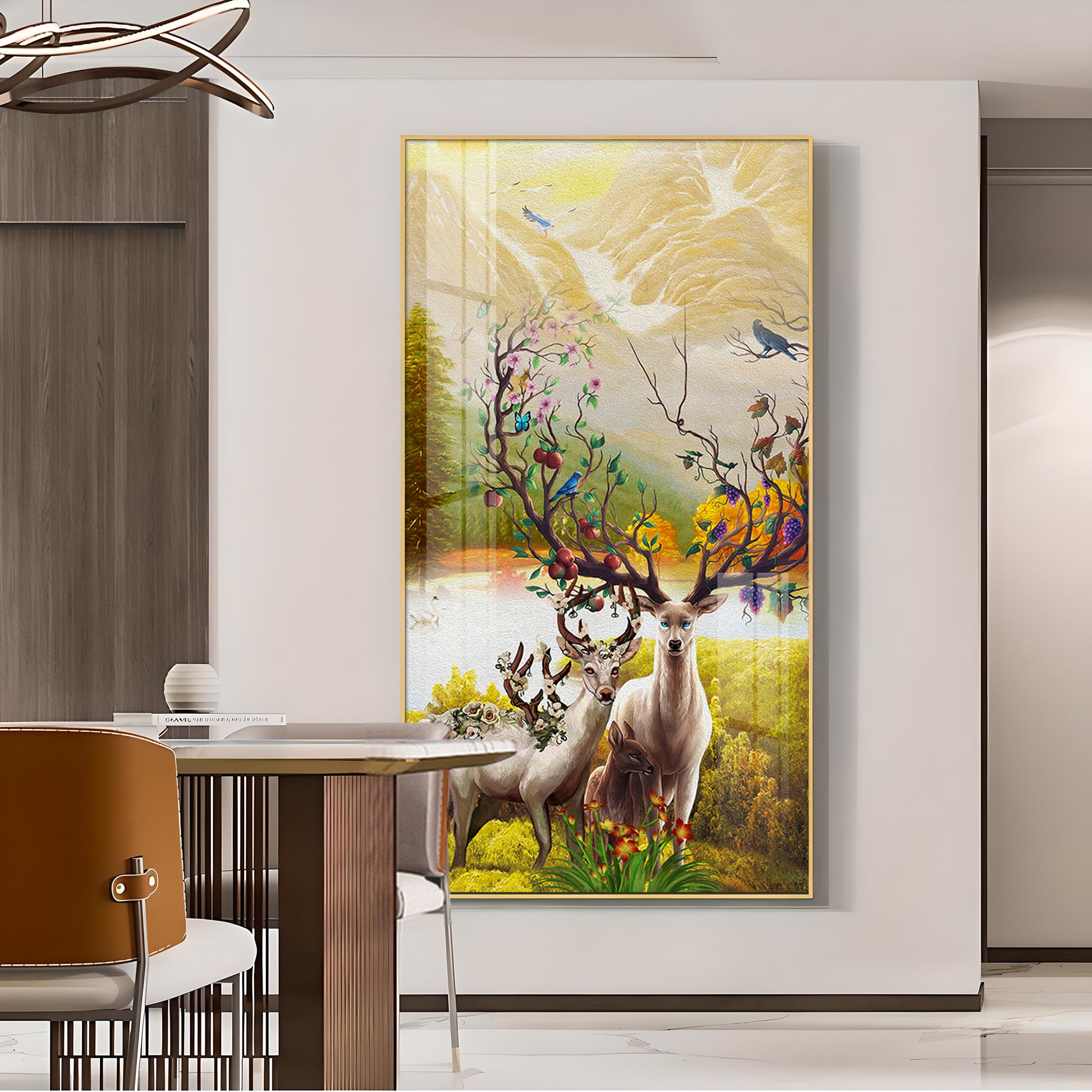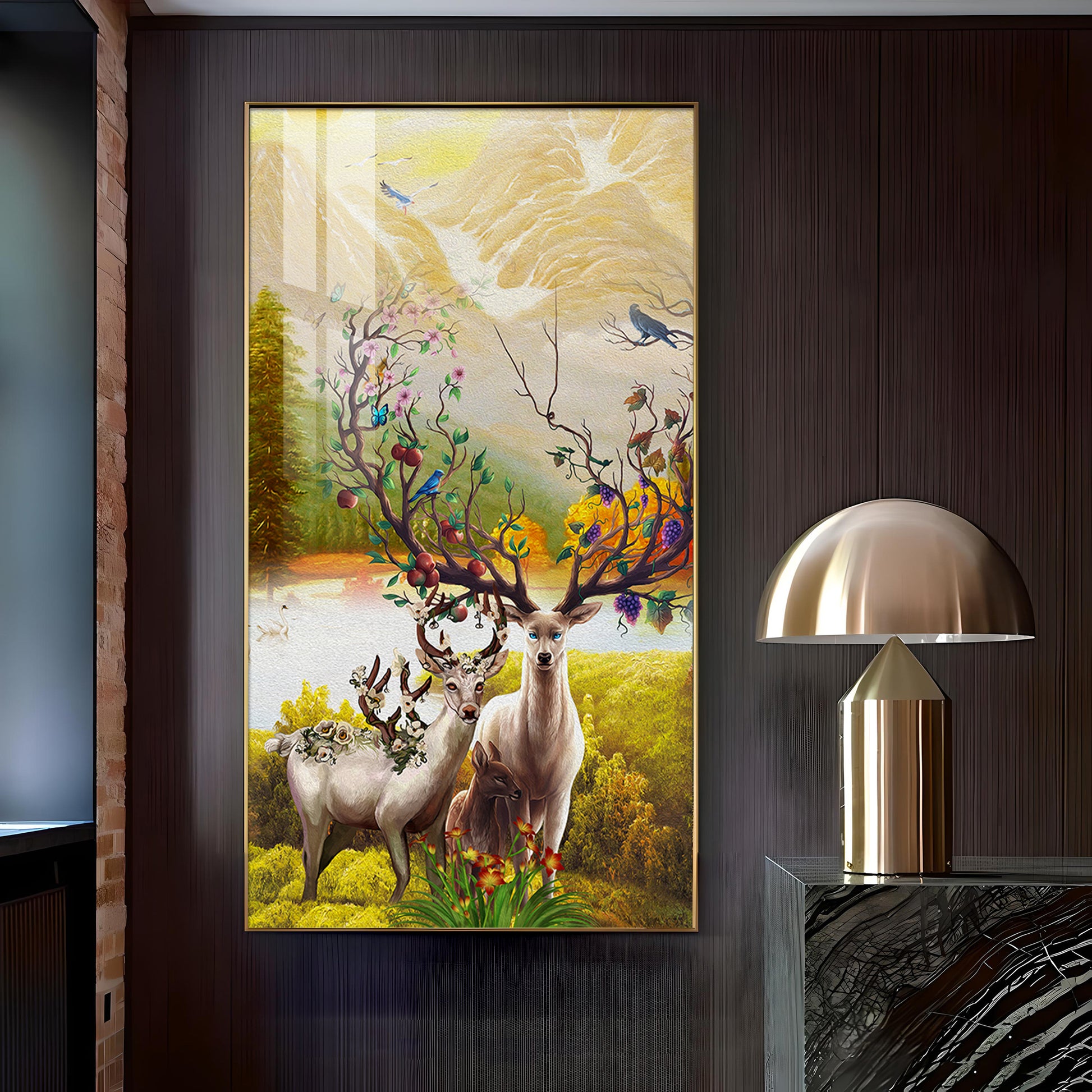 Portrait of Deer and Blossoms Glass Finish Vertical Wall Art