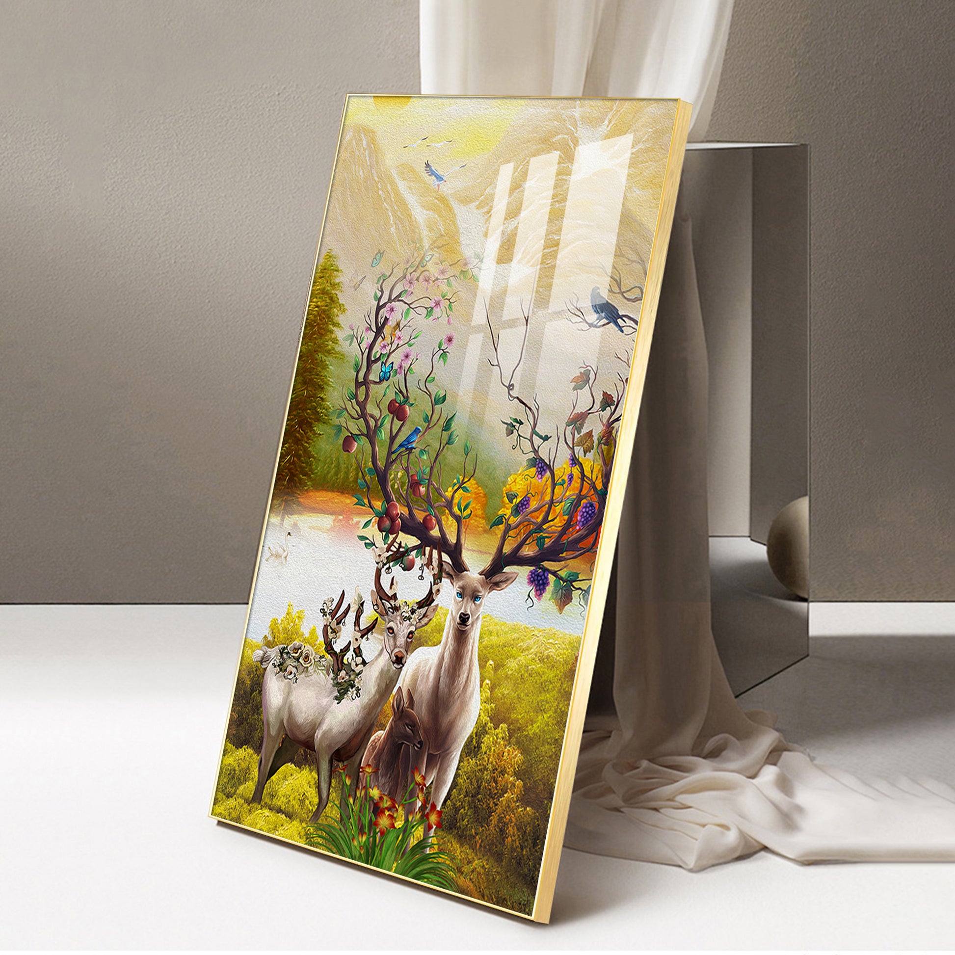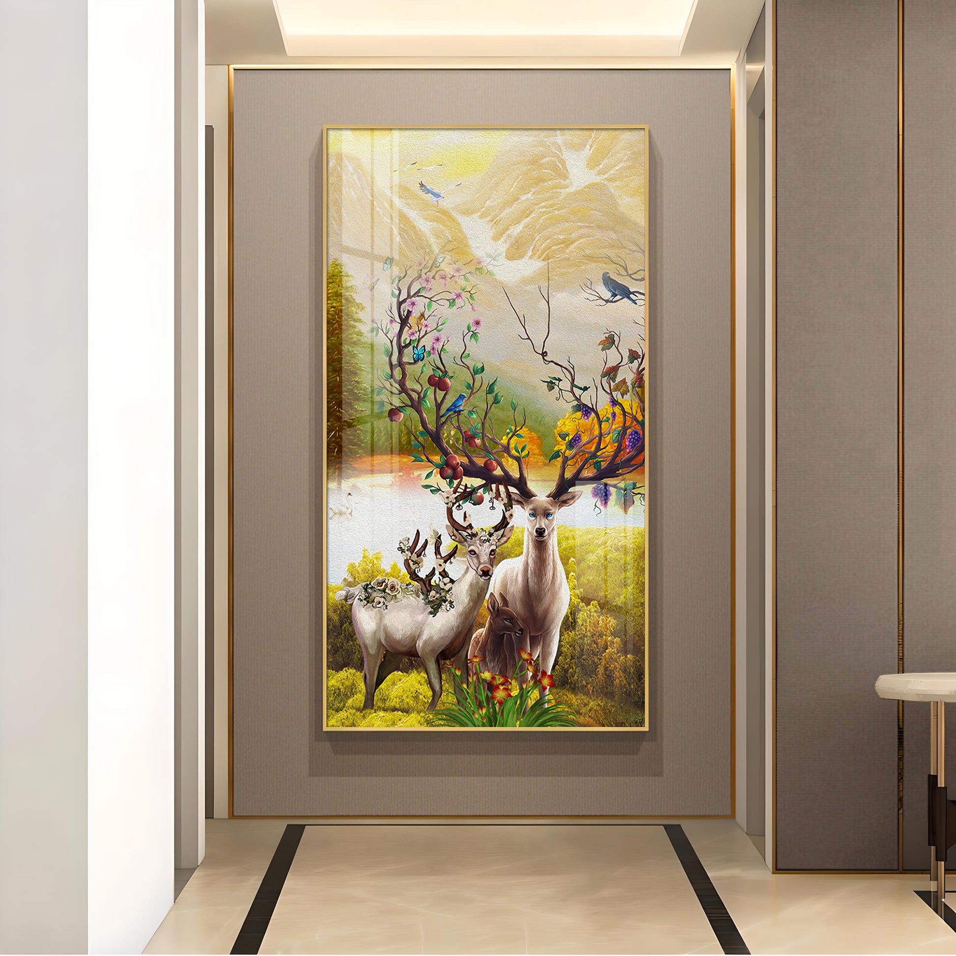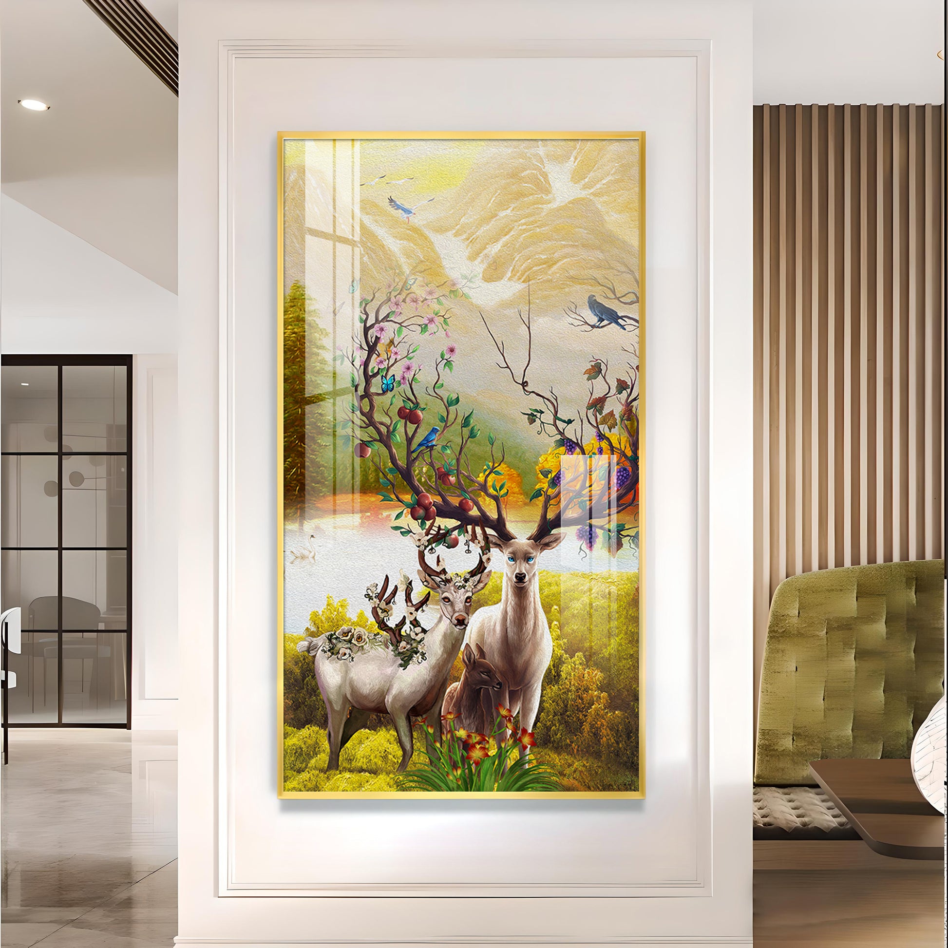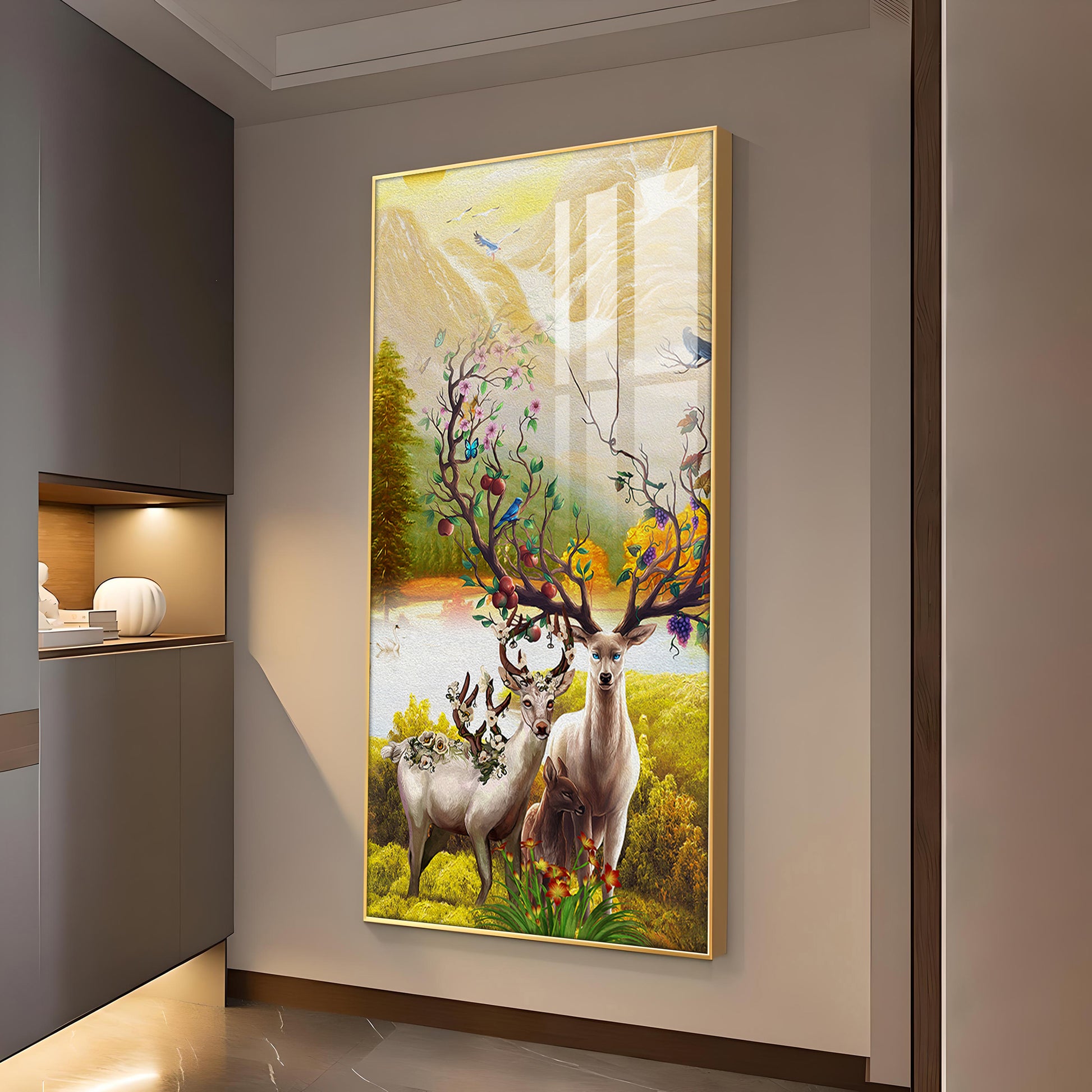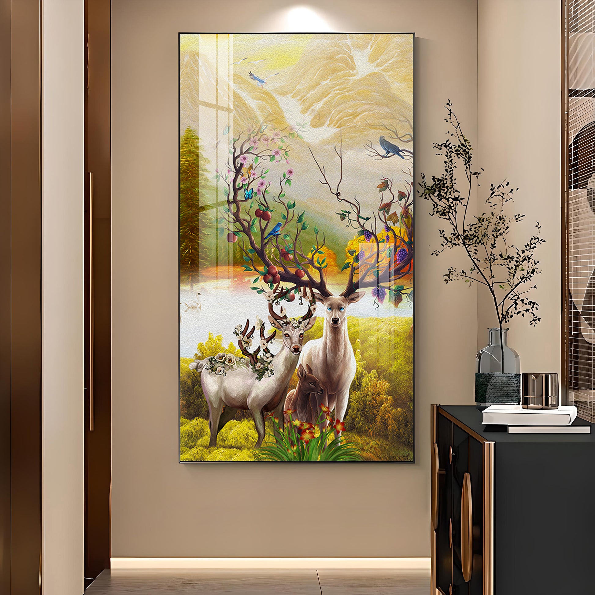 Portrait of Deer and Blossoms Glass Finish Vertical Wall Art