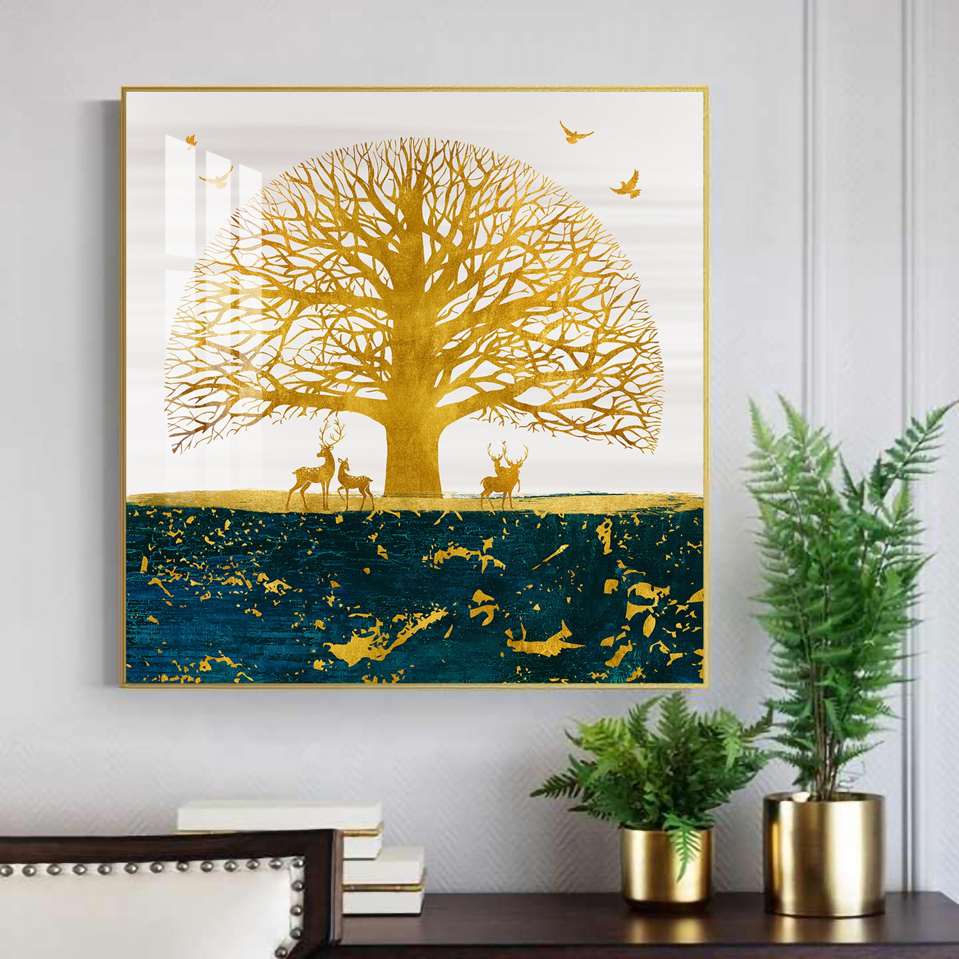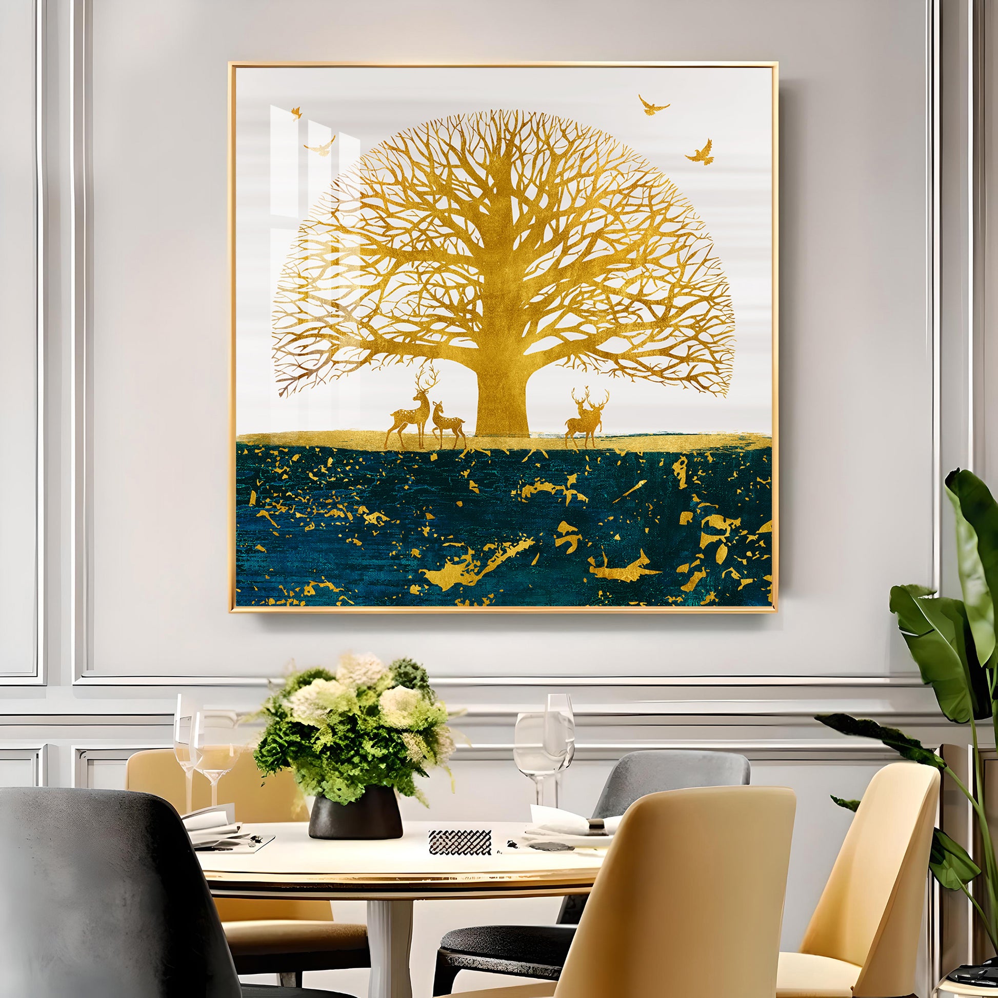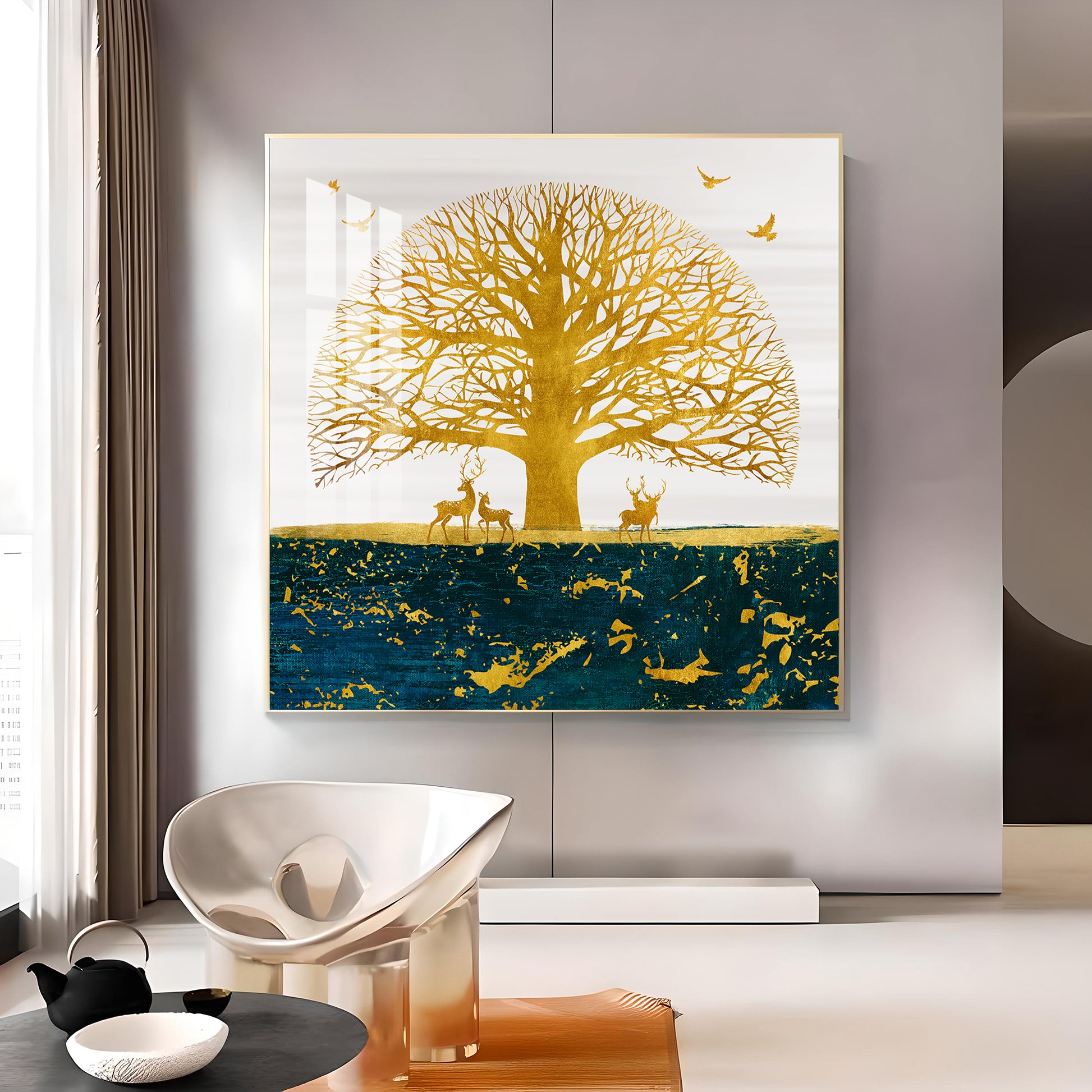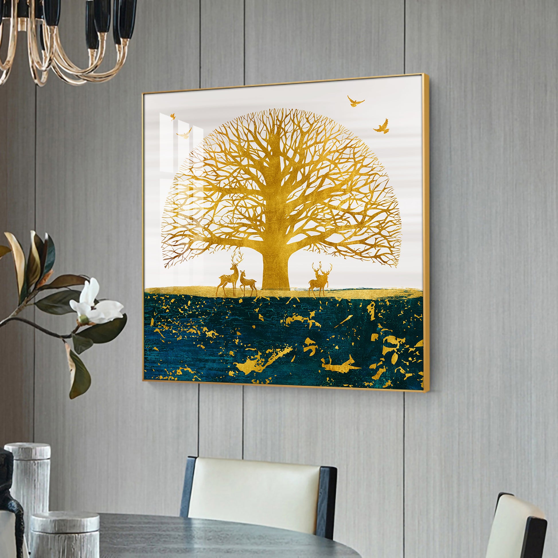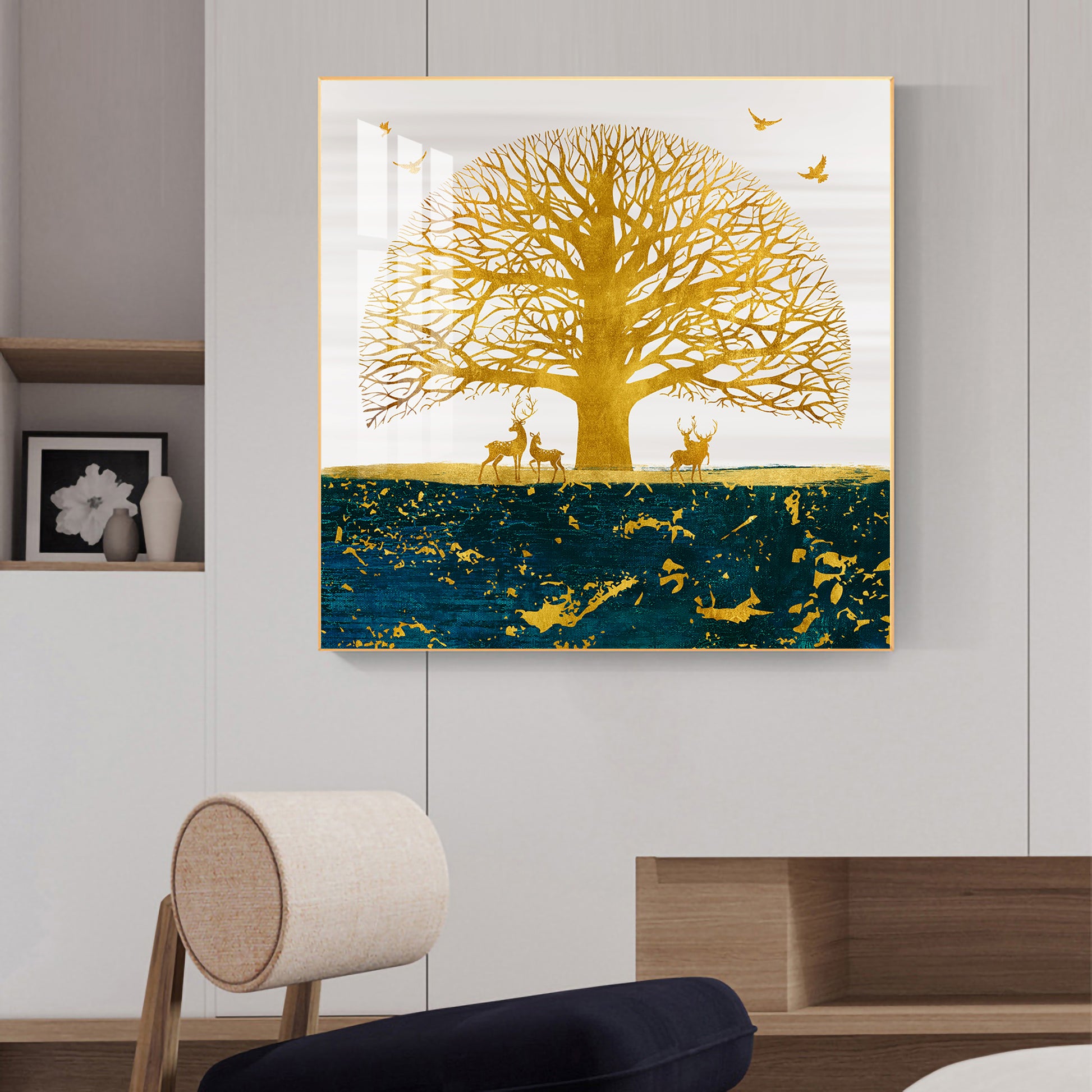 Portrait of Deer and Tree Glass Finish Square Wall Art