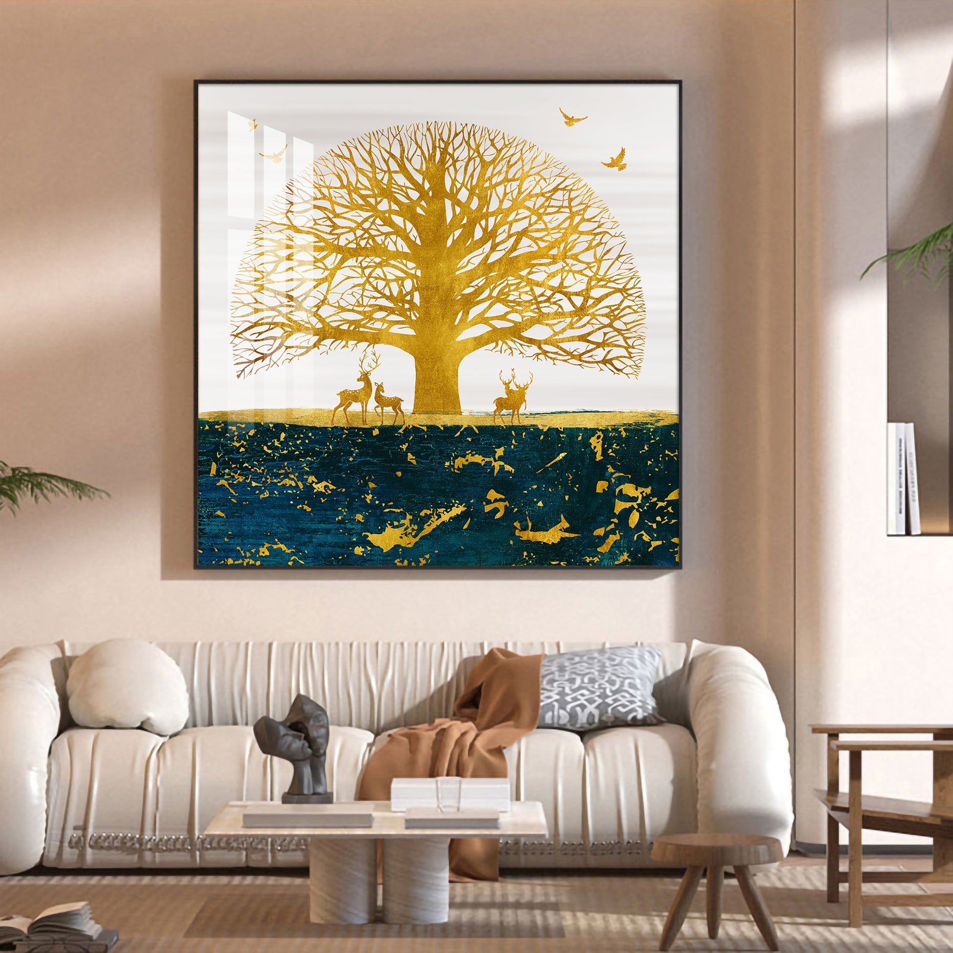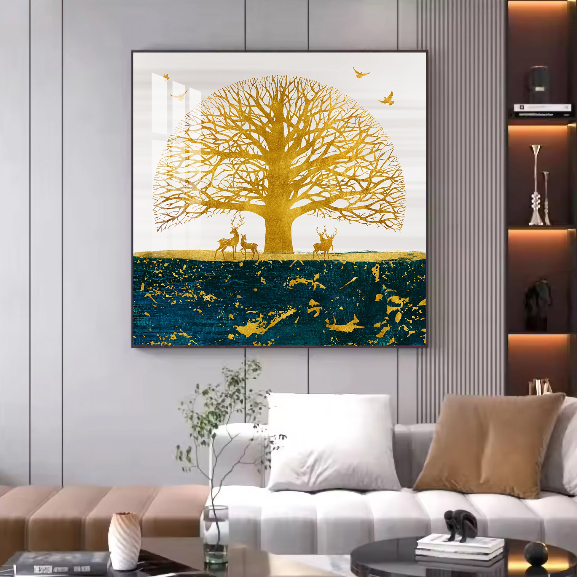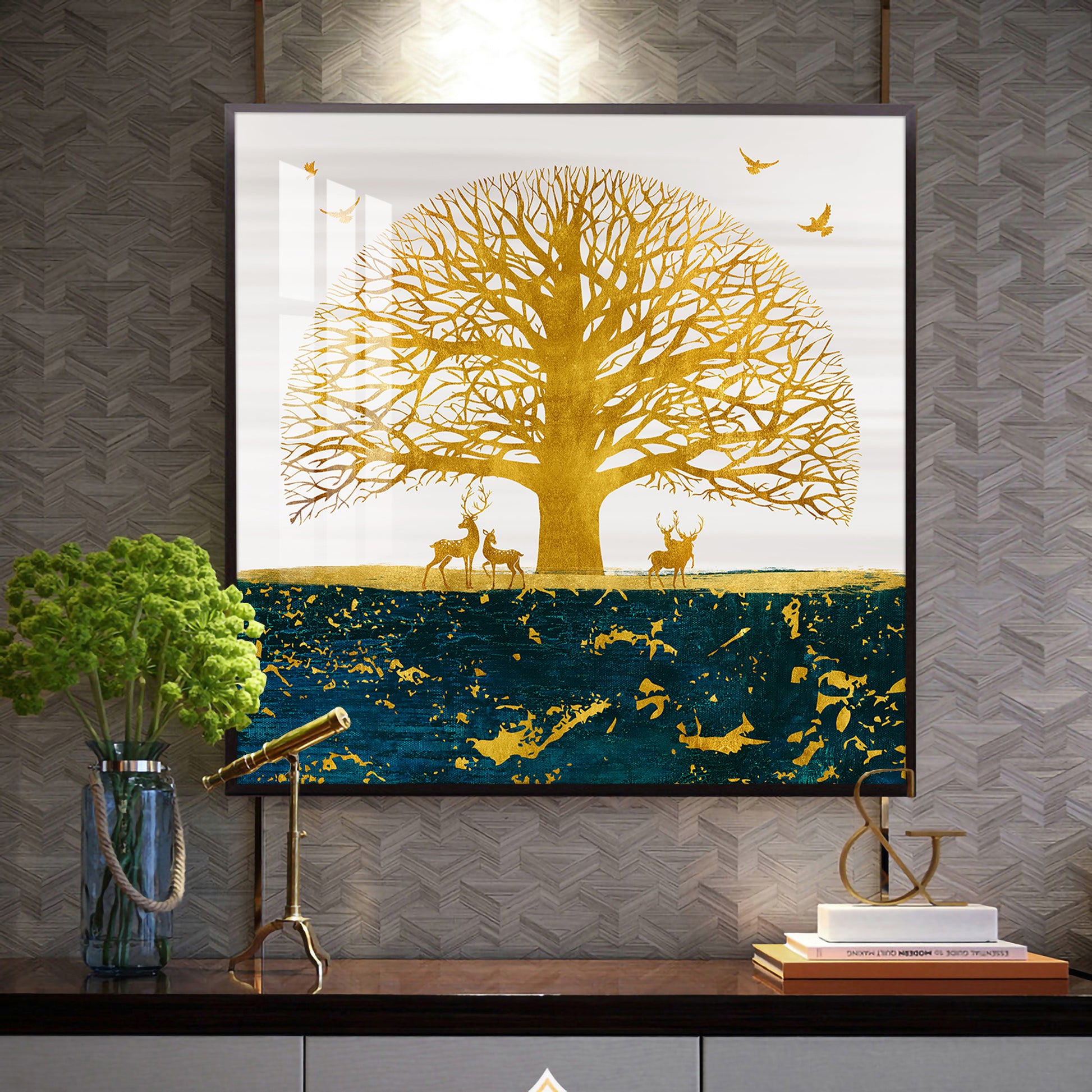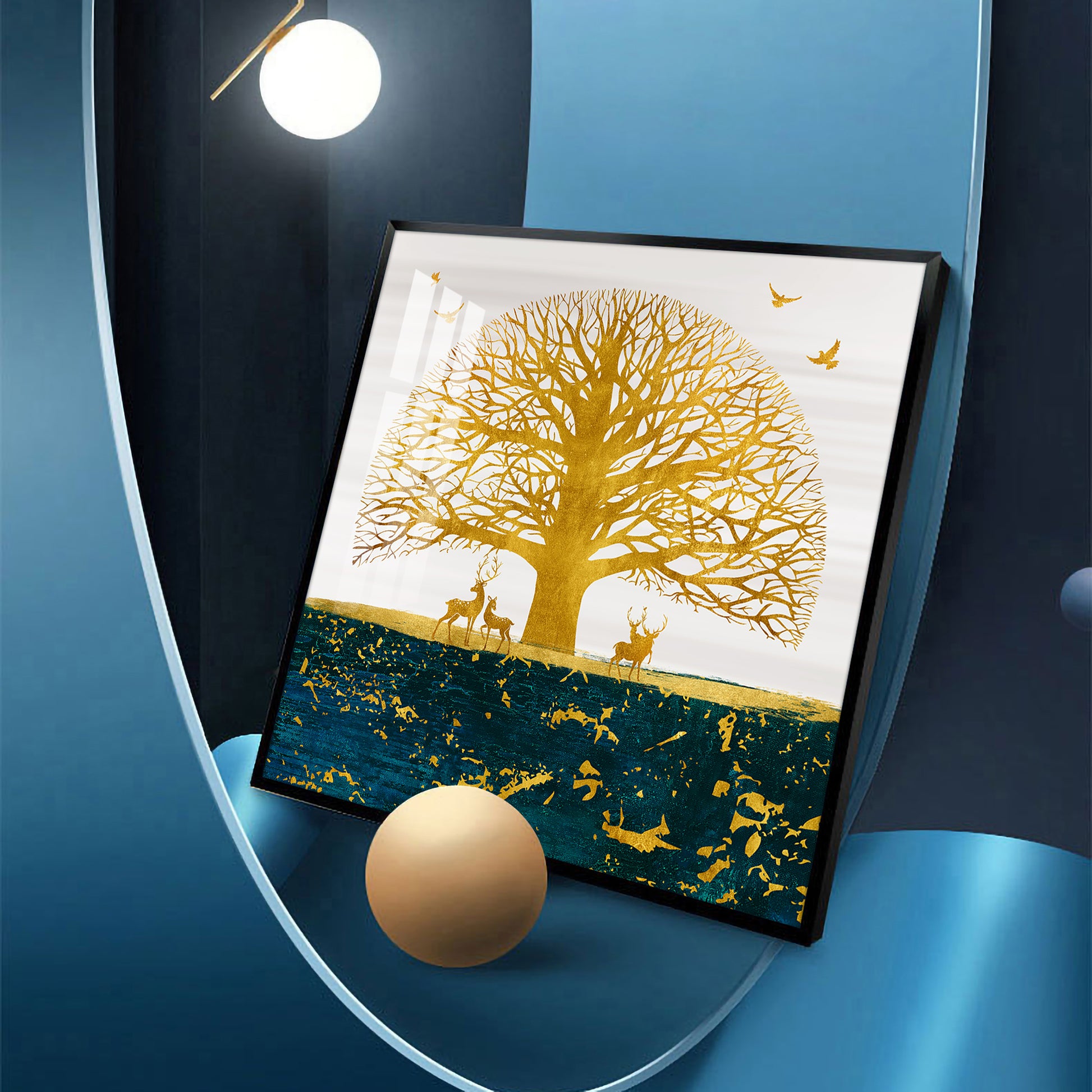 Portrait of Deer and Tree Glass Finish Square Wall Art