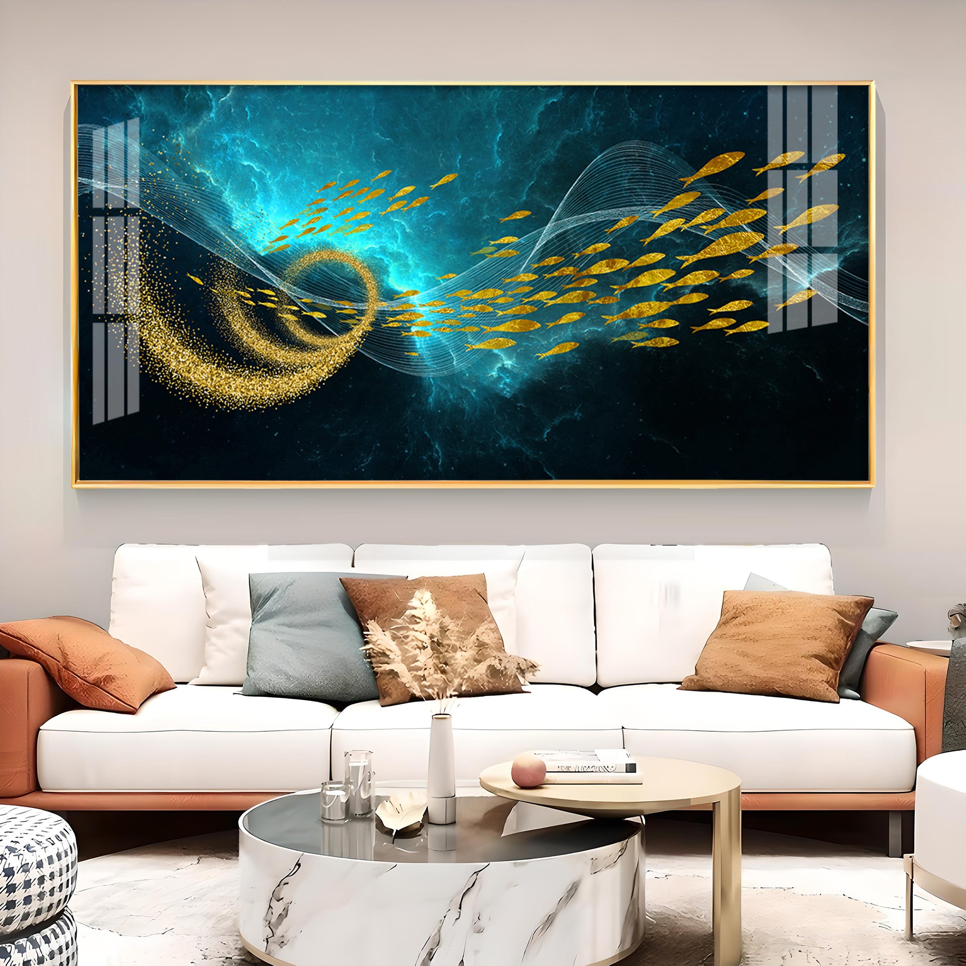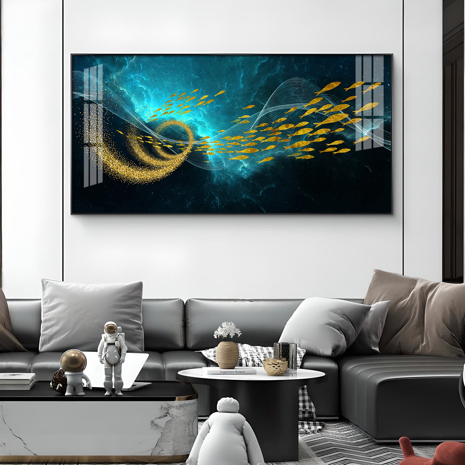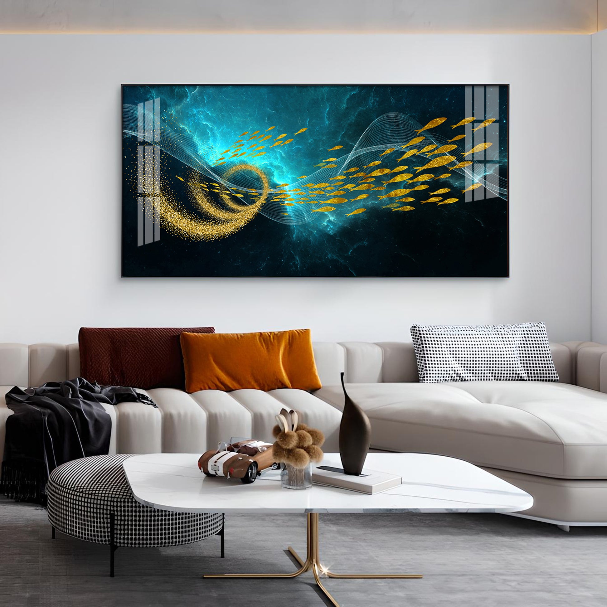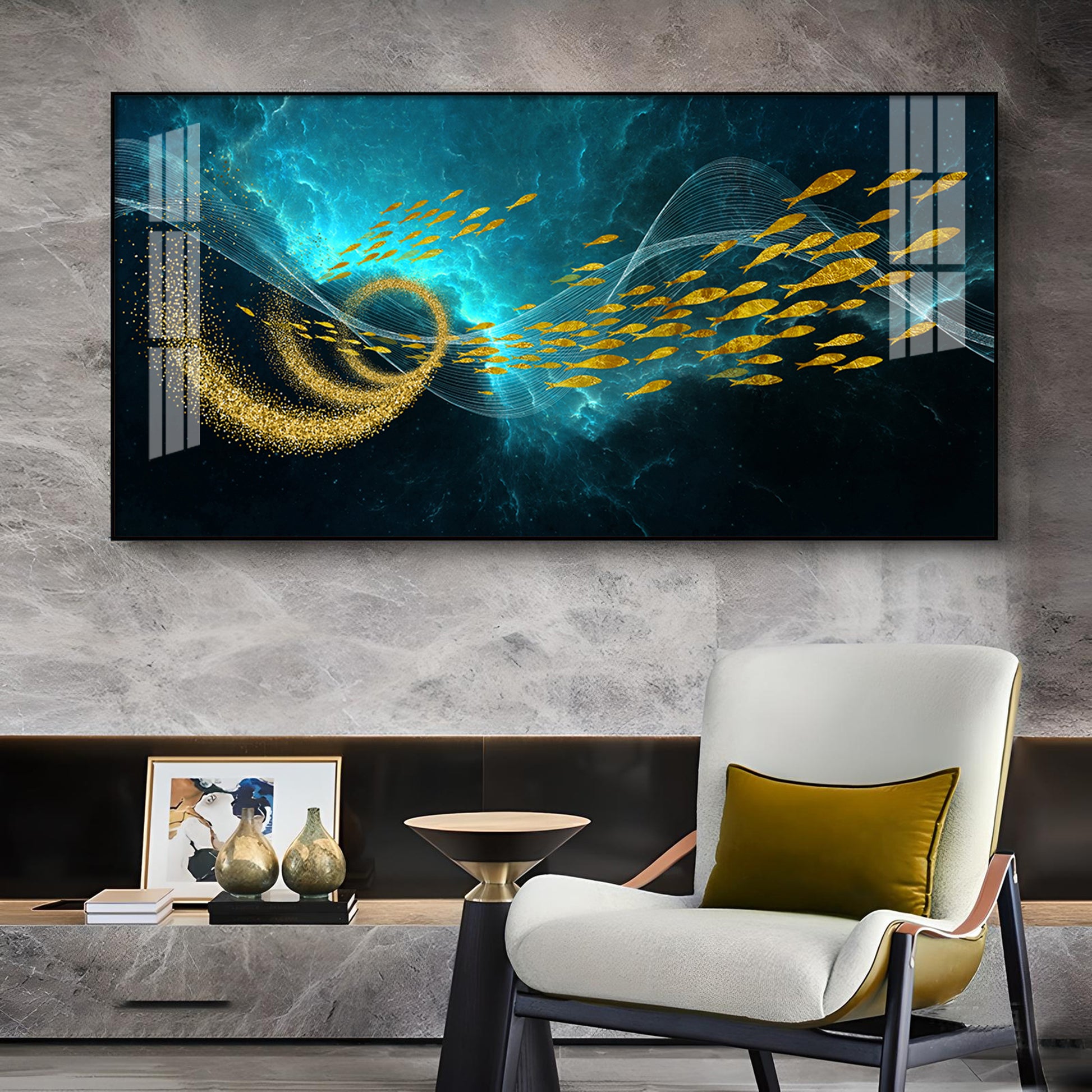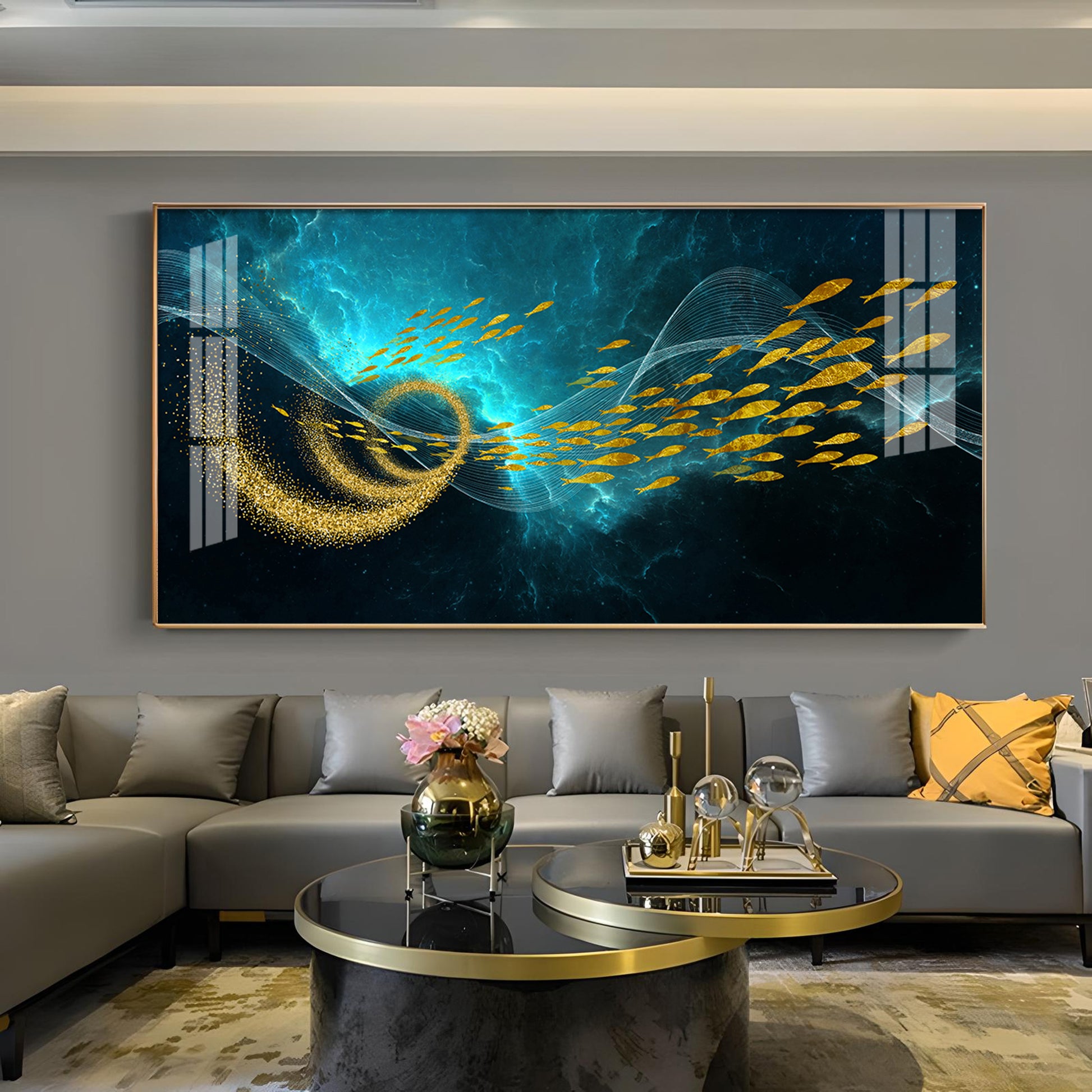 School Of Gold Fish Glass Finish Horizontal Wall Art