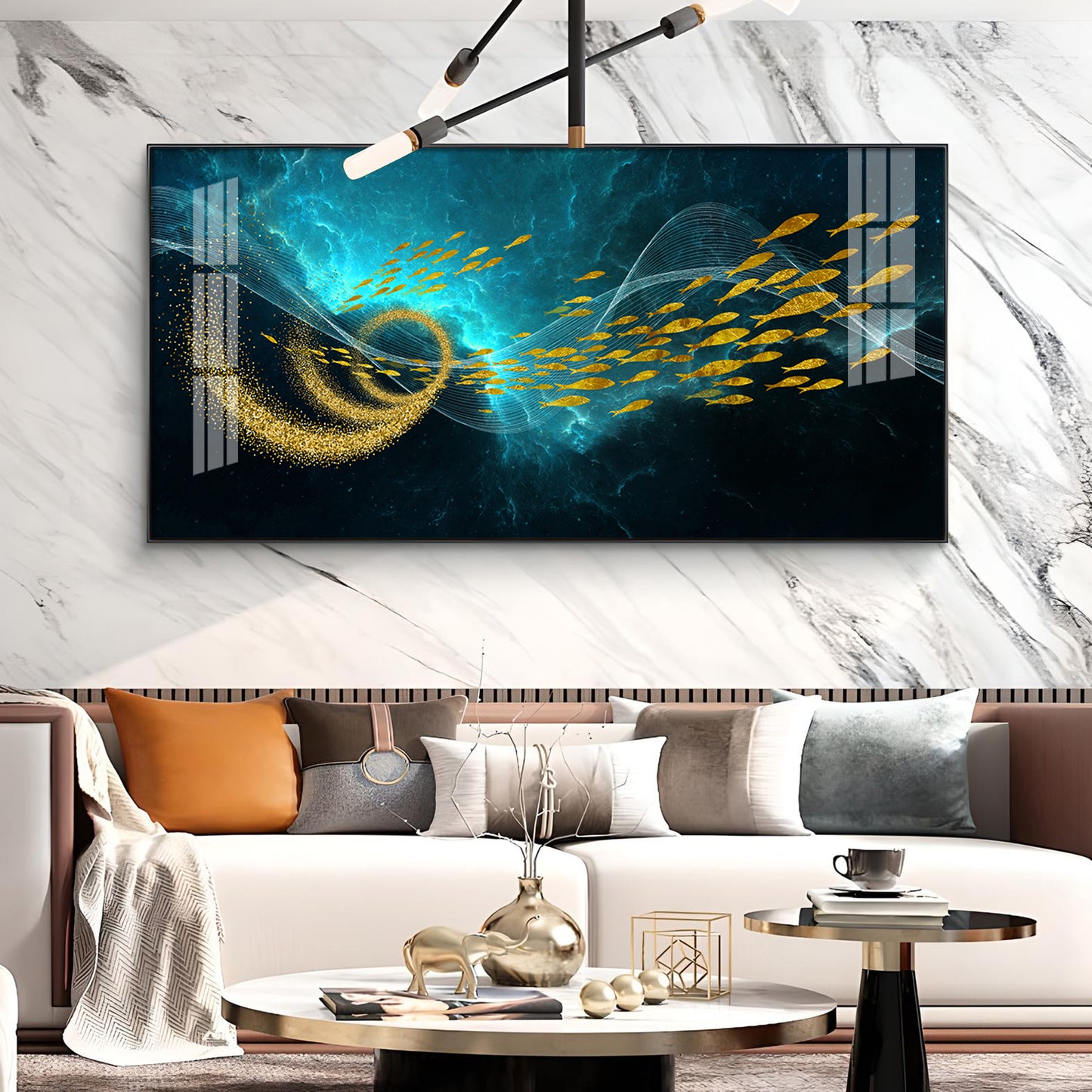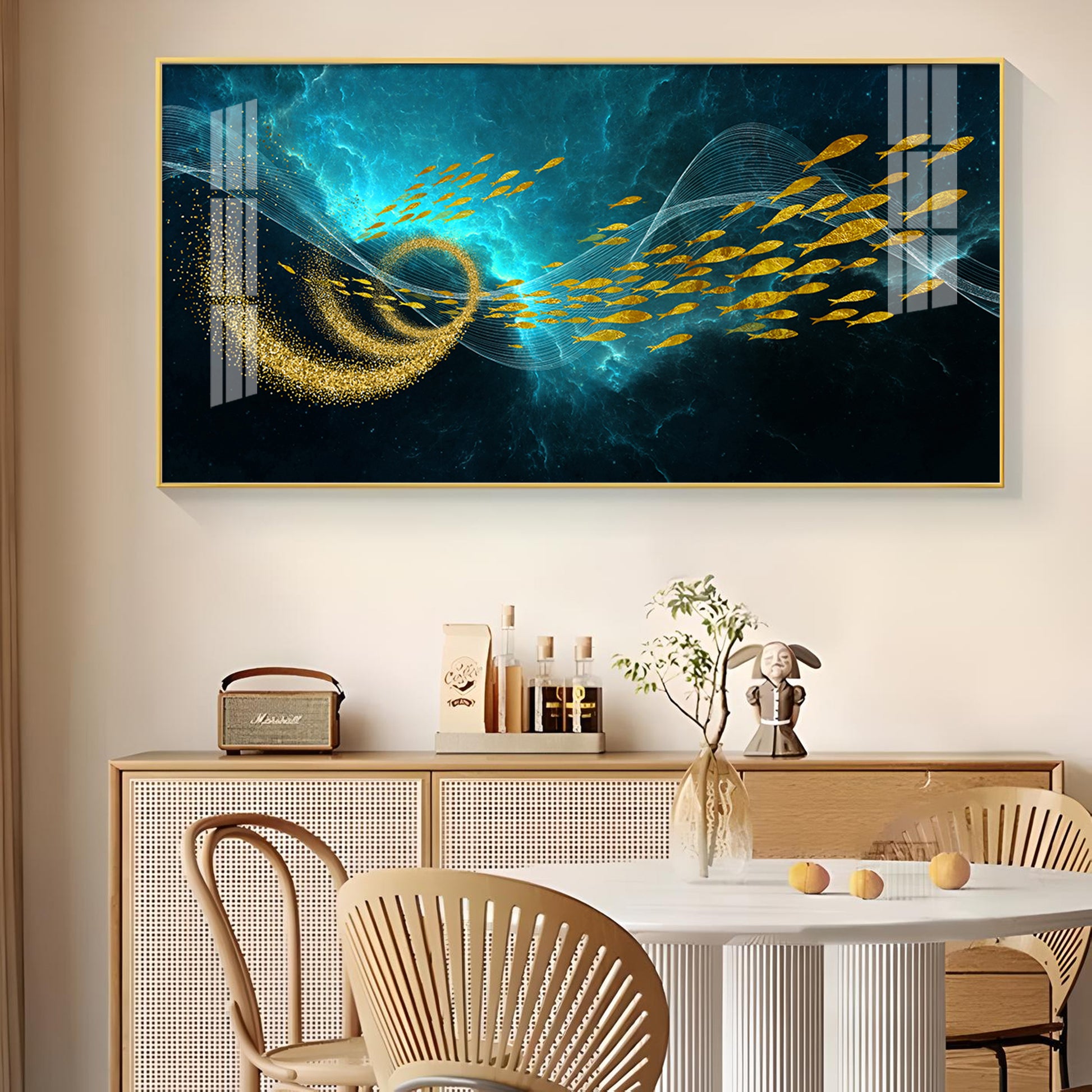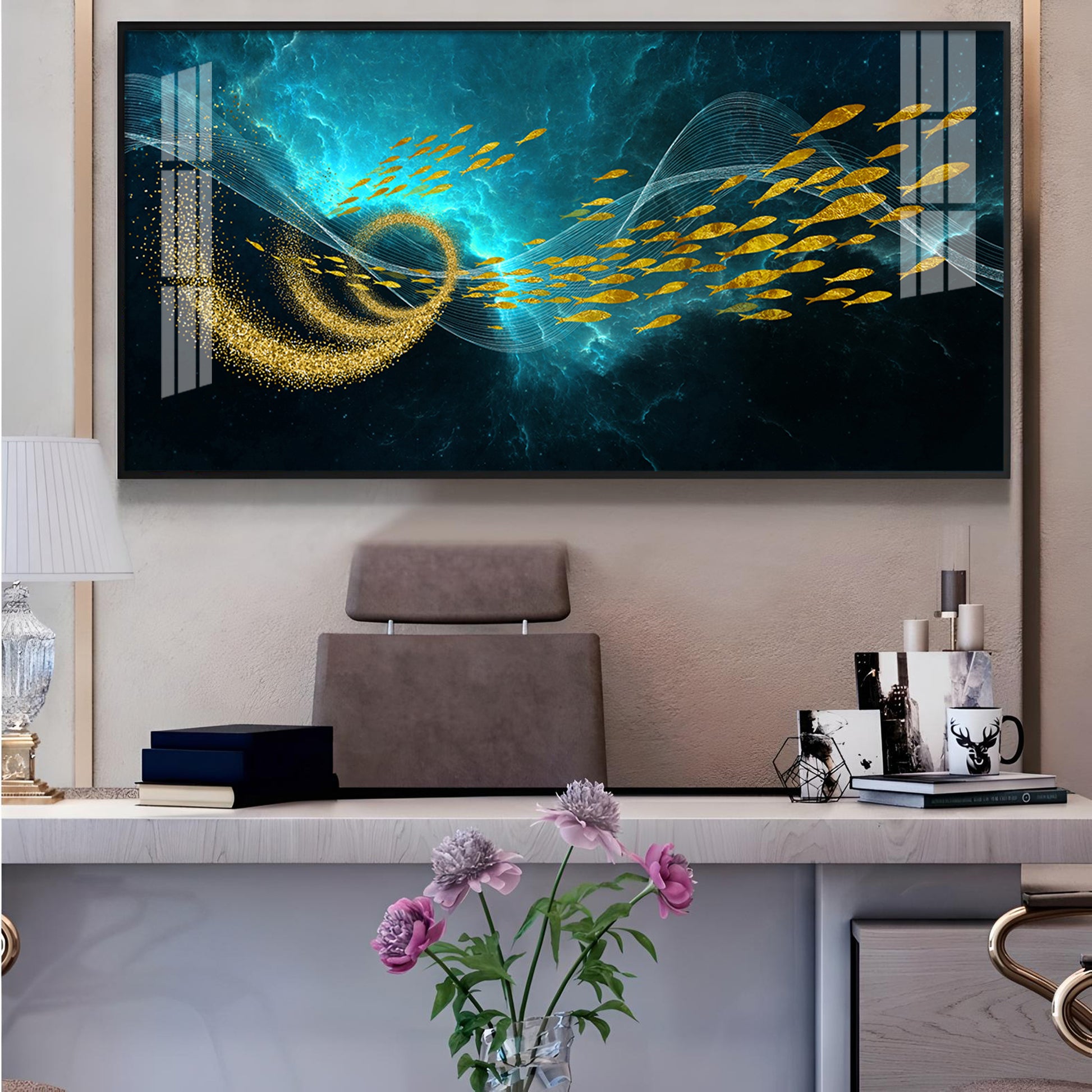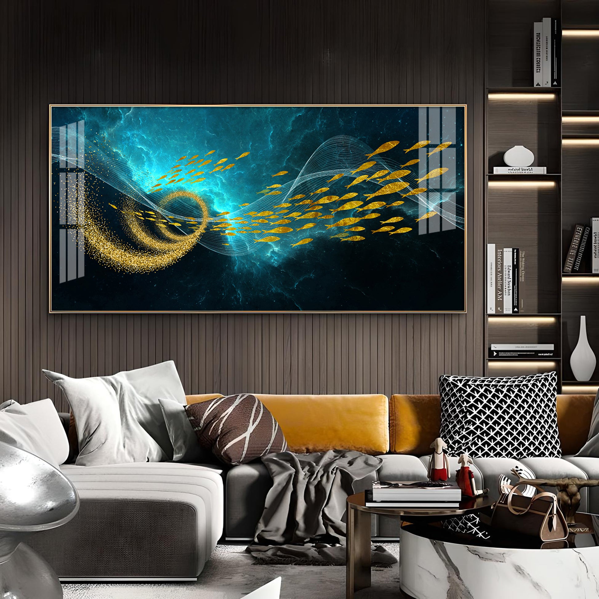 School Of Gold Fish Glass Finish Horizontal Wall Art