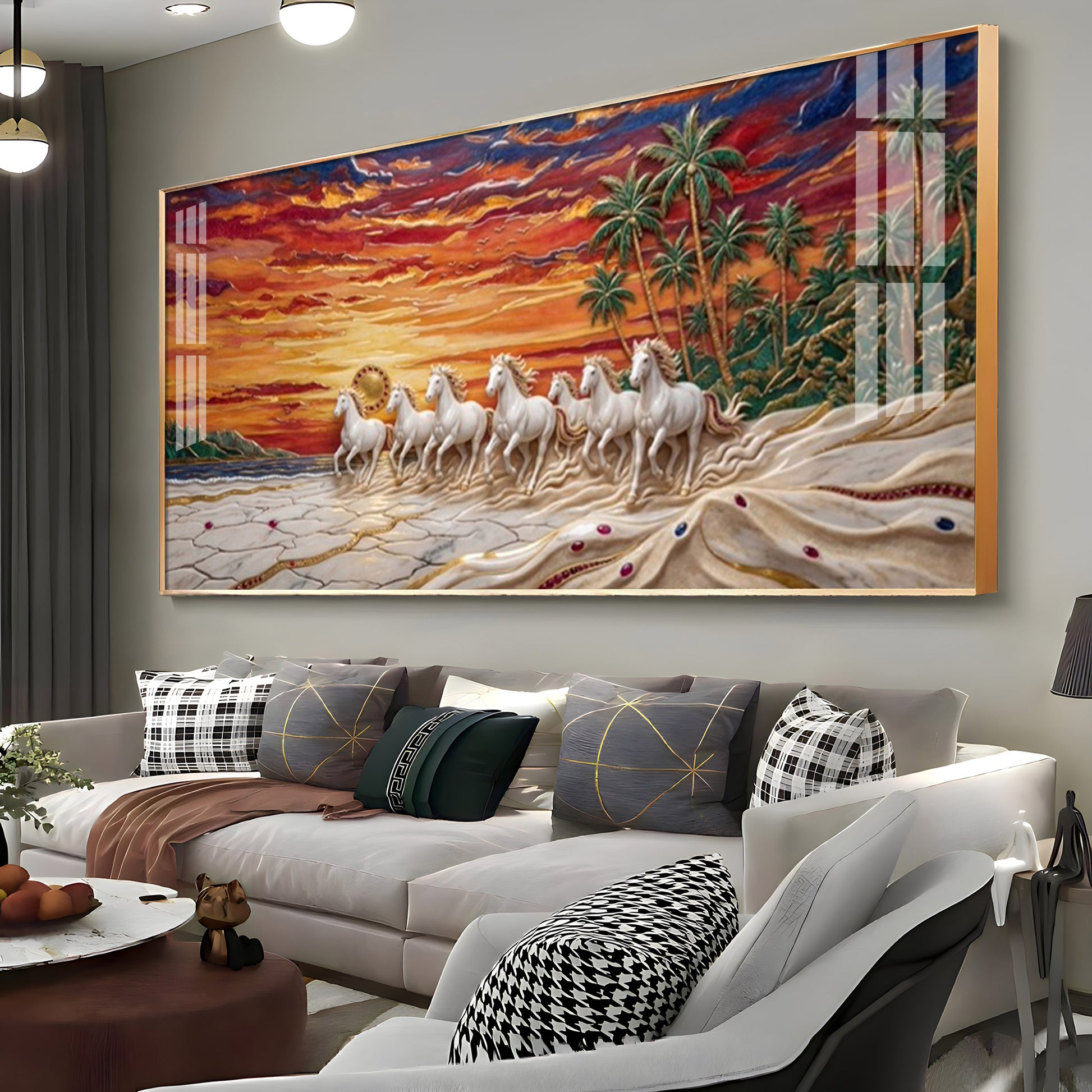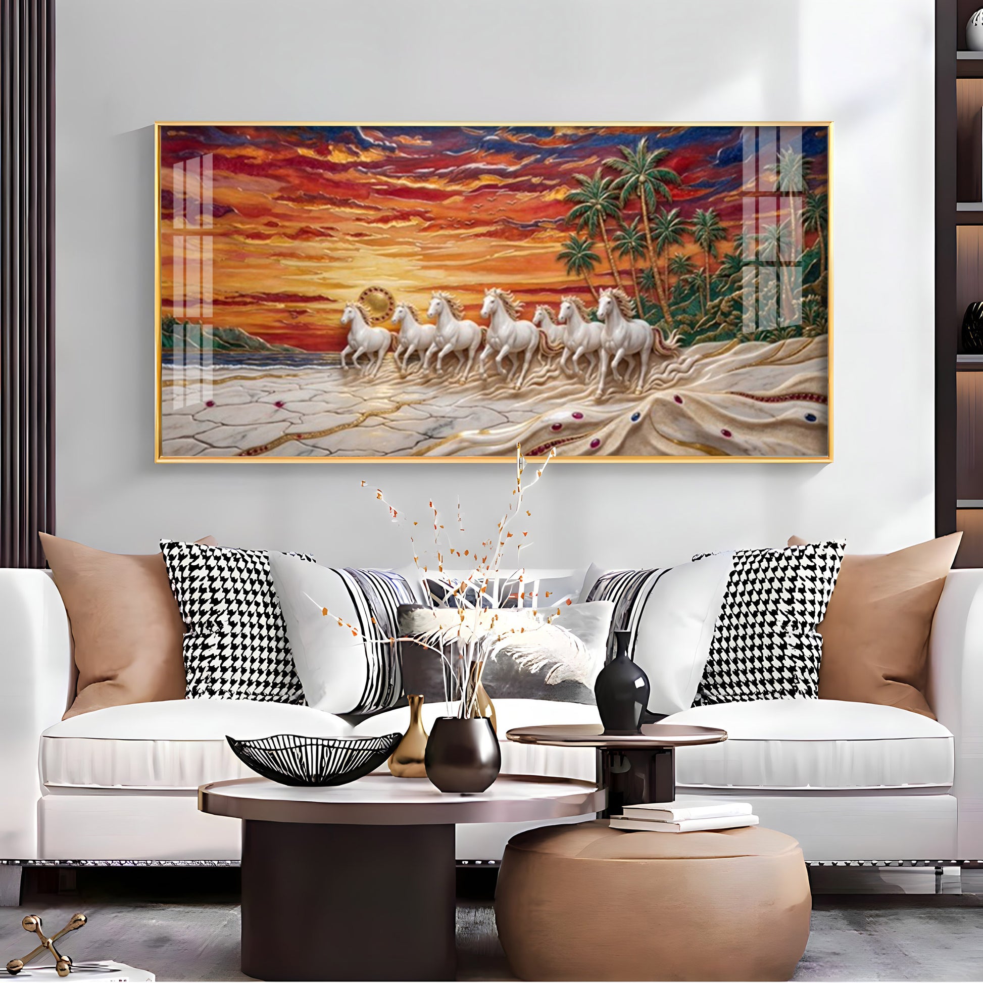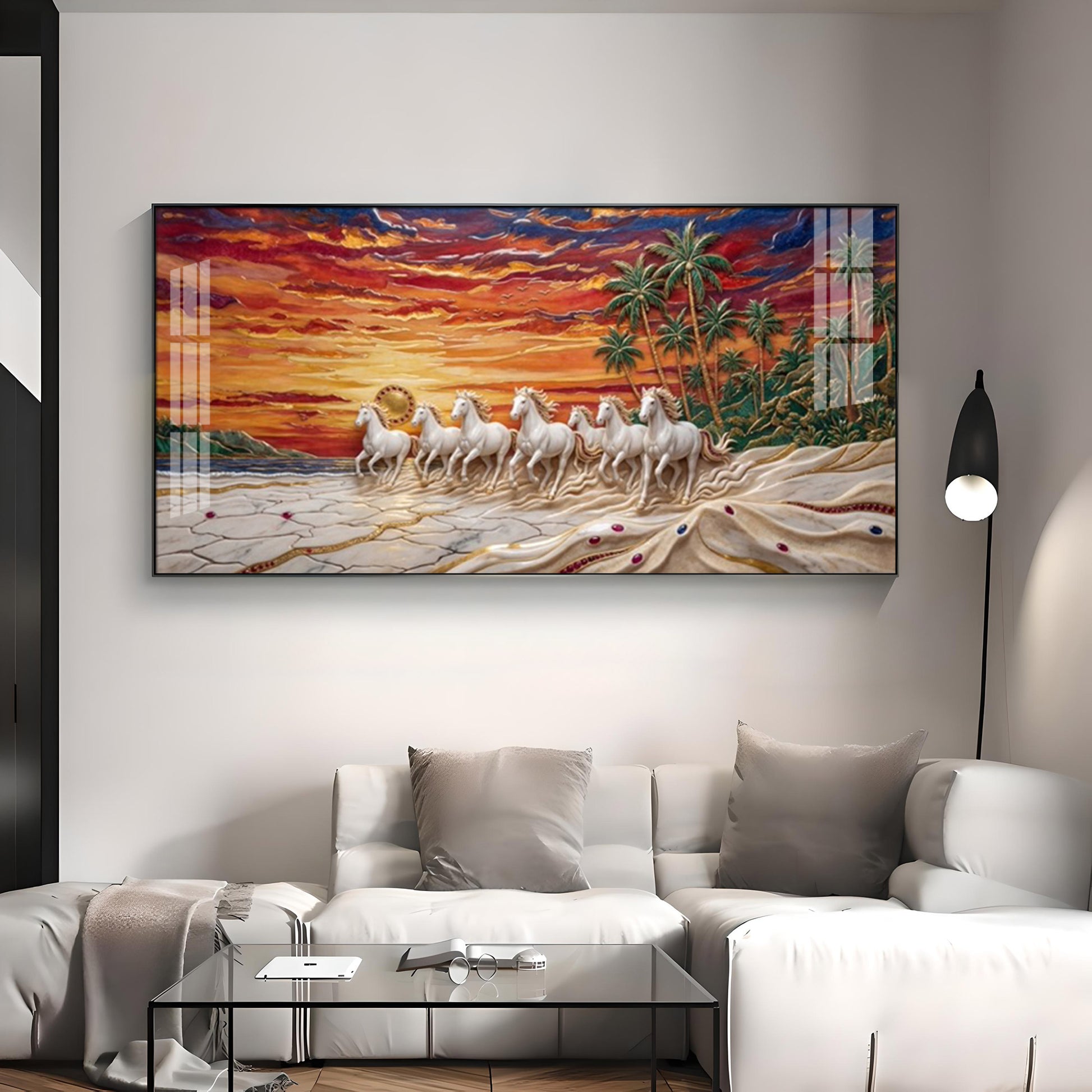 Seven Horses Vastu Glass Finish Horizontal Wall Art