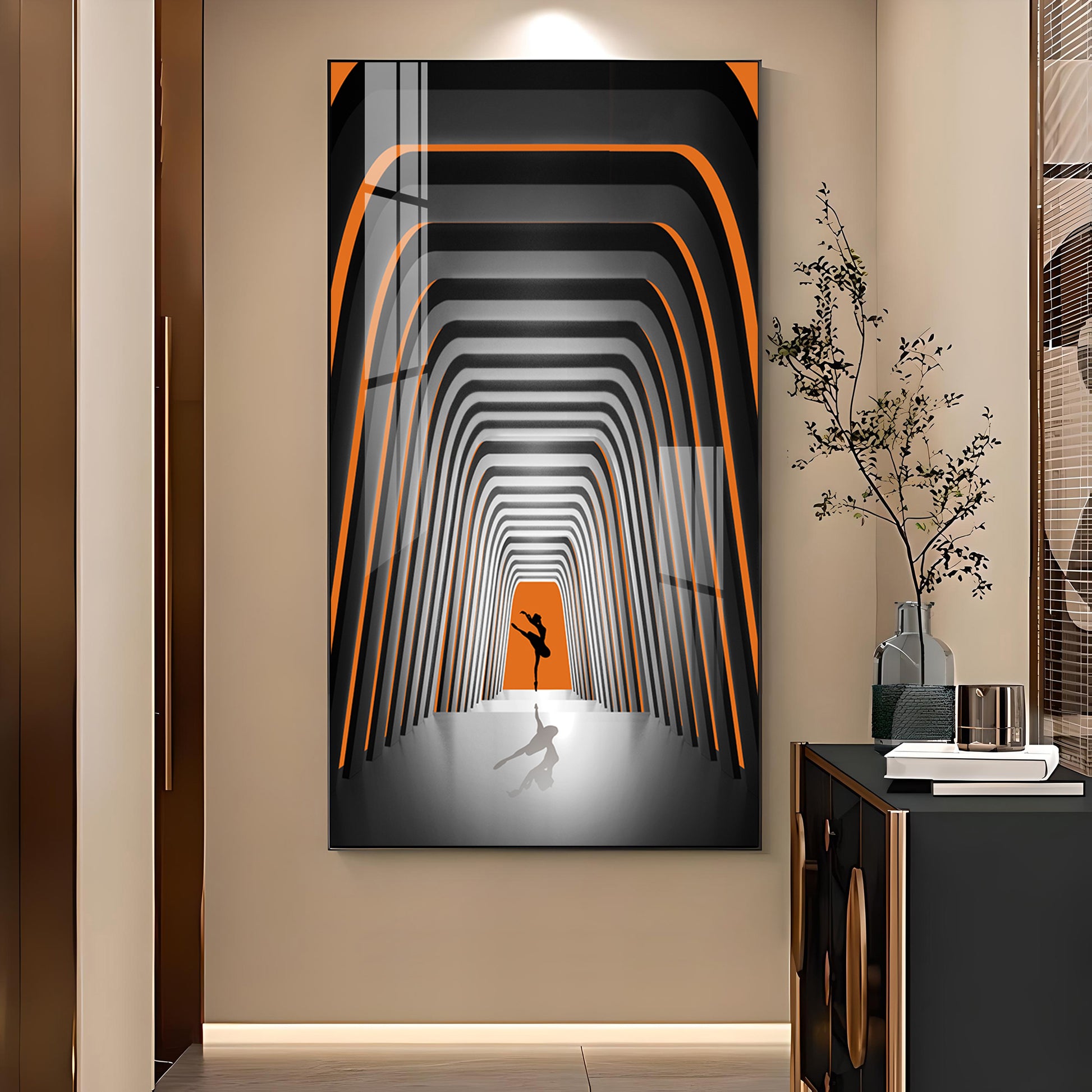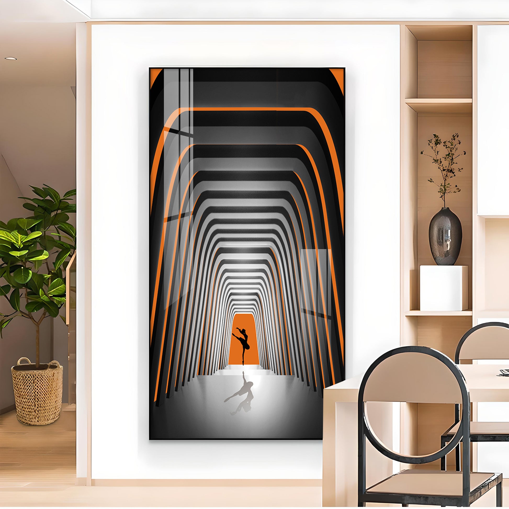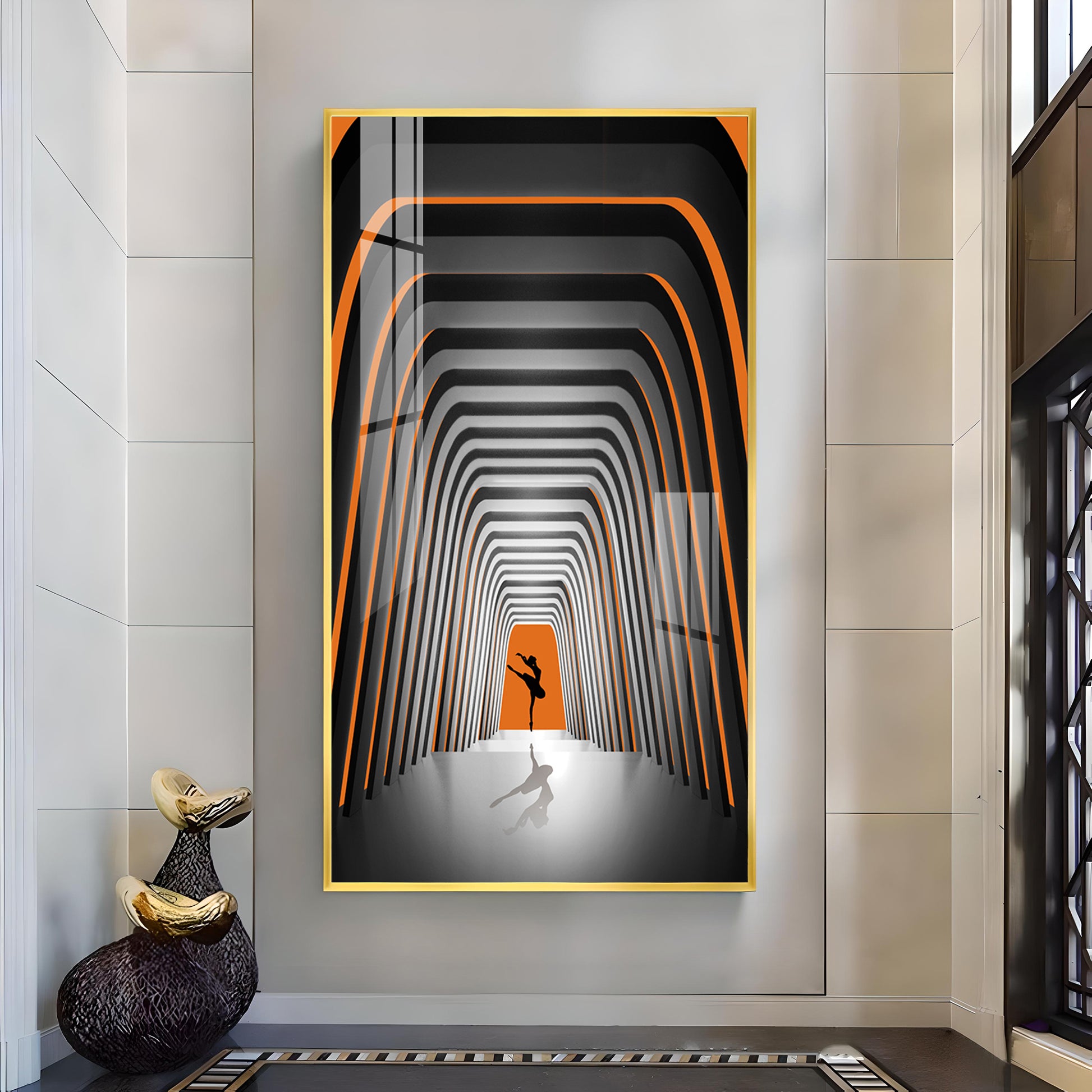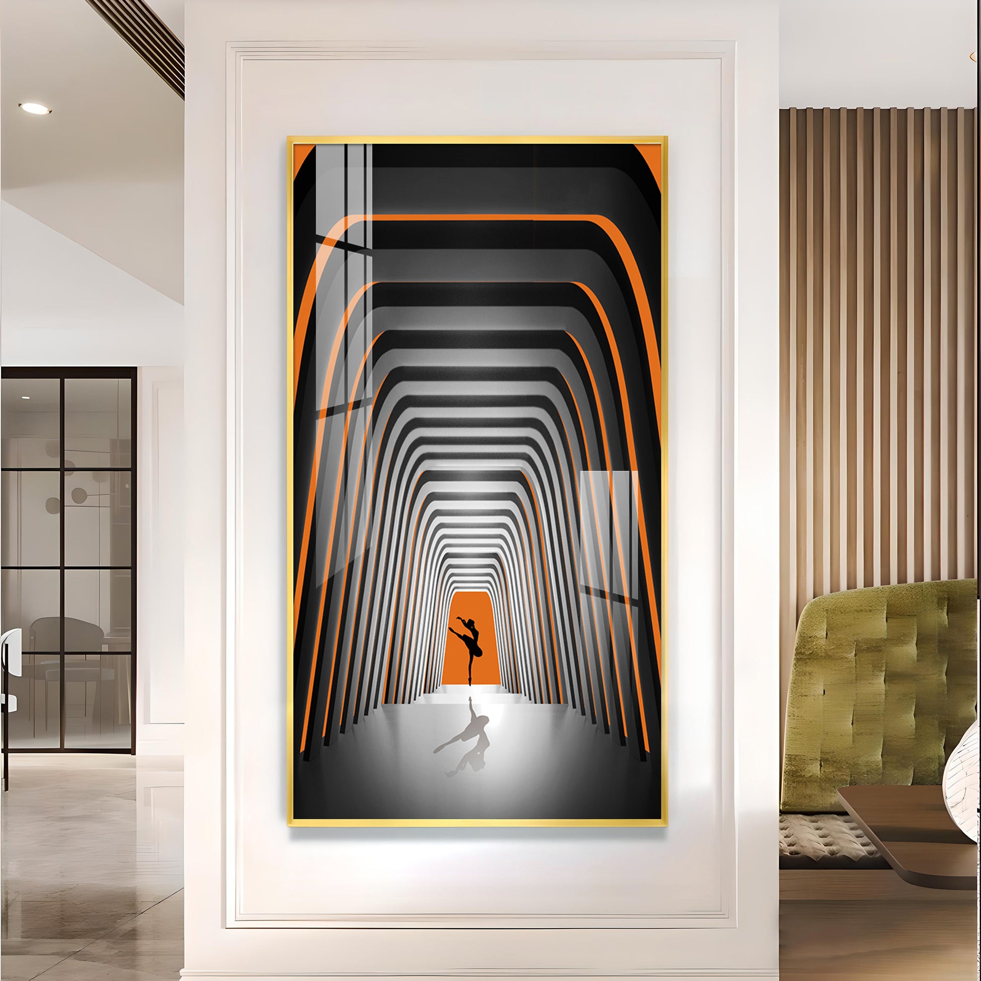 Striped Illusion Of Dancing Girl Glass Finish Vertical Wall Art