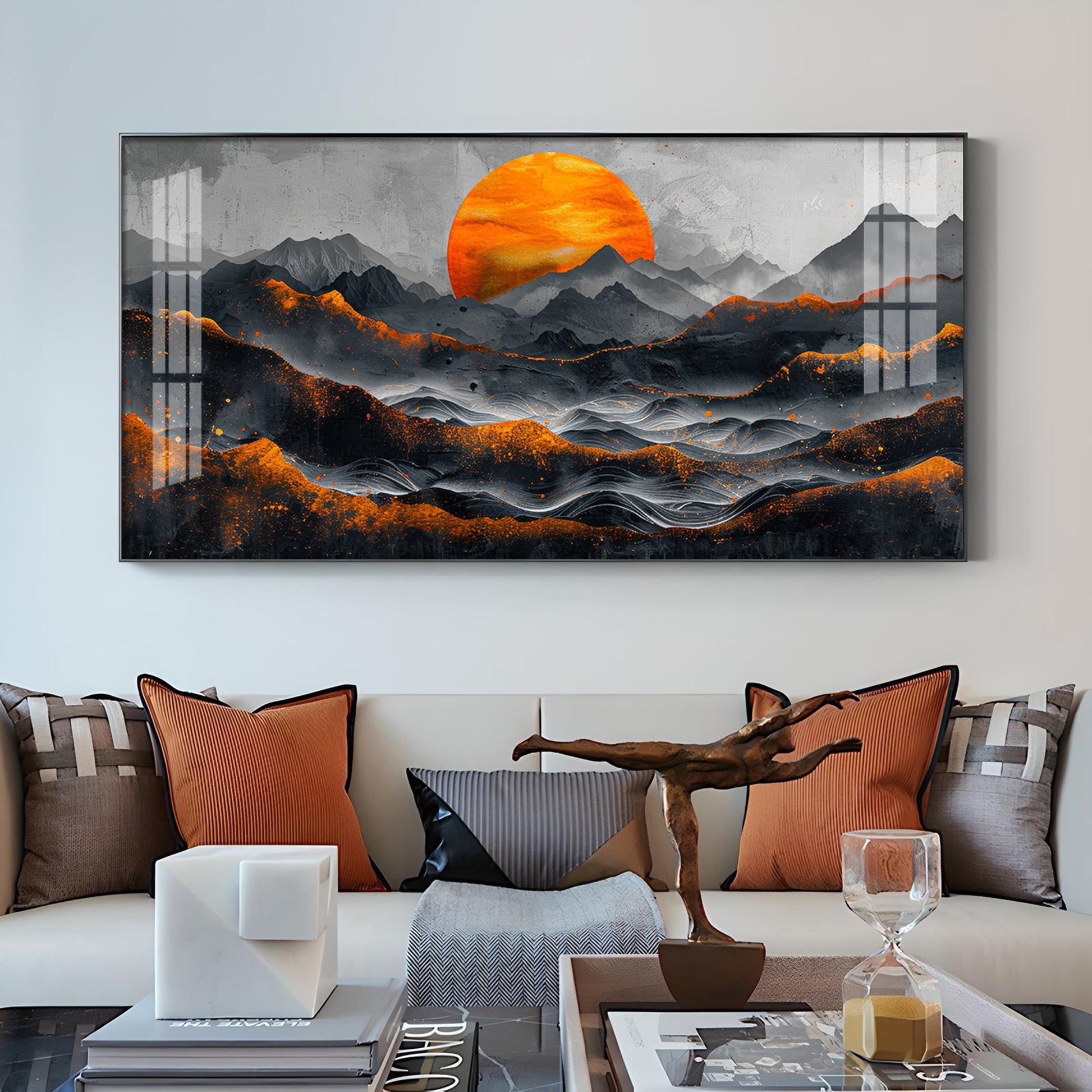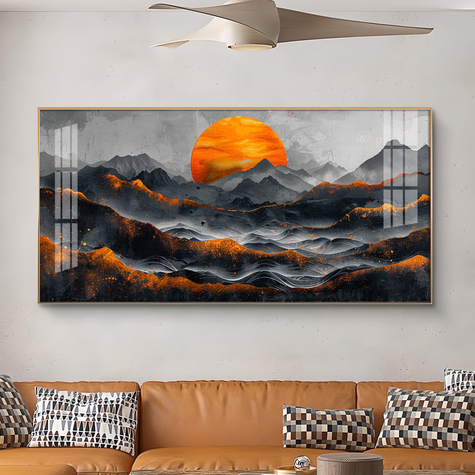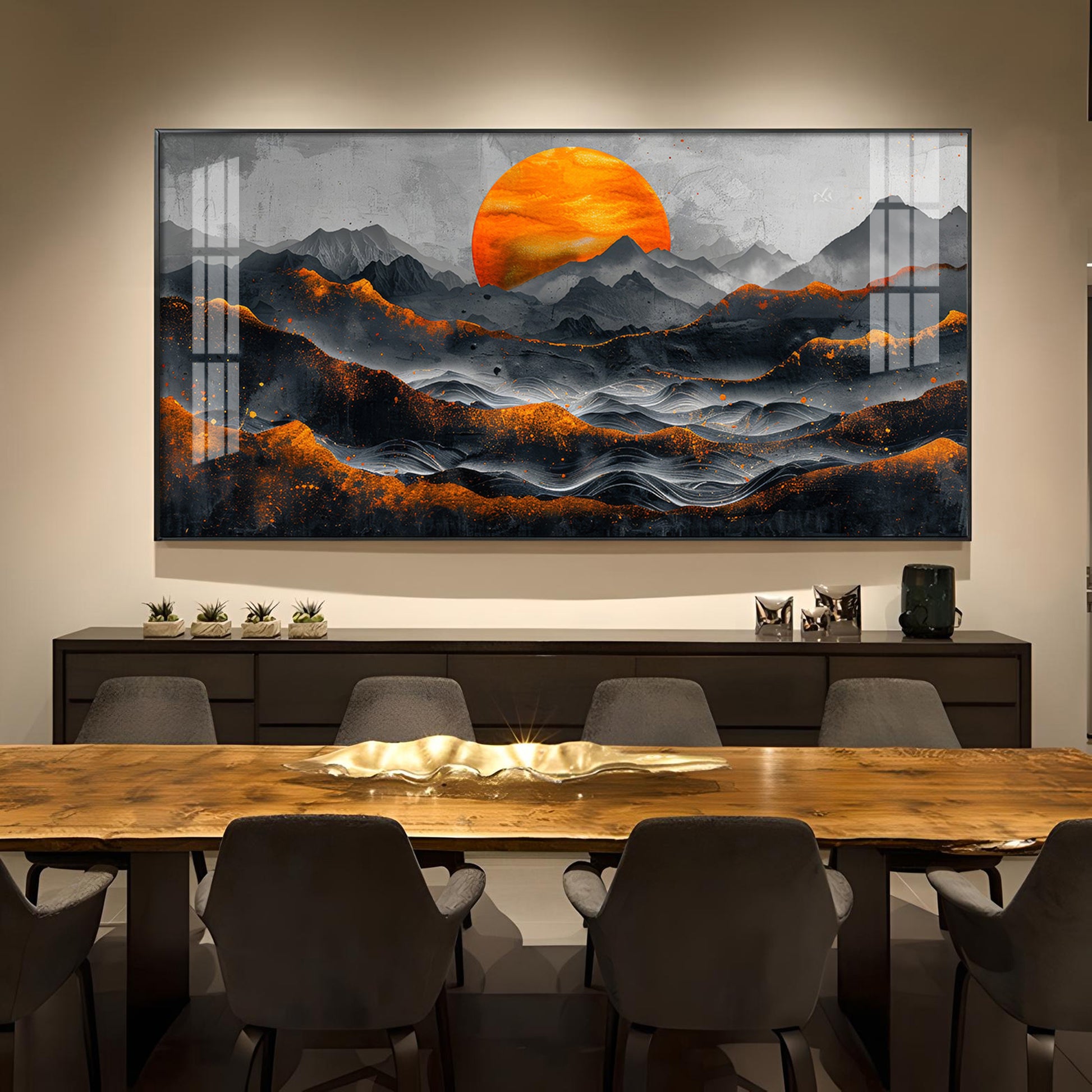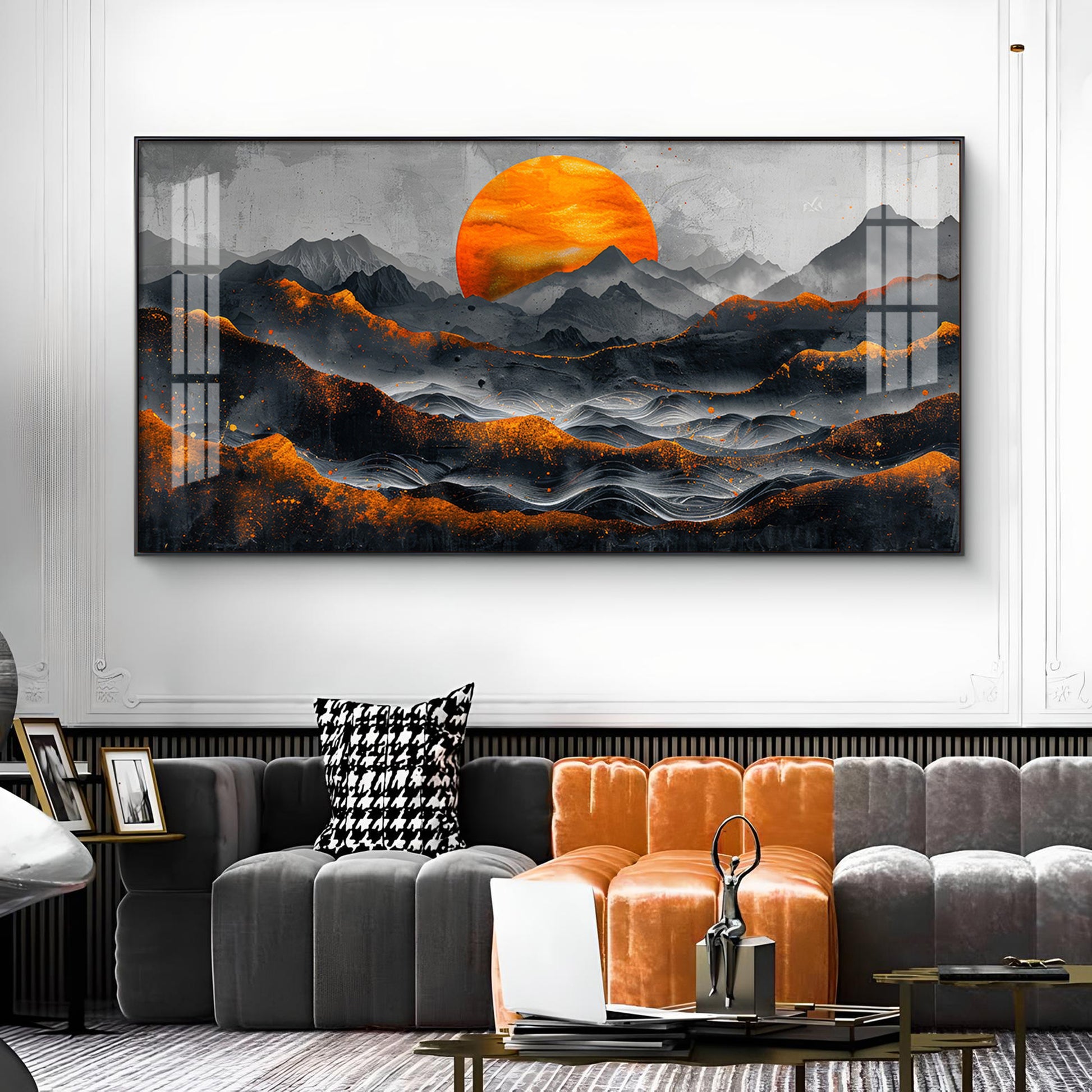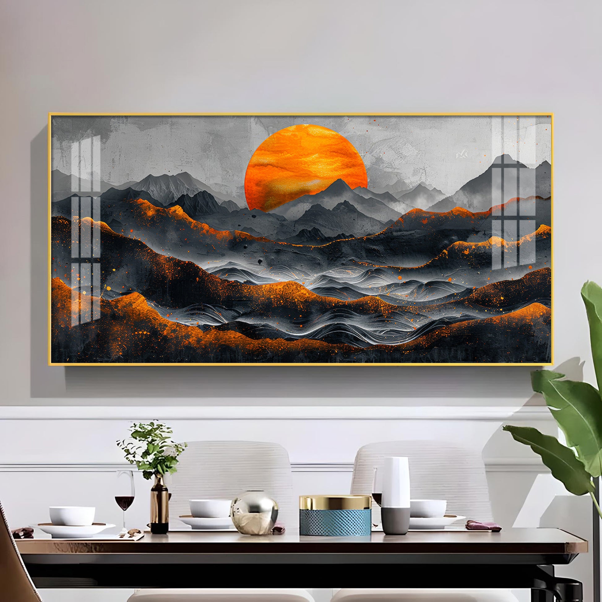 Sun Rise In Black Mountain Glass Finish Horizontal Wall Art
