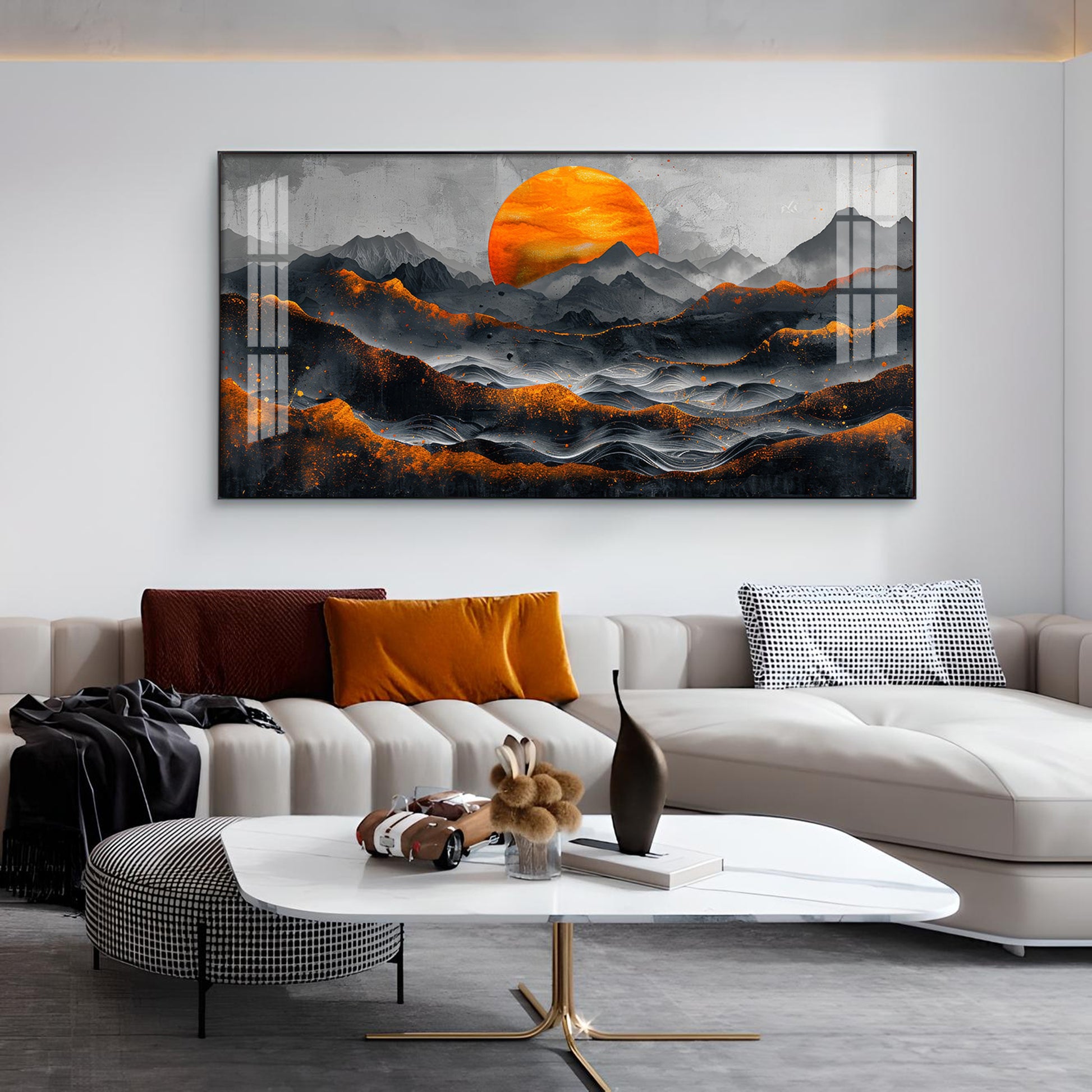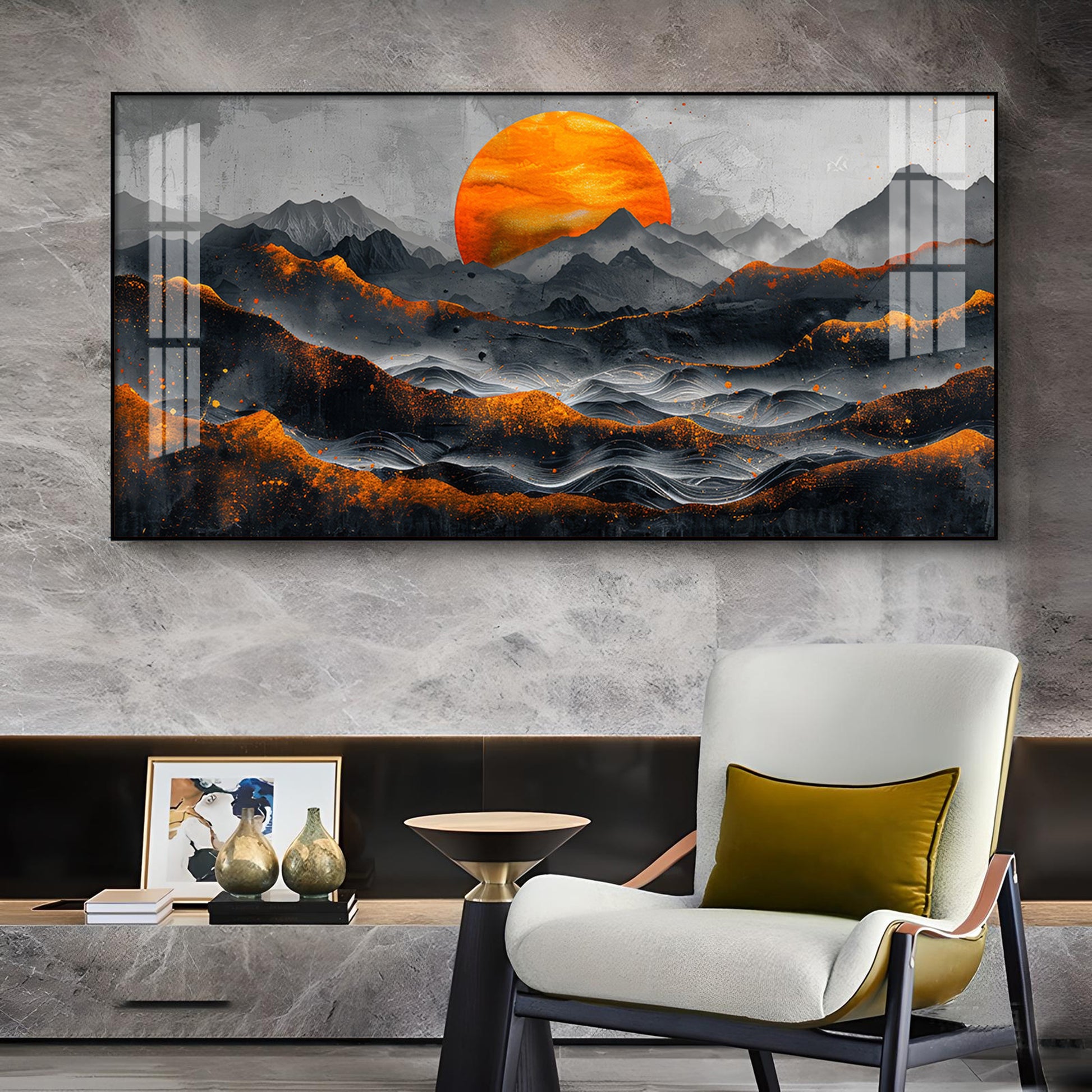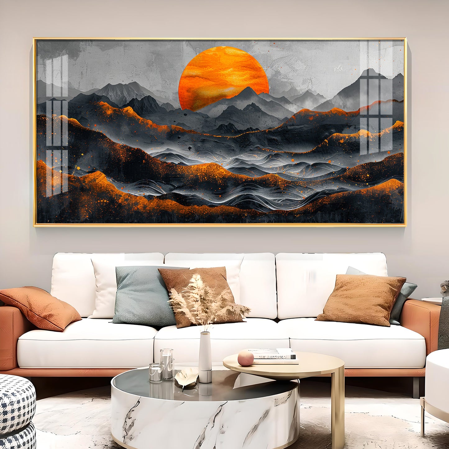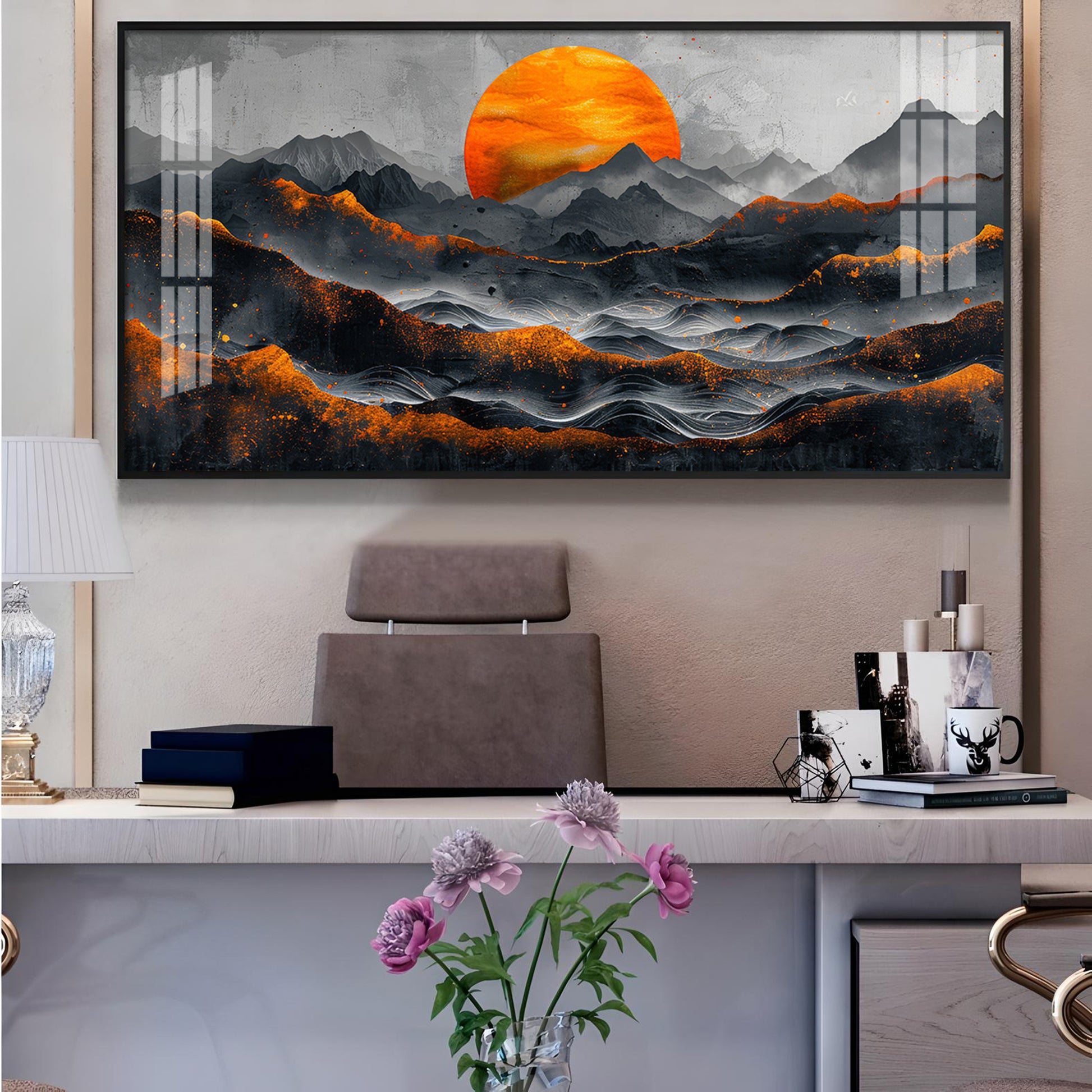 Sun Rise In Black Mountain Glass Finish Horizontal Wall Art