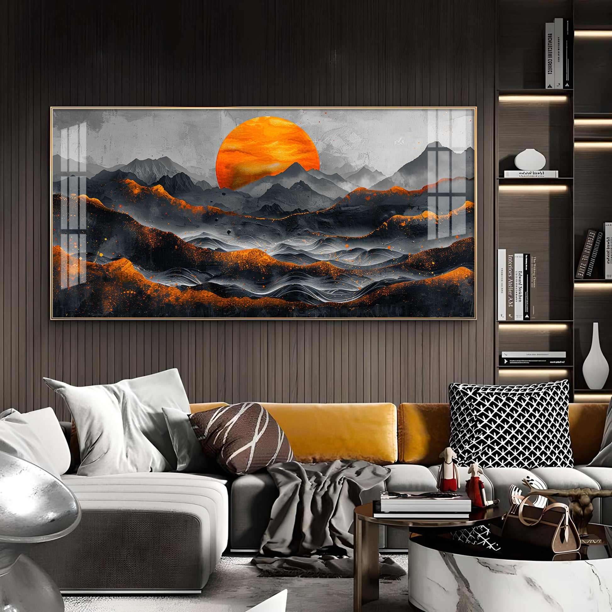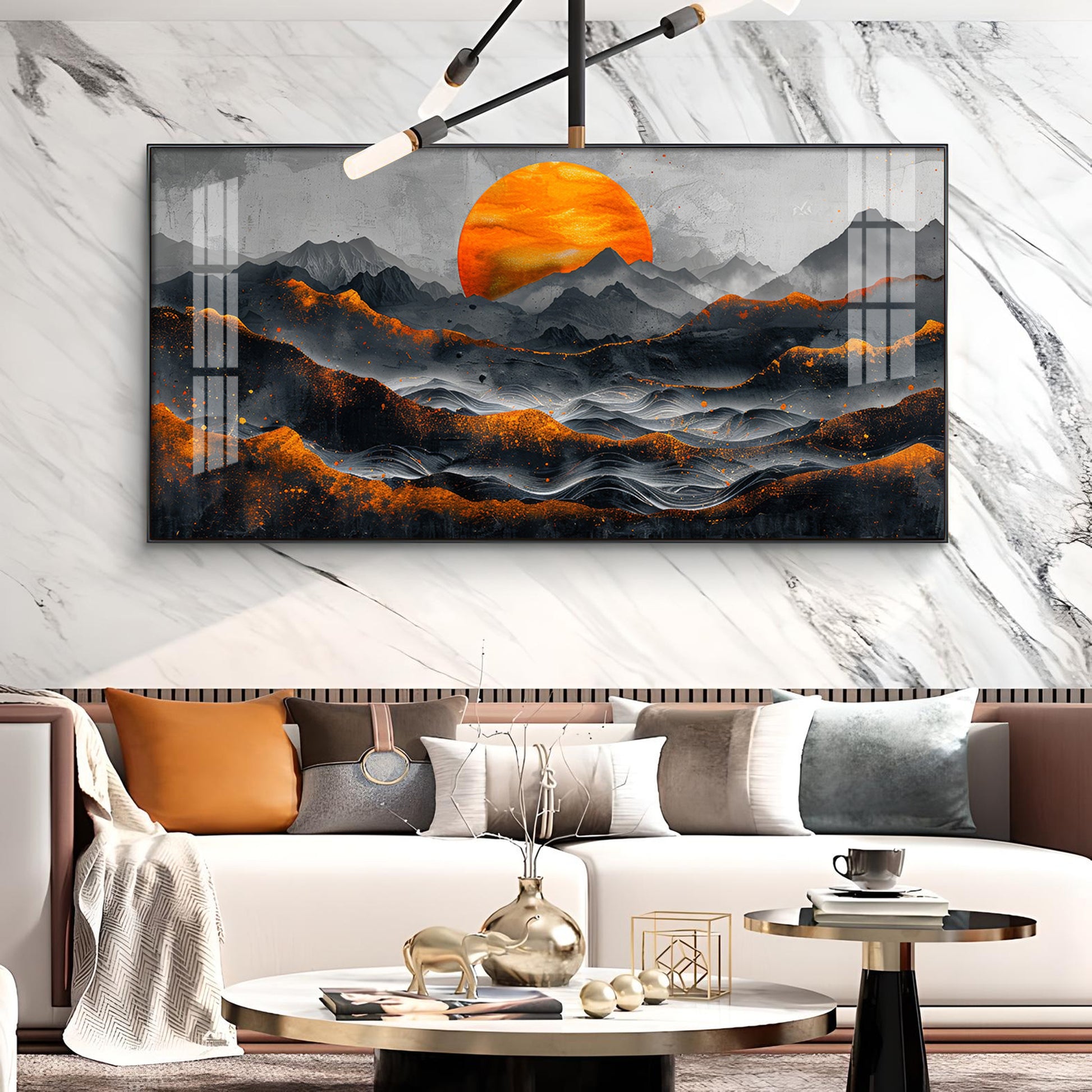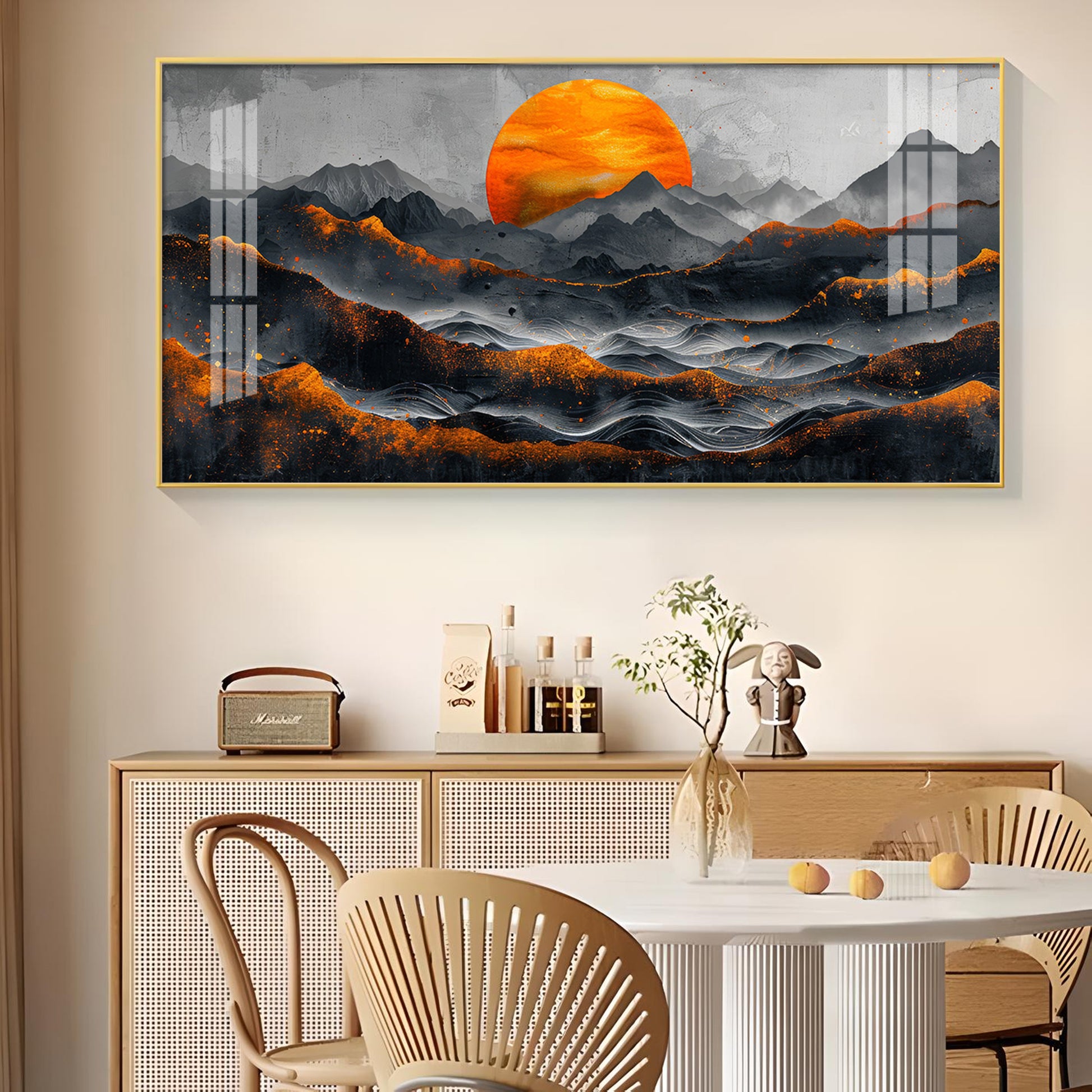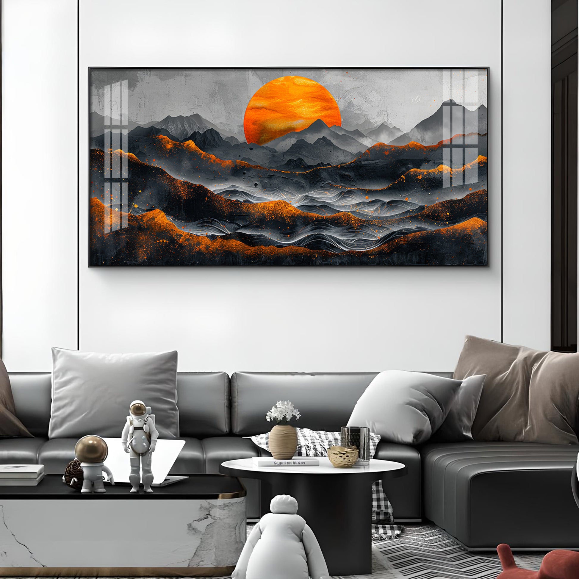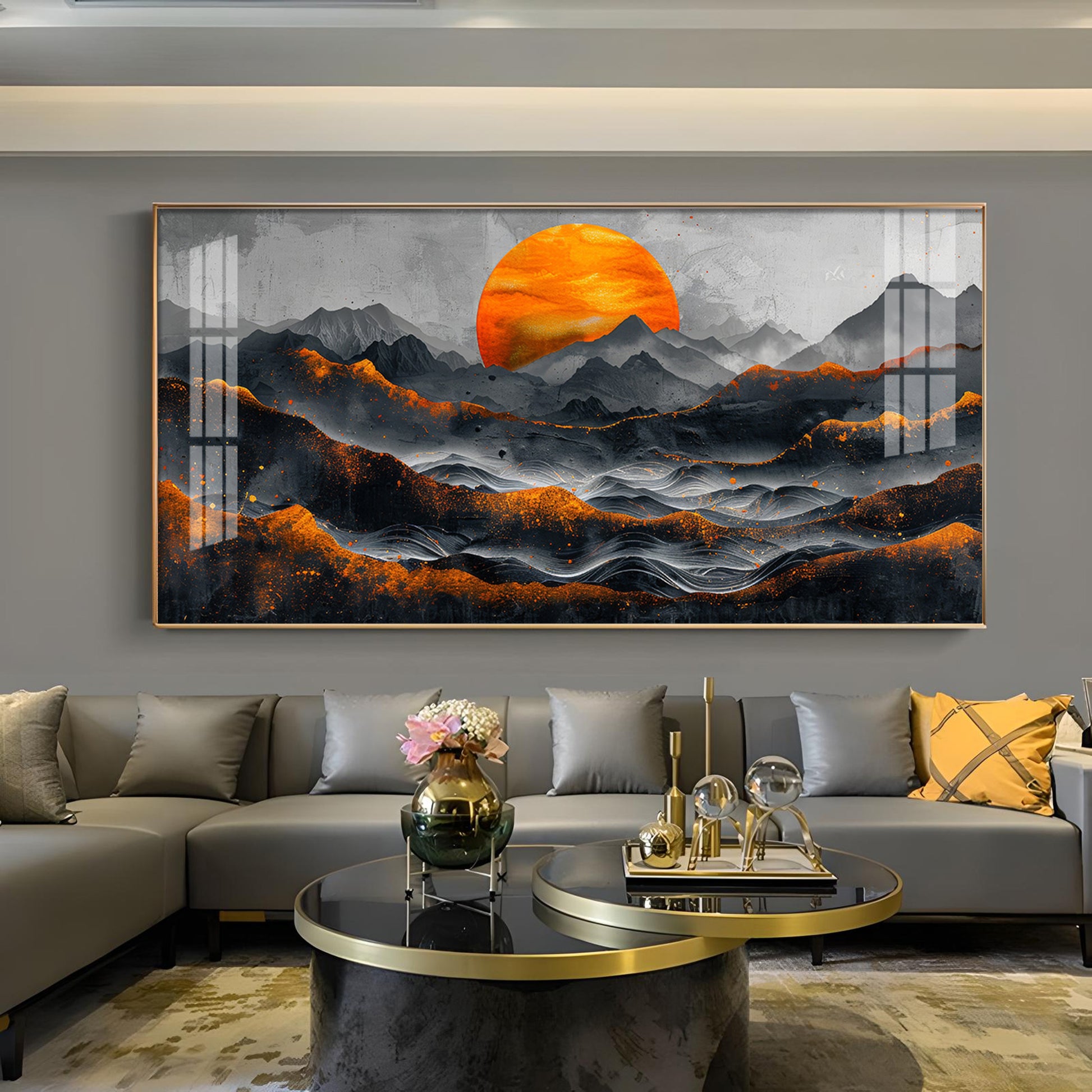 Sun Rise In Black Mountain Glass Finish Horizontal Wall Art