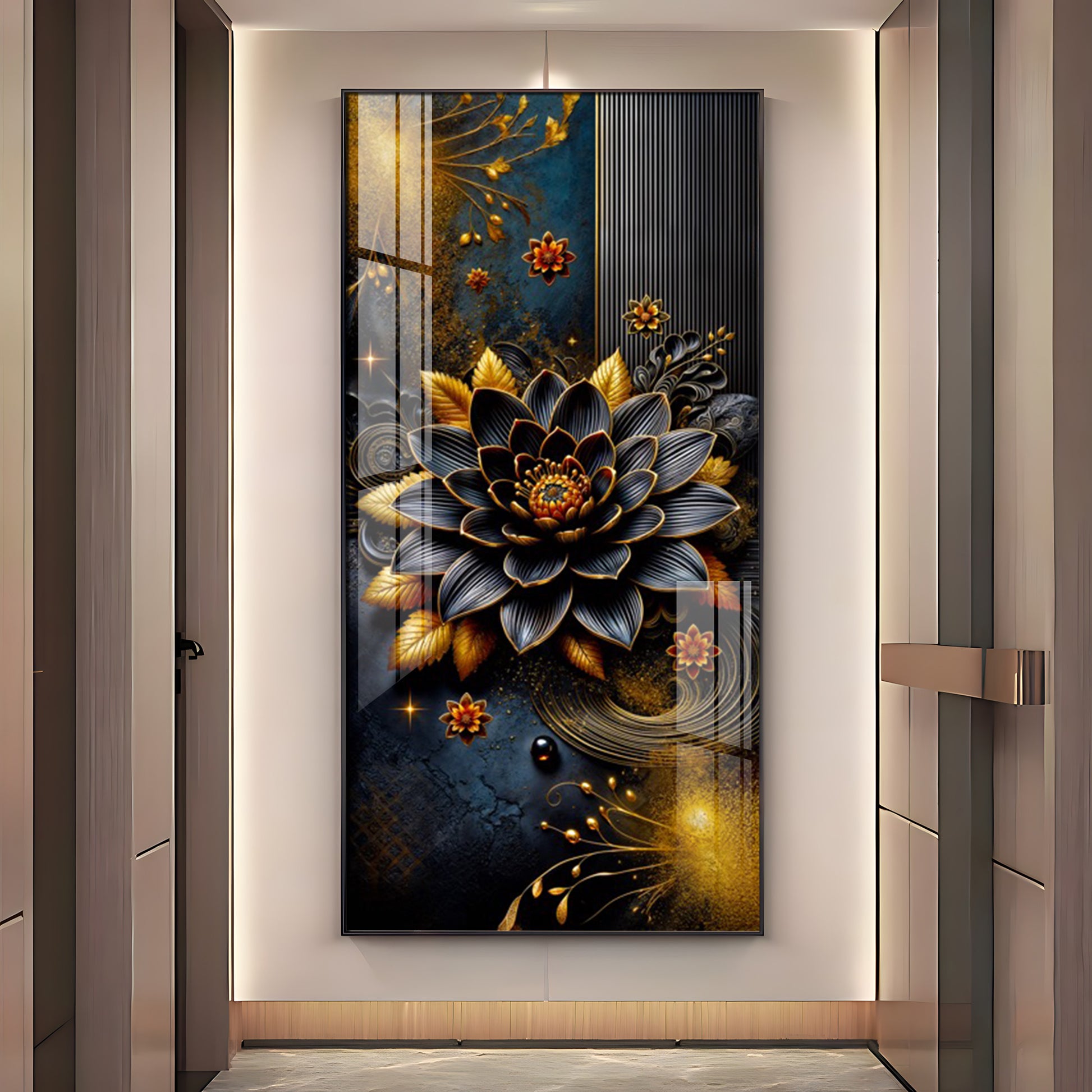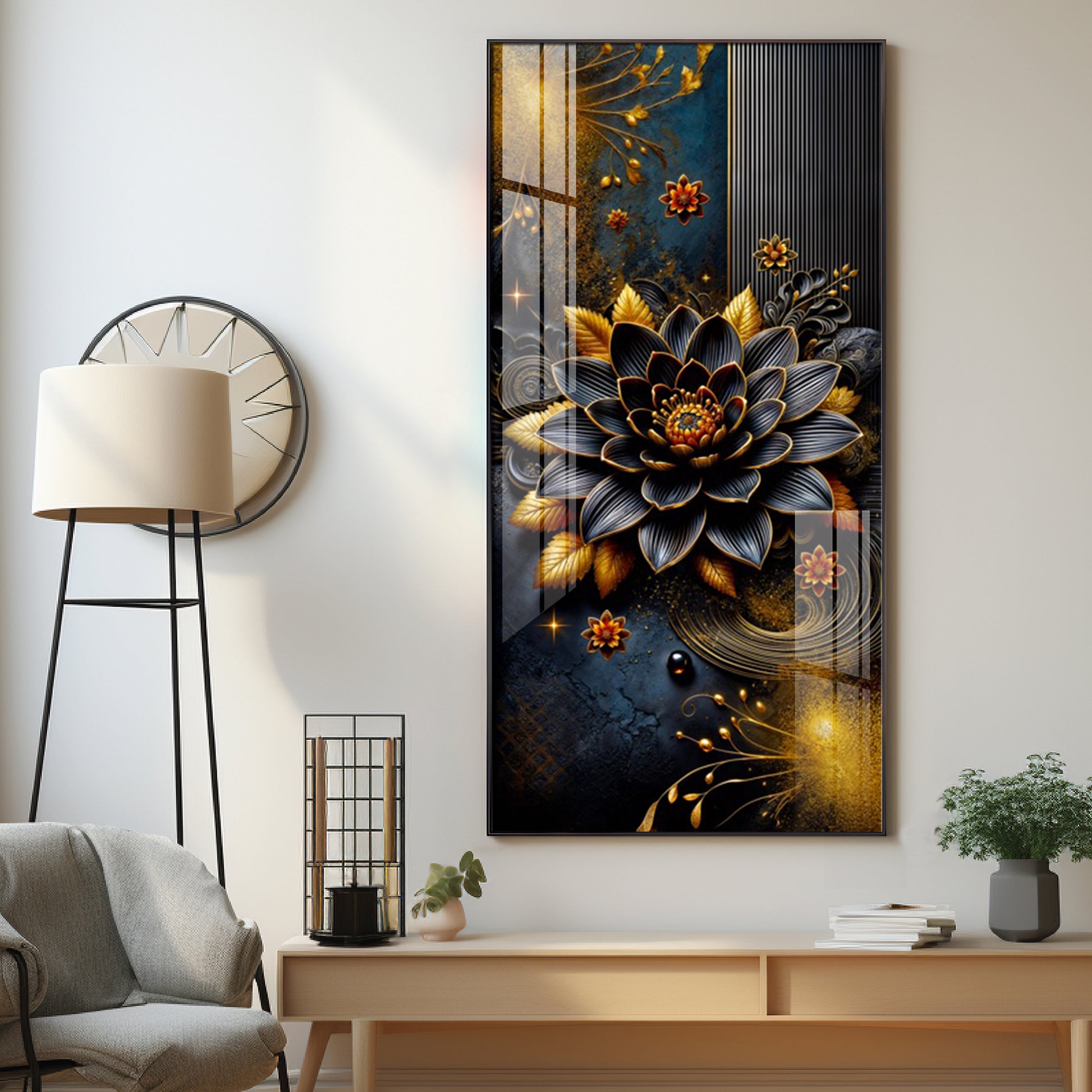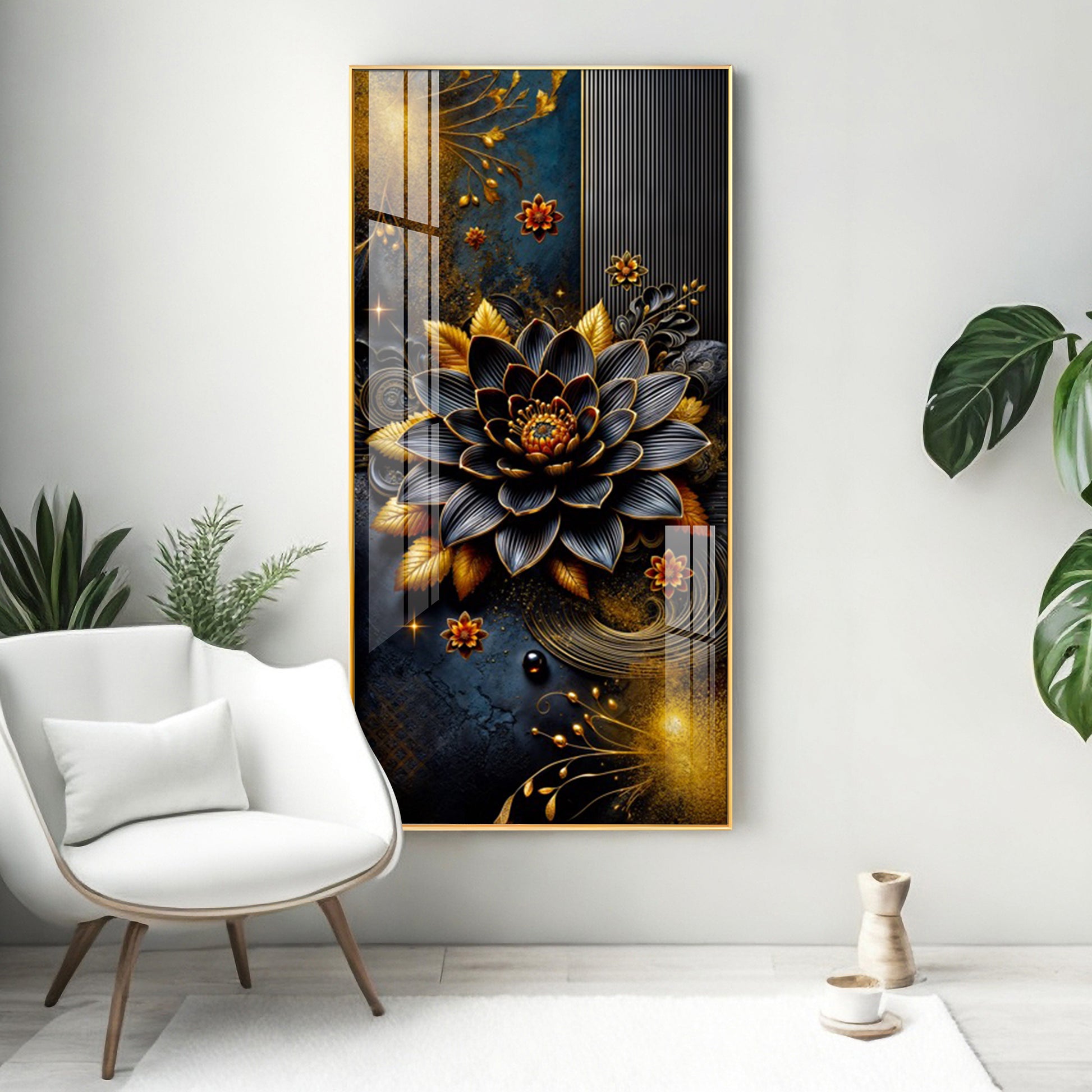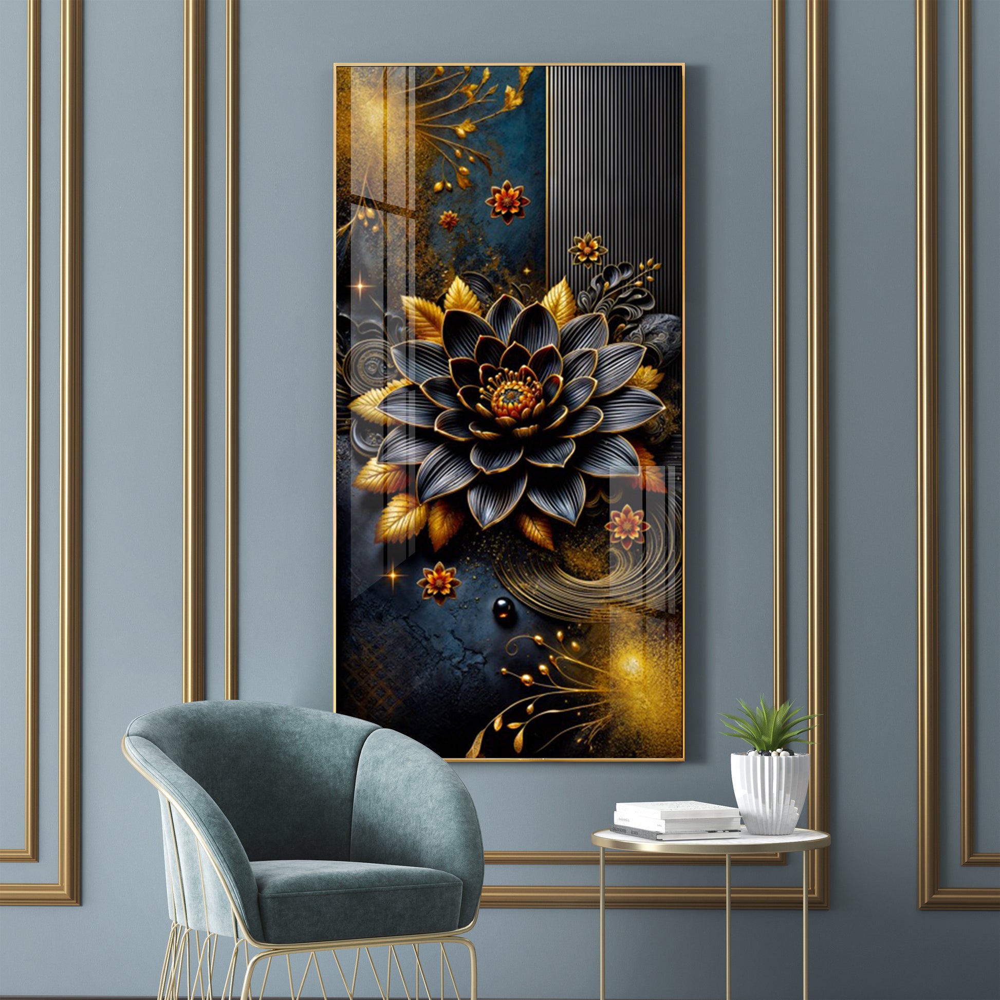 Surreal Black Flower Glass Finish Vertical Wall Art