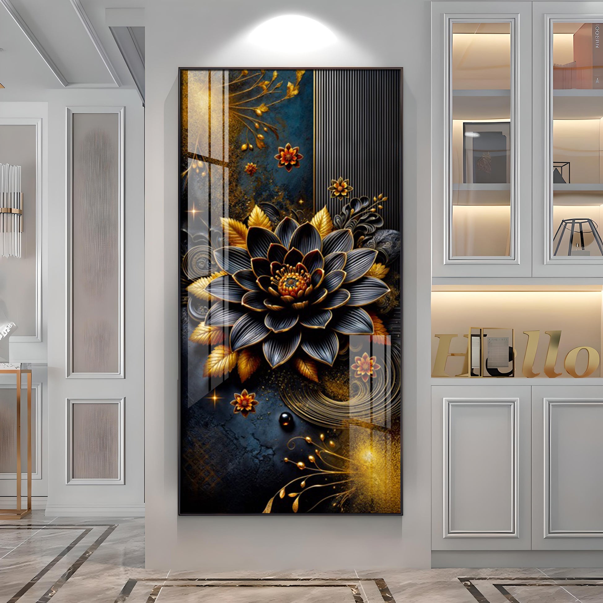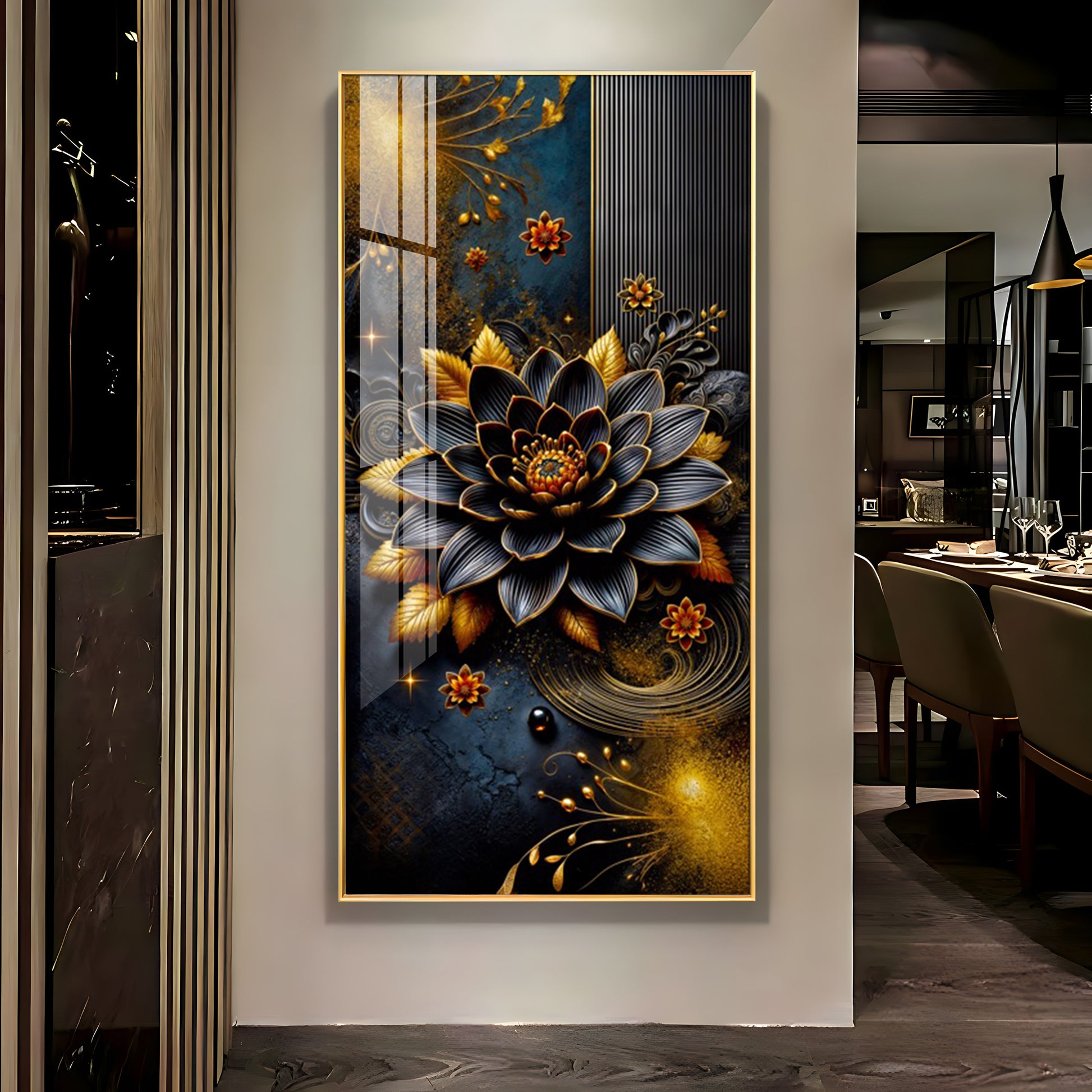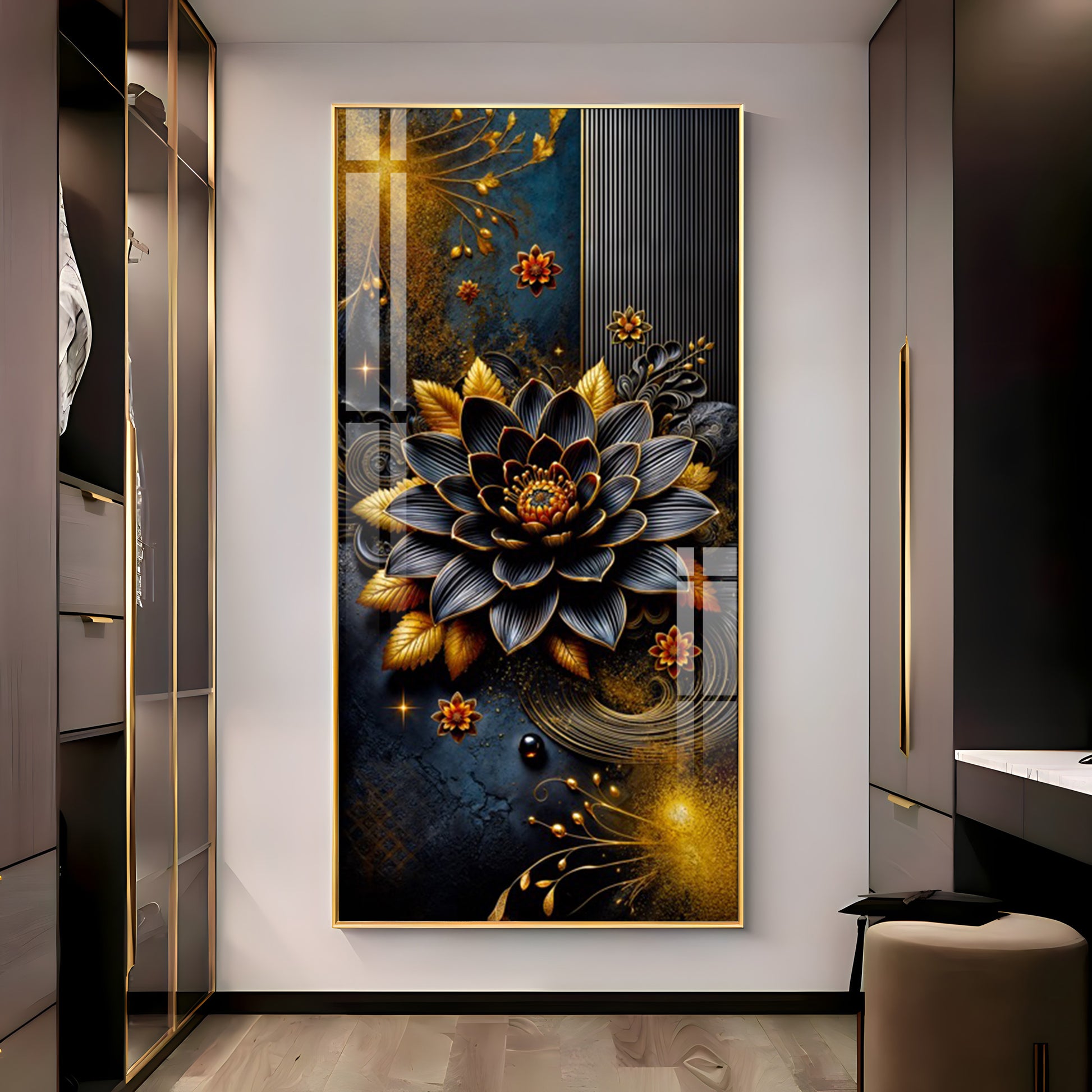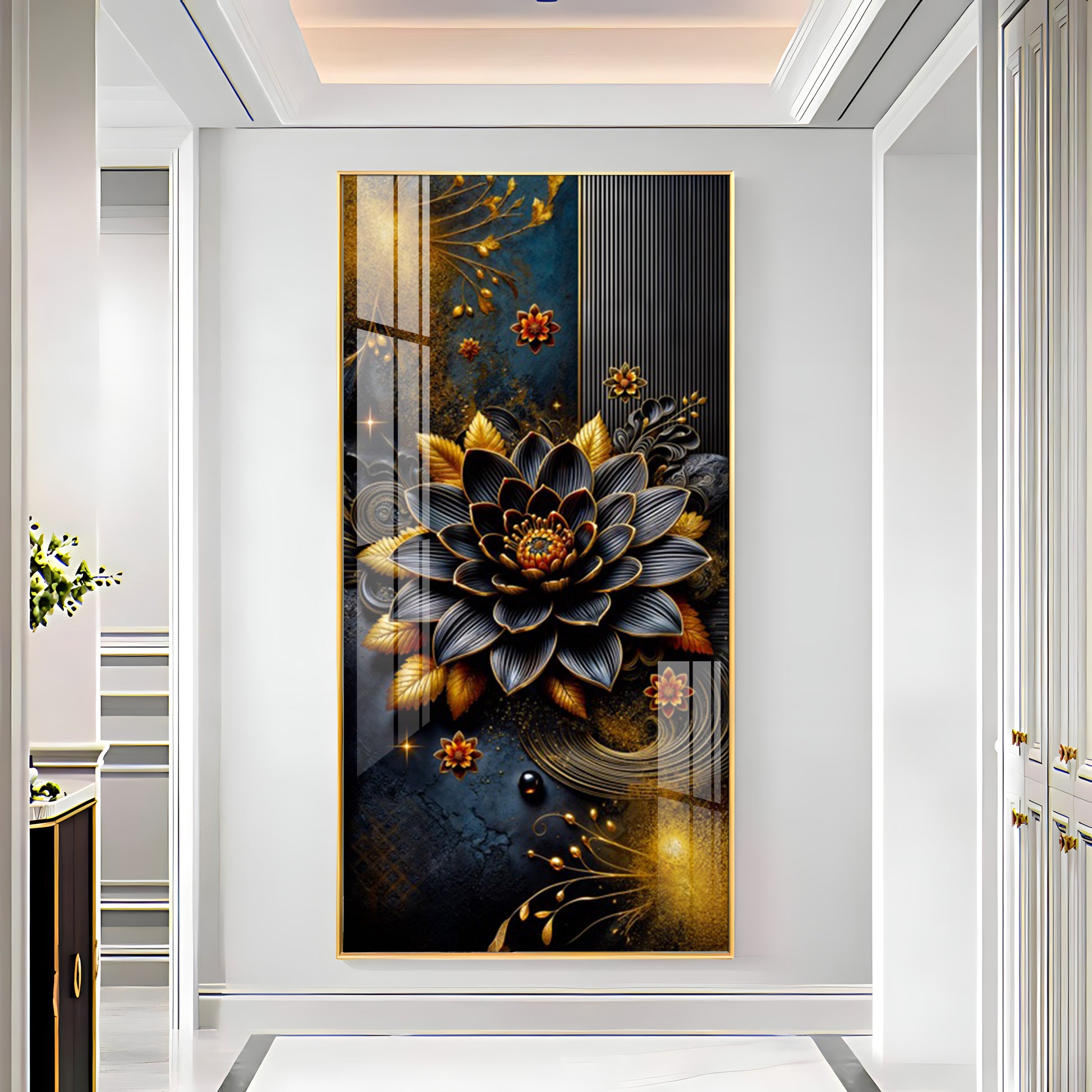 Surreal Black Flower Glass Finish Vertical Wall Art