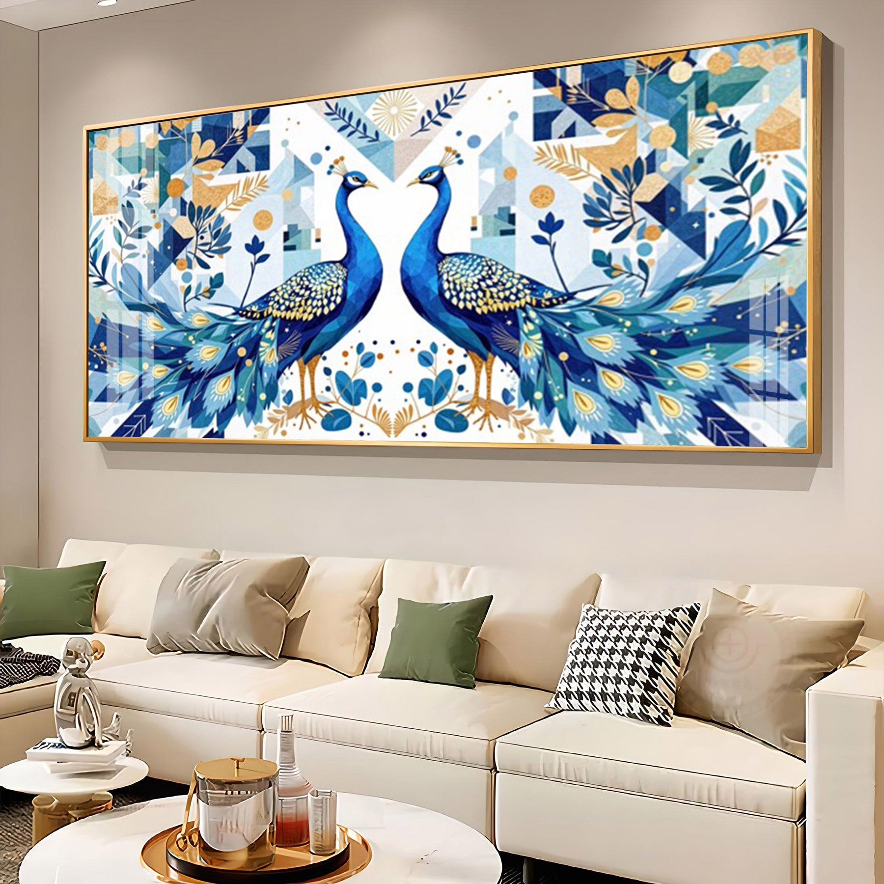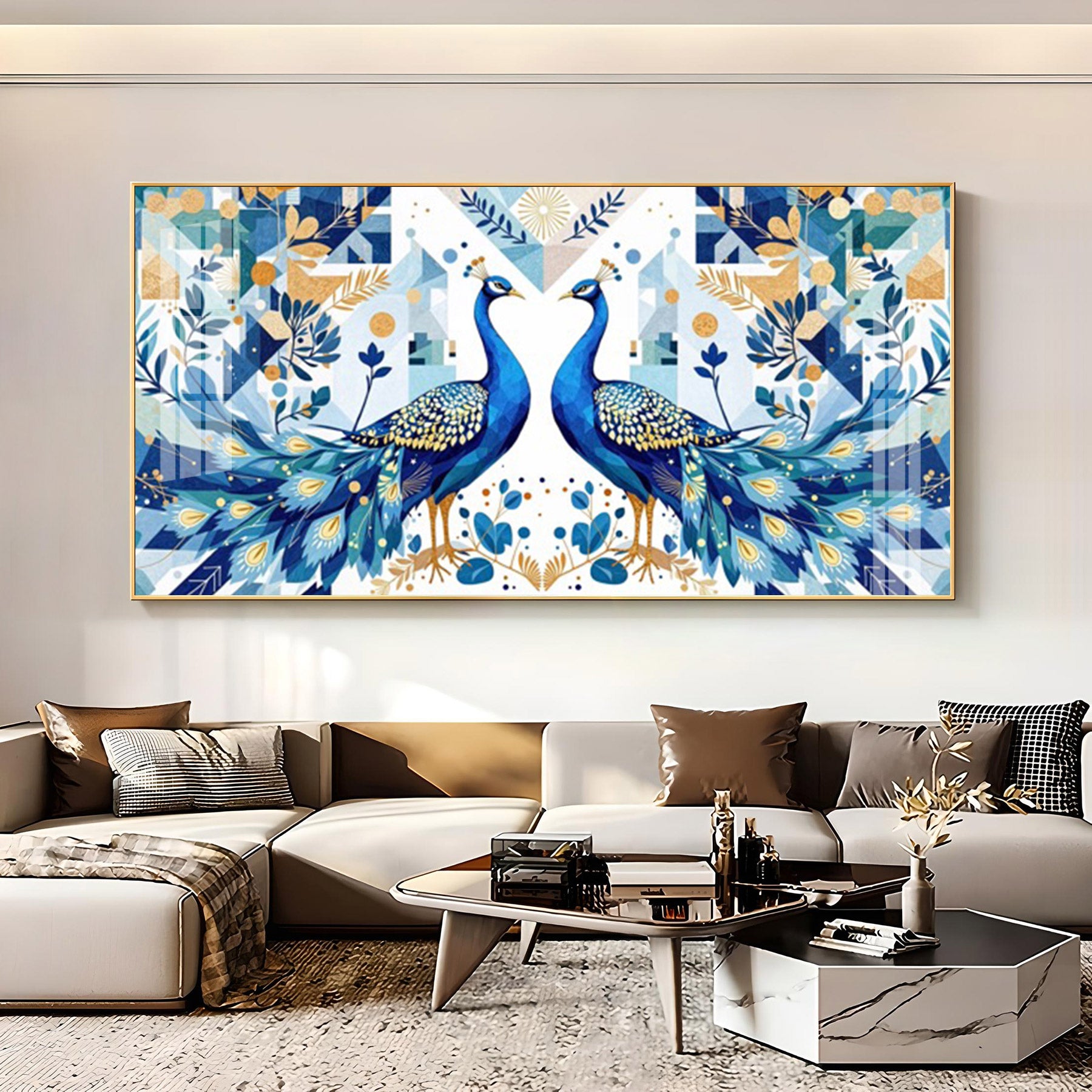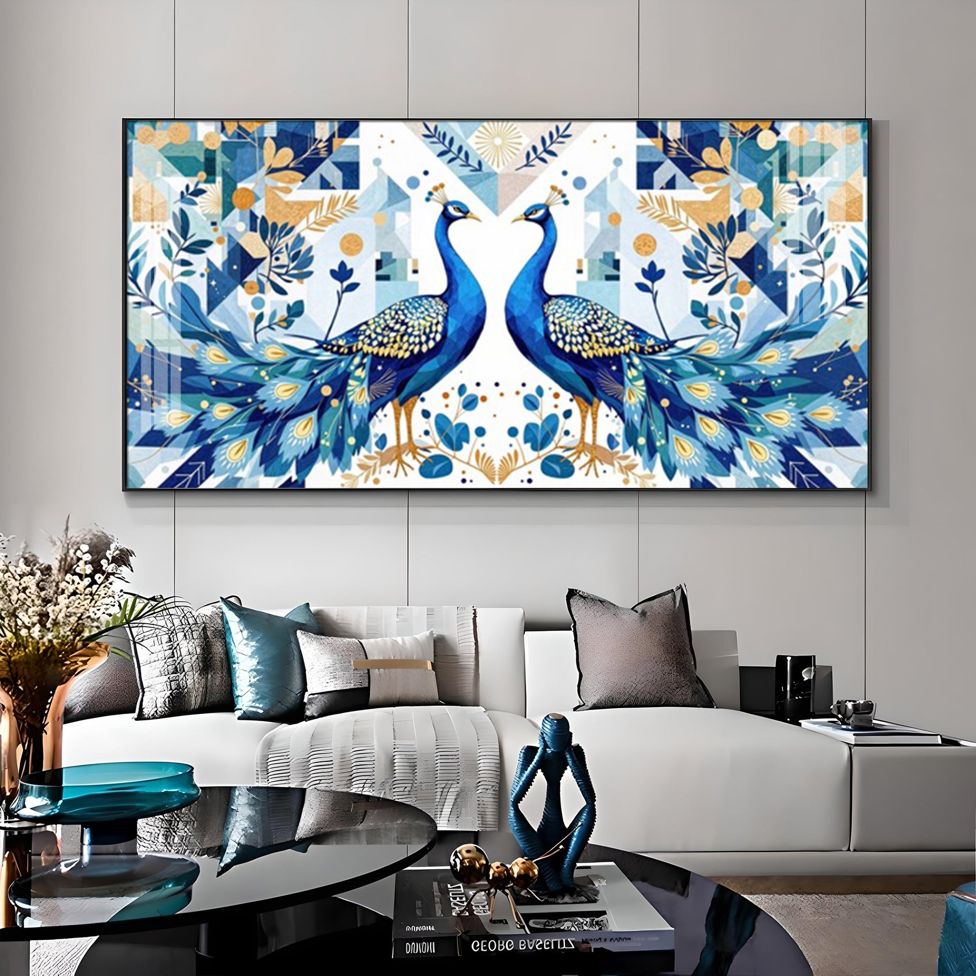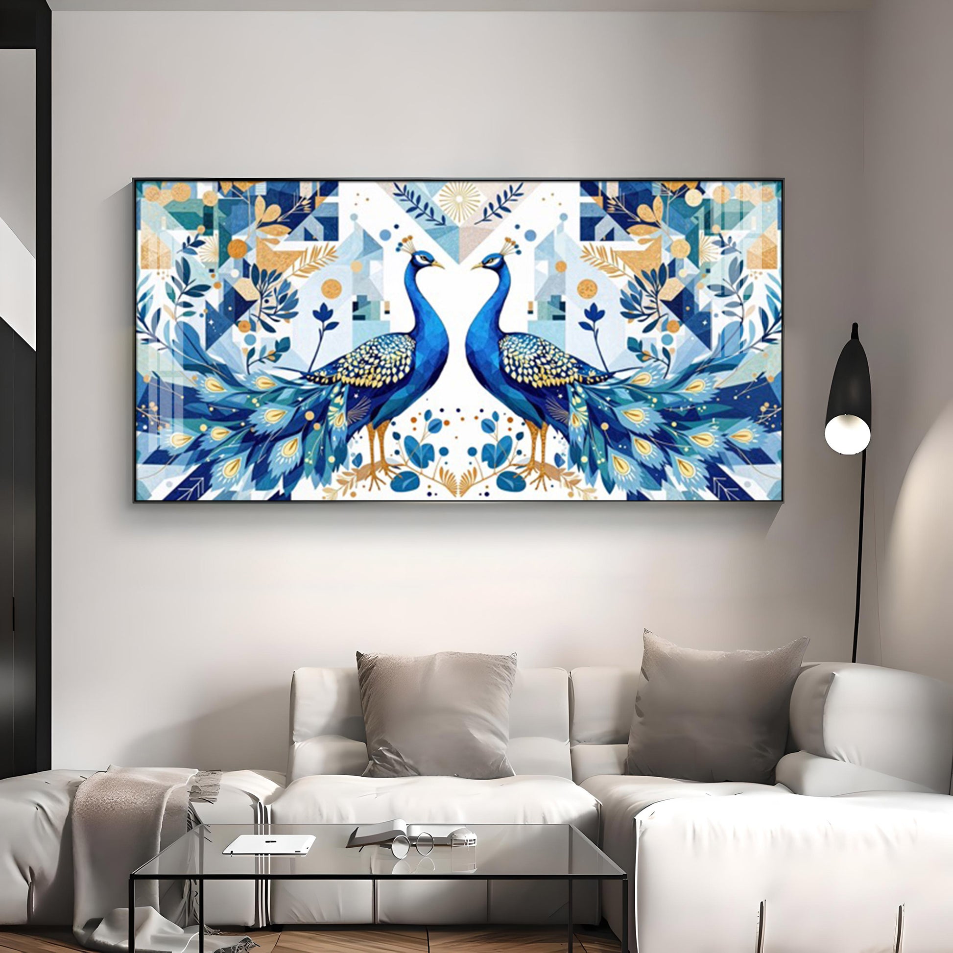 Two Peacock Looking Each Other Glass Finish Horizontal Wall Art