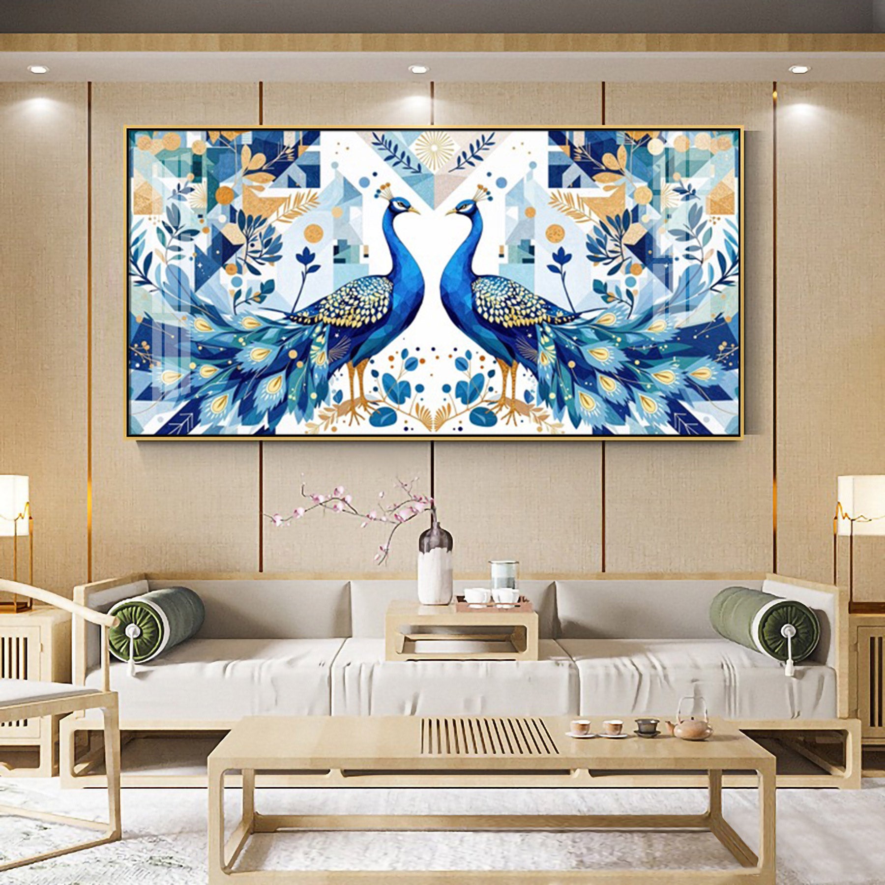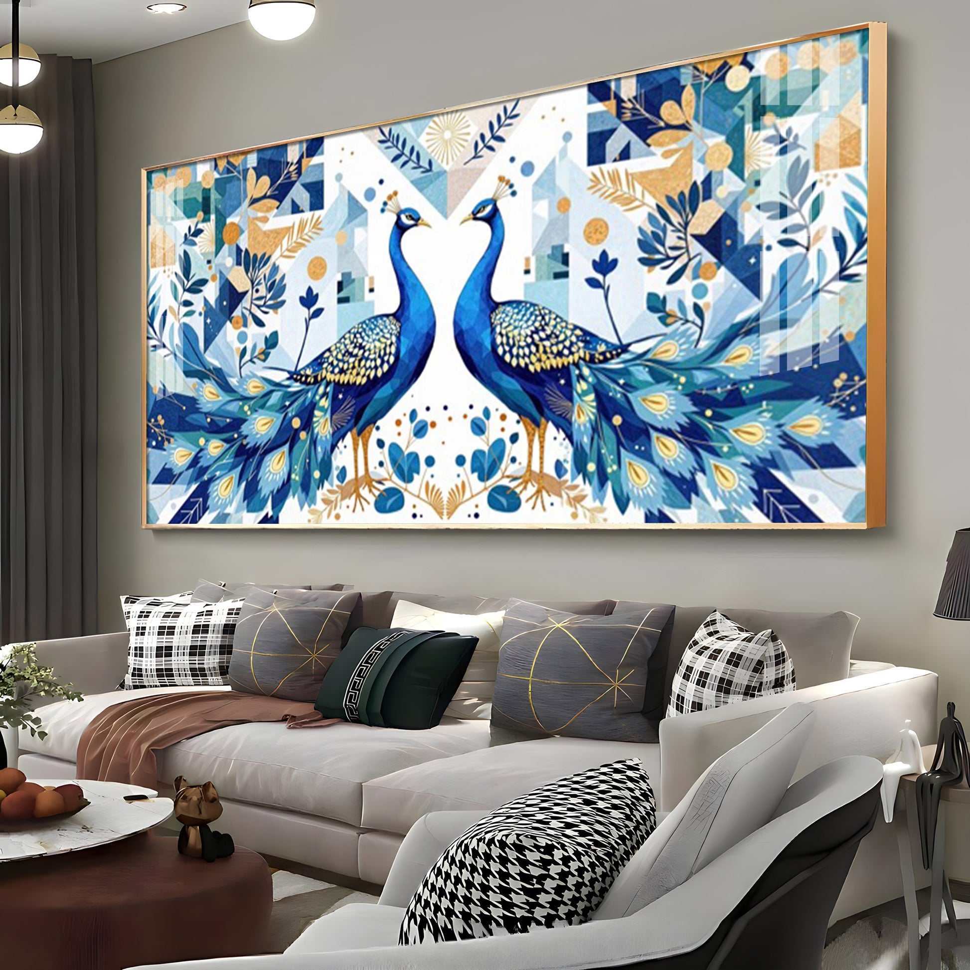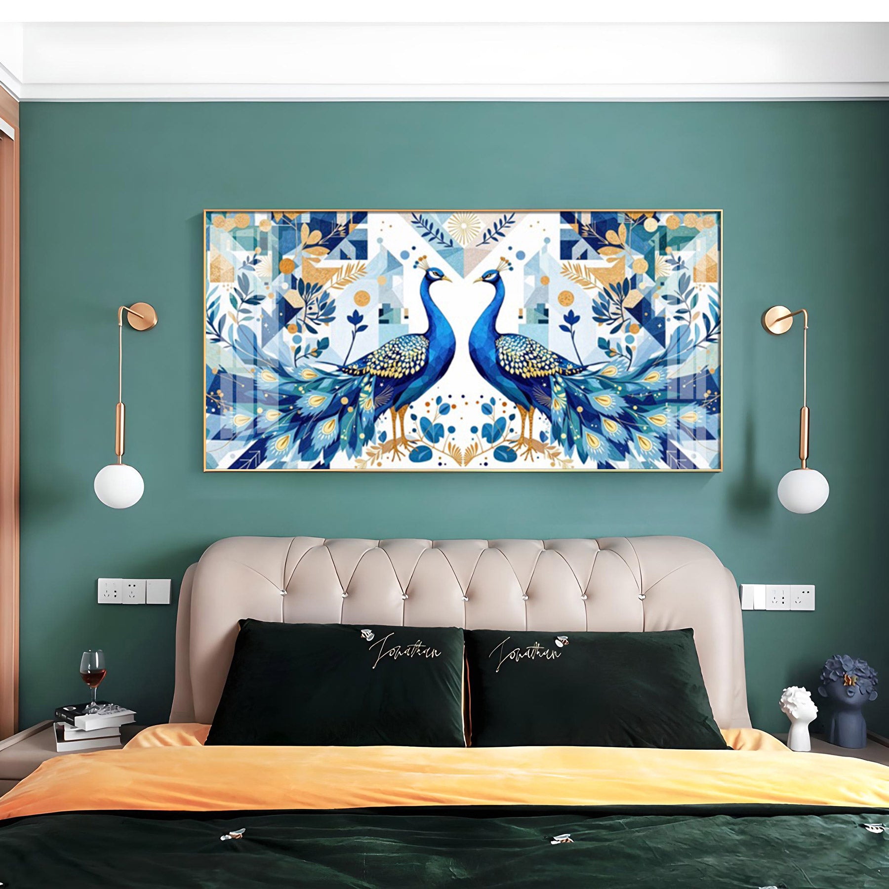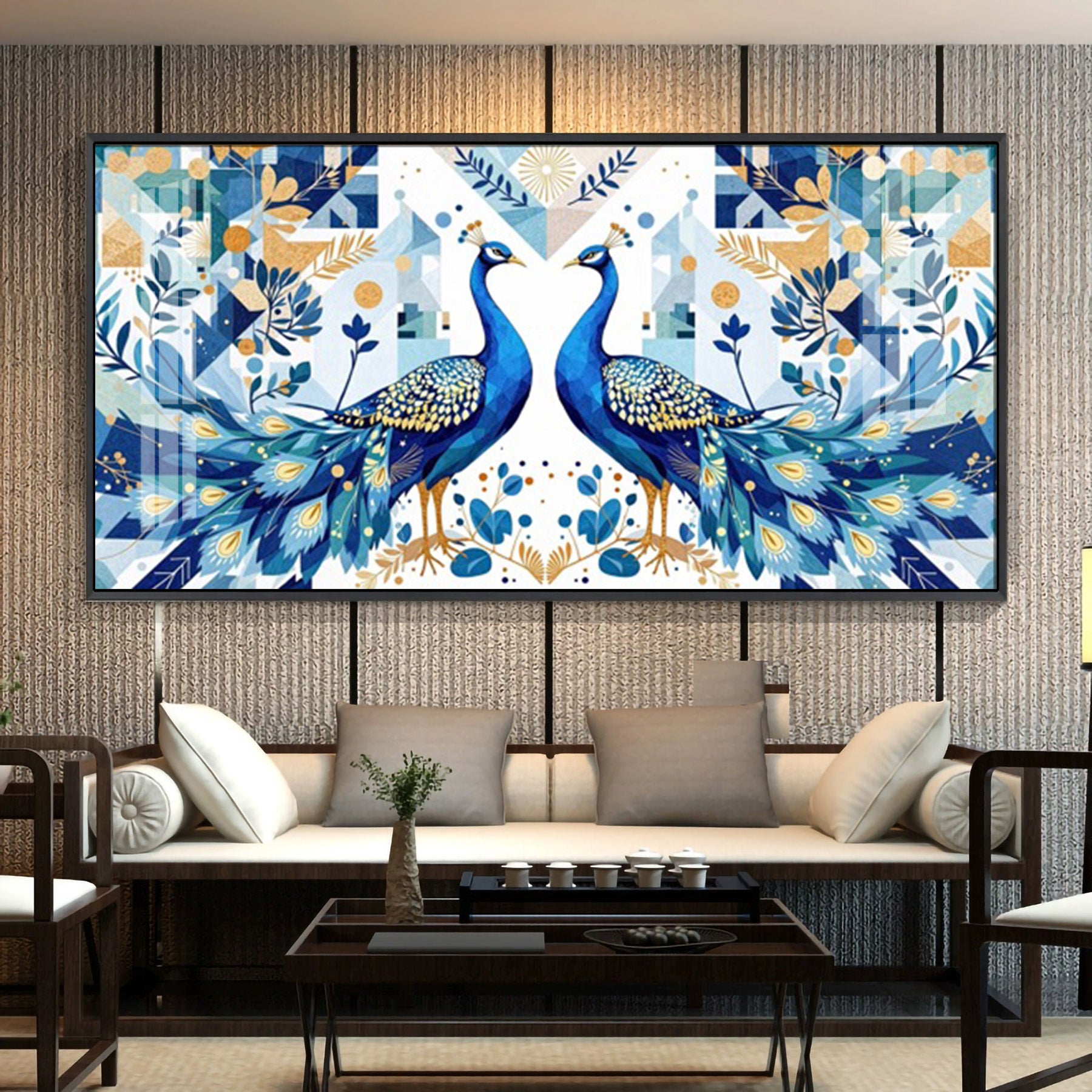 Two Peacock Looking Each Other Glass Finish Horizontal Wall Art
